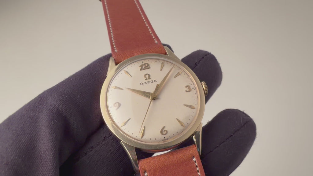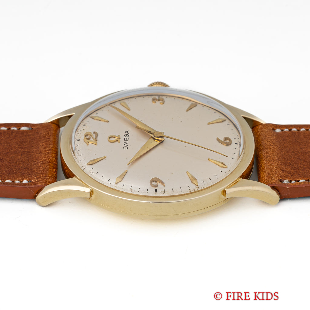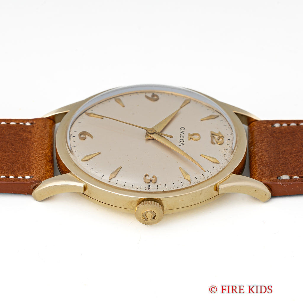 1956年代製 オメガ 14KYGケース 手巻きモデルです。アイボリーの文字盤はゴールドとの相性が良く、クサビ型のインデックスとアラビア数字の組み合わせのデザインは1950年代を象徴するような顔つきです。ダイヤルには経年変化がありますが、雰囲気を損なう様なものではありません。14KYGケースは大きなダメージはなく、ラウンドケースに少し段差のあるラグが高級感があります。ムーブメントはCal.420を搭載、巻き上げと針回し共にスムーズです。ベルトはファイアーキッズオリジナル革ベルトが付いています。
