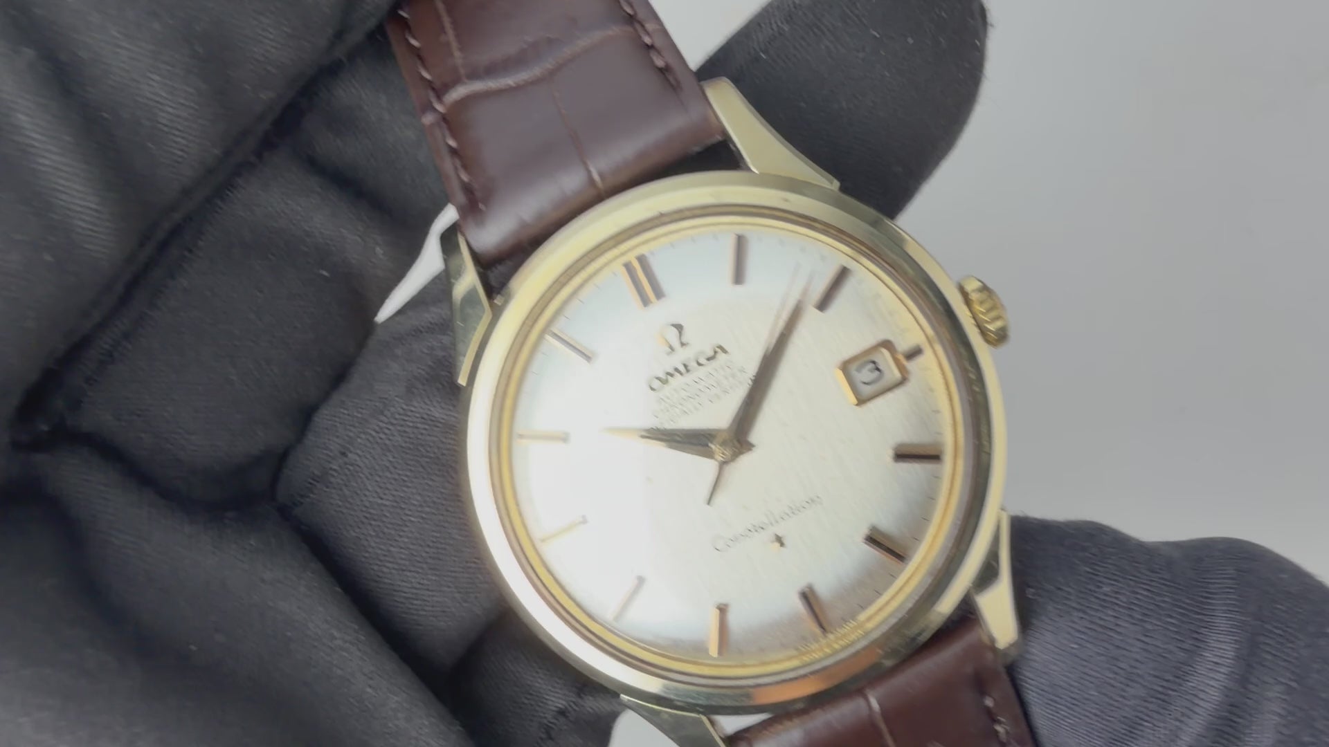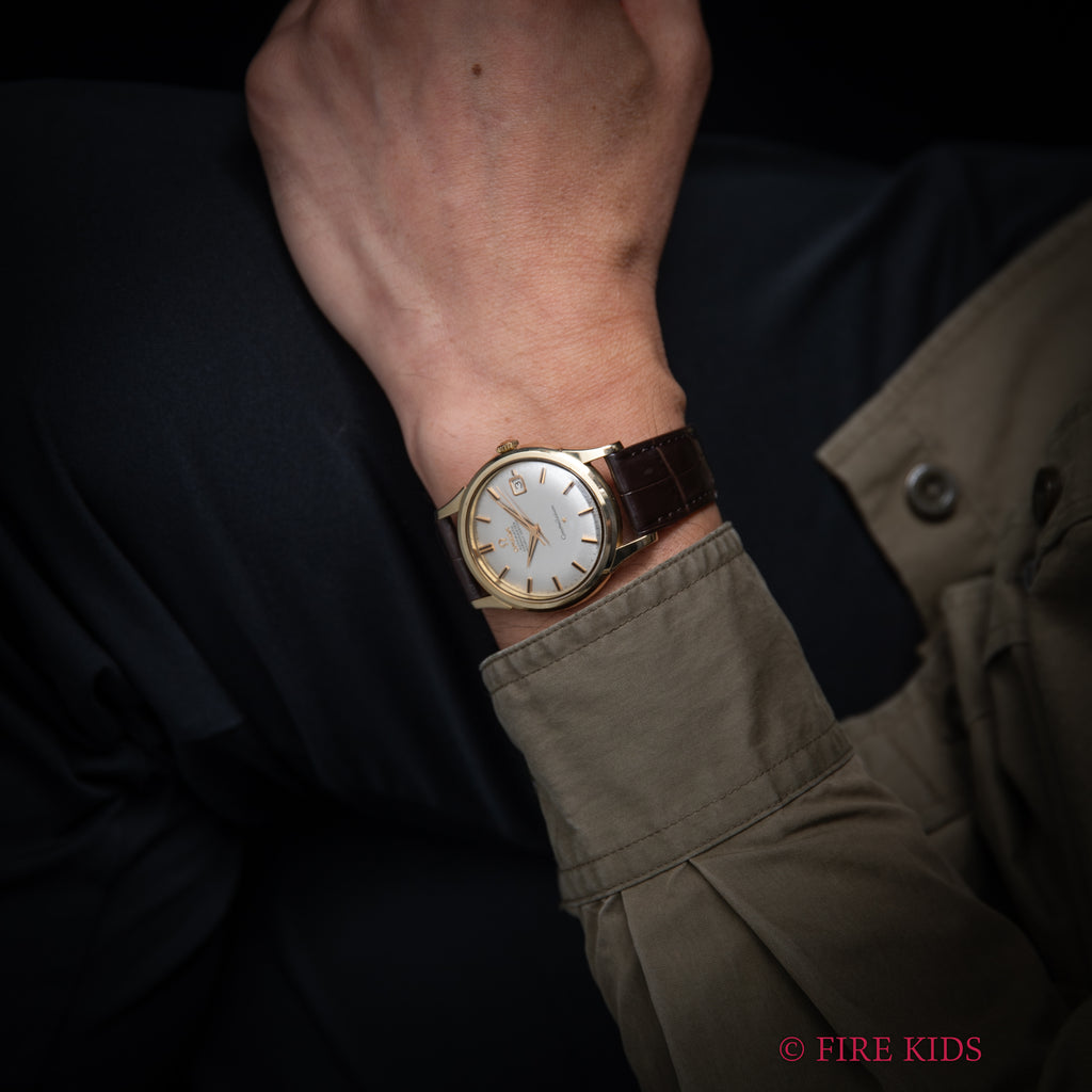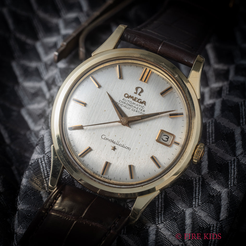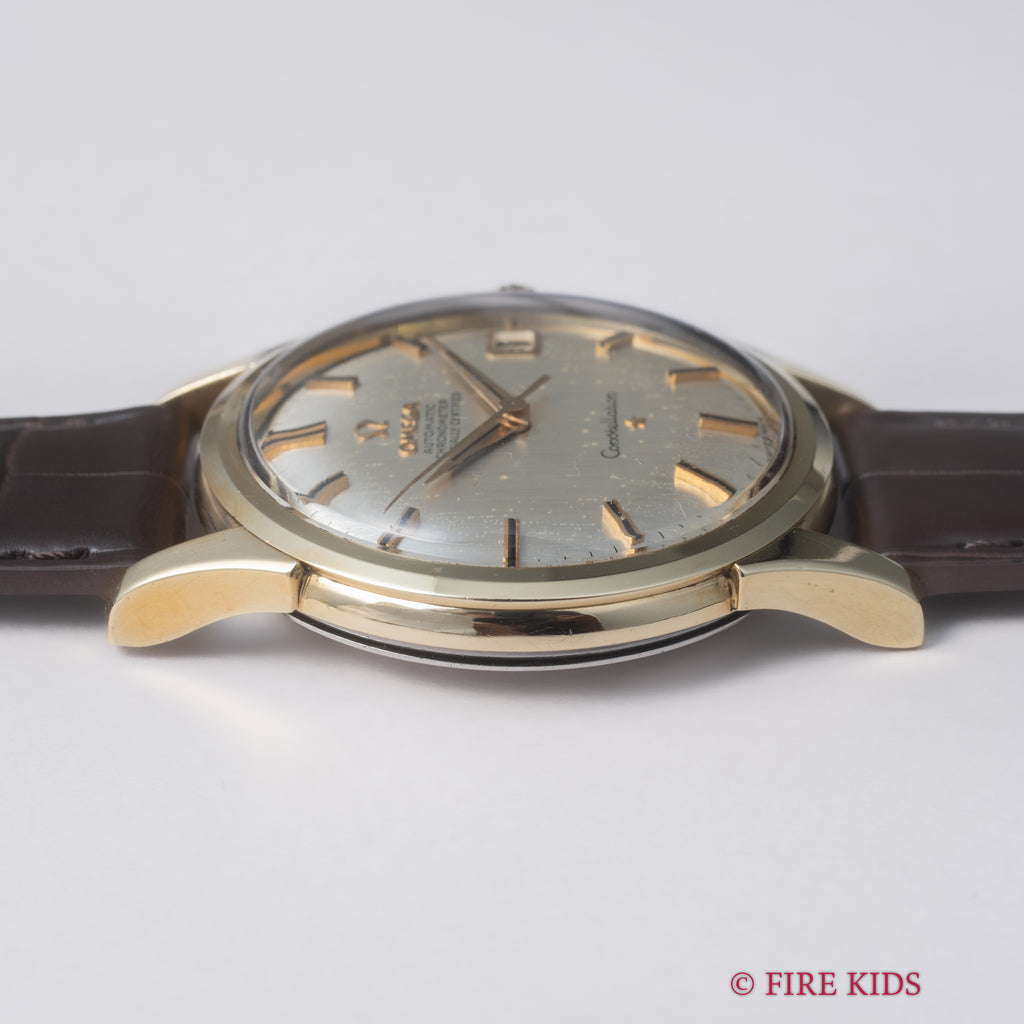 オメガ コンステレーション 1963年製 トップゴールドケース 自動巻クロノメーター Cal.561の入荷になります。オメガの最高級ライン「コンステレーション」、クロノメーターを搭載したコンステレーションは当時のオメガのフラッグシップモデルです。縦にヘアライン仕上げの入ったダイヤルは肉眼で綺麗なコンディションを維持しています。大振りな37mm径のトップゴールドケースは小傷はありますが特筆すべきダメージはありません。ムーブメントはクロノメーターのCal.561を搭載し、手巻きや針回しはスムーズです。ベルトはファイアーキッズオリジナル革ベルト、イタリアンレザーのブッテーロ(裏面ラバー)が取り付けられています。