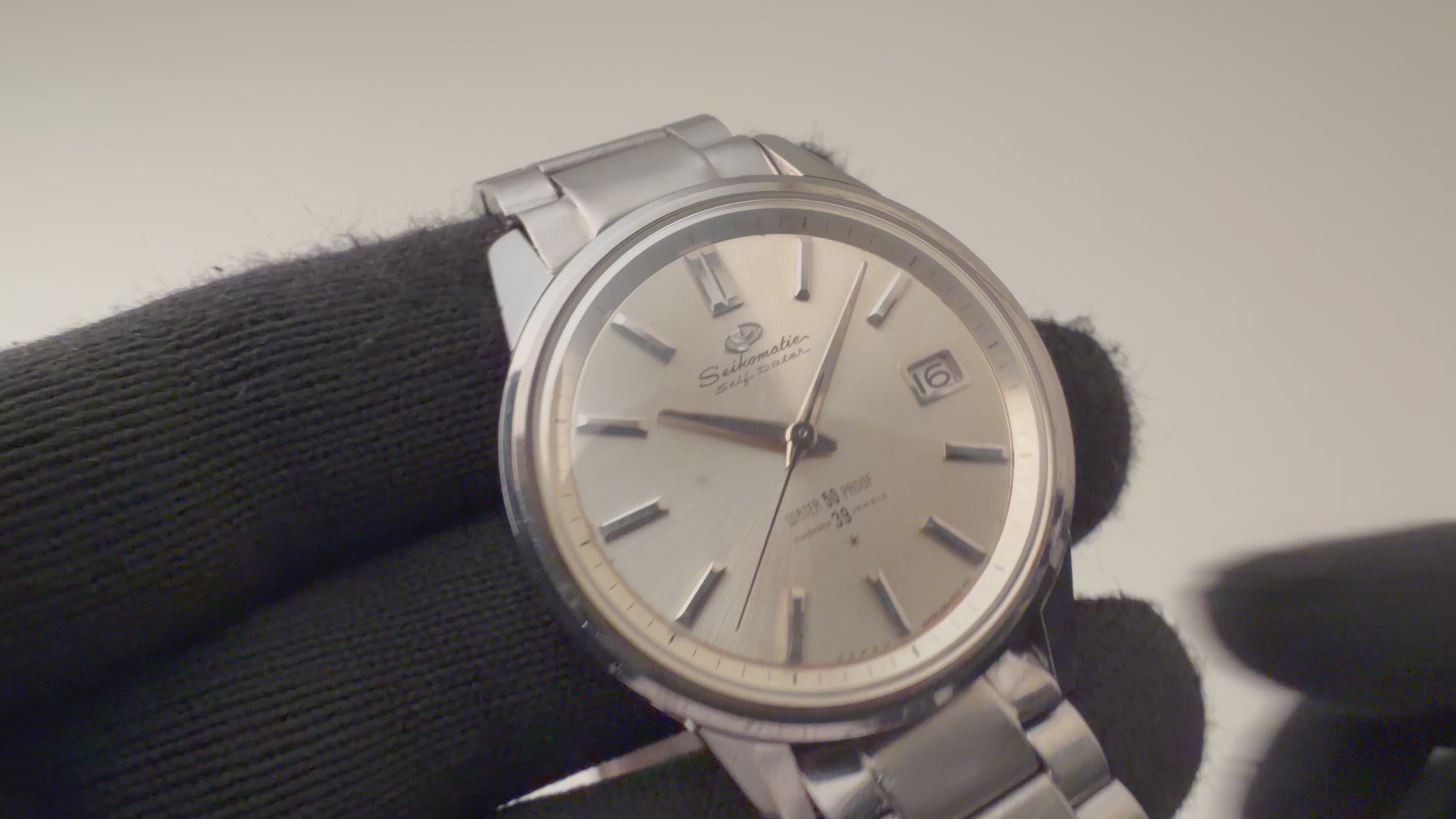 セイコー マチックセルフデーター 39石 1963年製 Ref.J13060 ステンレスブレスの入荷になります。39石の高級仕様で文字盤には若干のダメージがありますが、概ね良好なコンディションです。ケースは全体に小キズがありますが、磨きを感じない自然な状態です。4時位置にリューズを配置したスッキリしたデザインで手巻きは出来ませんが巻き上げ効率は良い機械を搭載しています。ベルトは当時のステンレスブレスが付いています。