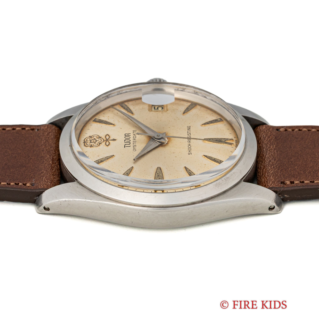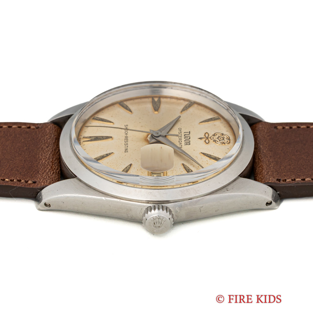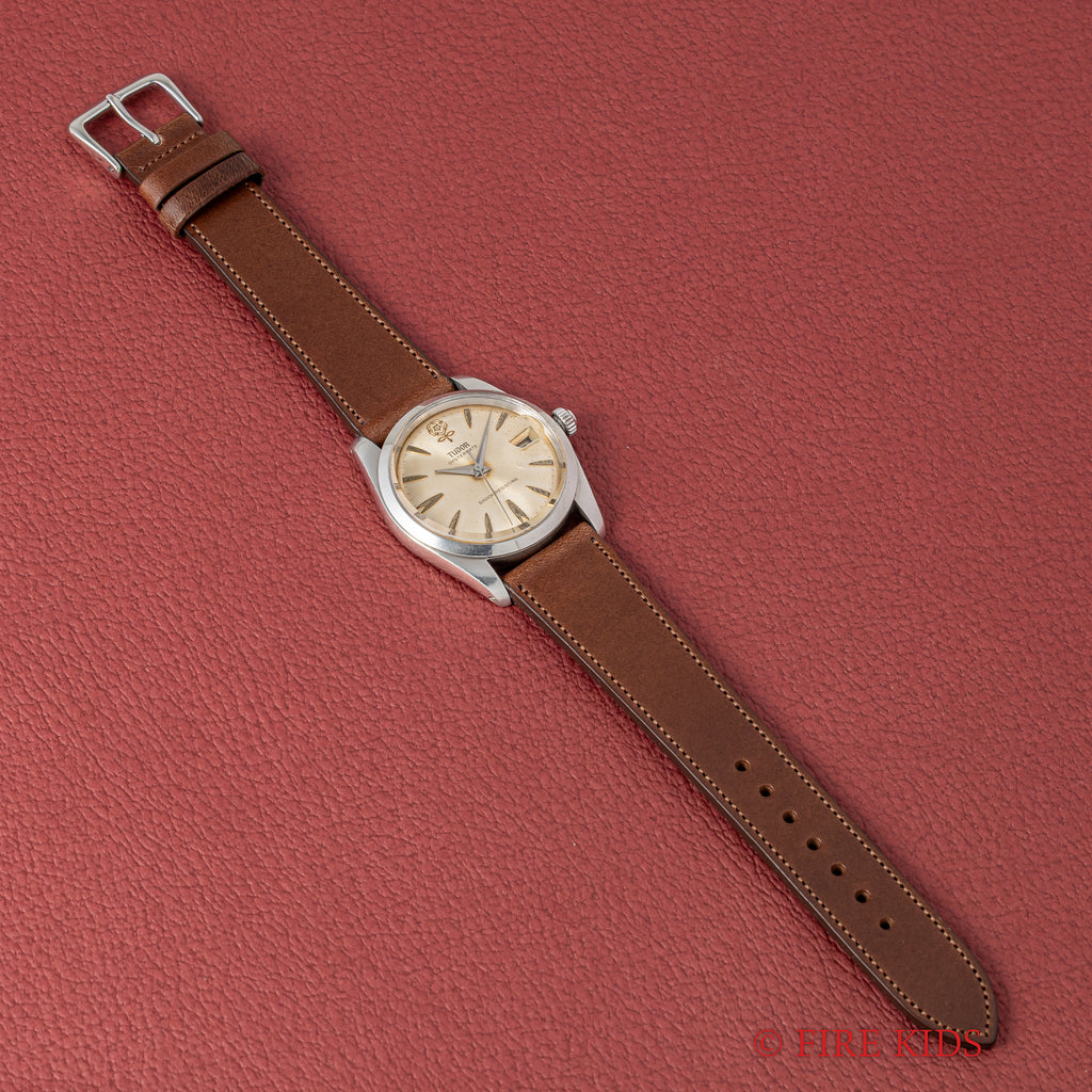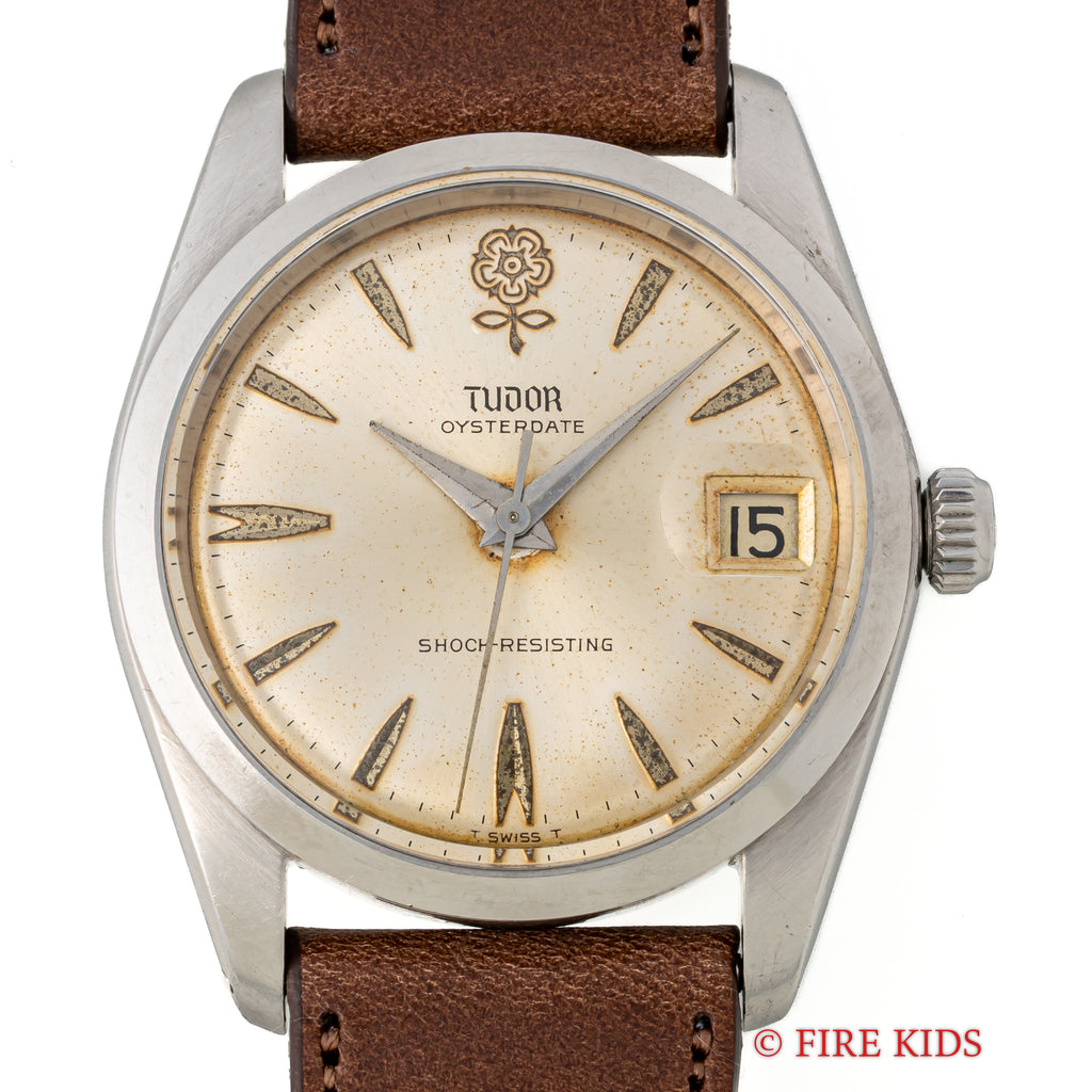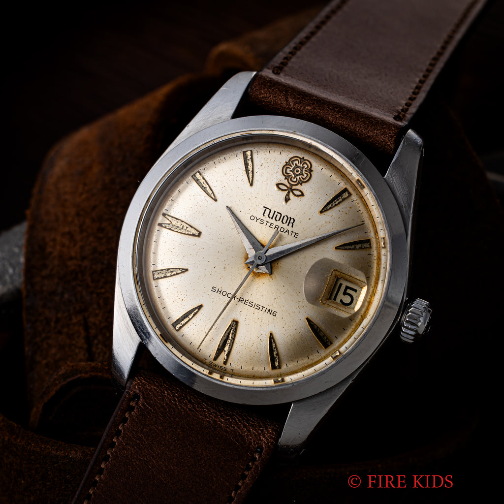 チューダー デカバラ 1965年製 オイスターデイト Ref.7962です。ヴィンテージチューダーの中でも特に人気のデカバラ(ビッグローズ)の文字盤は、全体が経年変化していますが、雰囲気を損なう様なものではなく、ヴィンテージらしい雰囲気です。ケースは全体に若干の磨きを感じますが、大きなダメージはありません。手巻きのムーブメントも巻き上げもスムーズです。ファイアーキッズオリジナルのブッテーロカーフレザーを合わせています。こちらは分解掃除済みです。