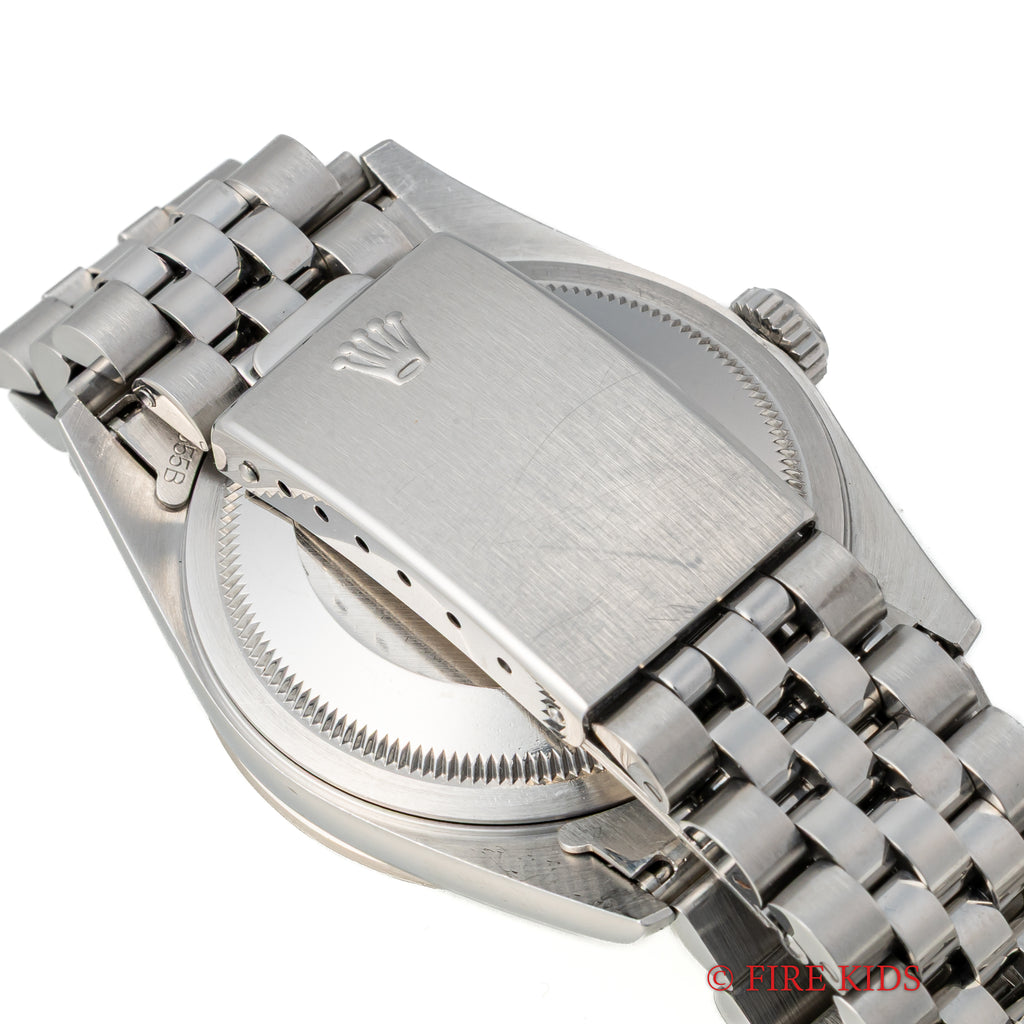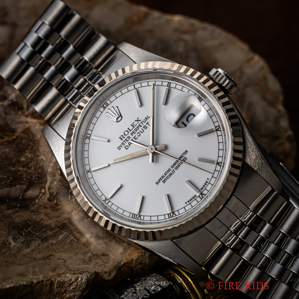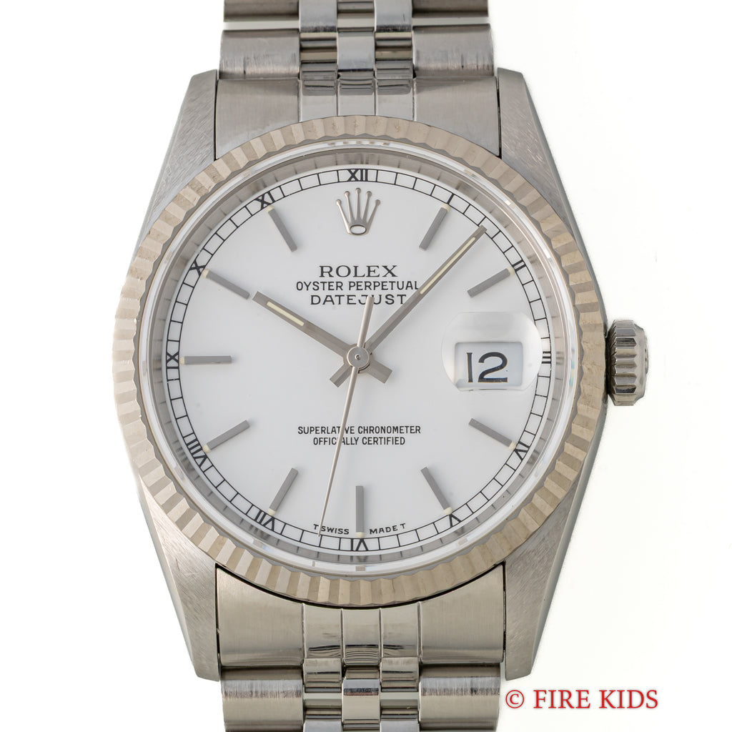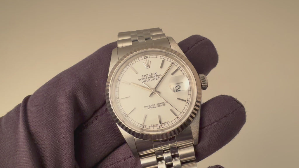 ロレックス デイトジャスト 1993年製 Ref.16234 ホワイトダイヤル使いやすい王道のステンレスモデルで文字盤は爽やかなホワイト文字盤にブラックレターで外周に小さくローマ数字が表記された上品な印象です。機械は完成度の高いCal.3135を搭載しております。手巻きや針回し、ねじ込みリューズの操作はスムースです。ベルトは純正ジュビリー62510H/FF555Bが取り付けてあります。手巻きや針回し、ねじ込みリューズの操作はスムースです。こちらは分解掃除済みです。
