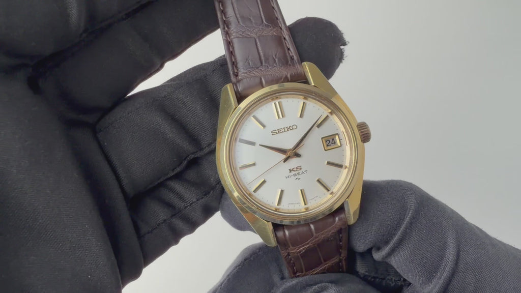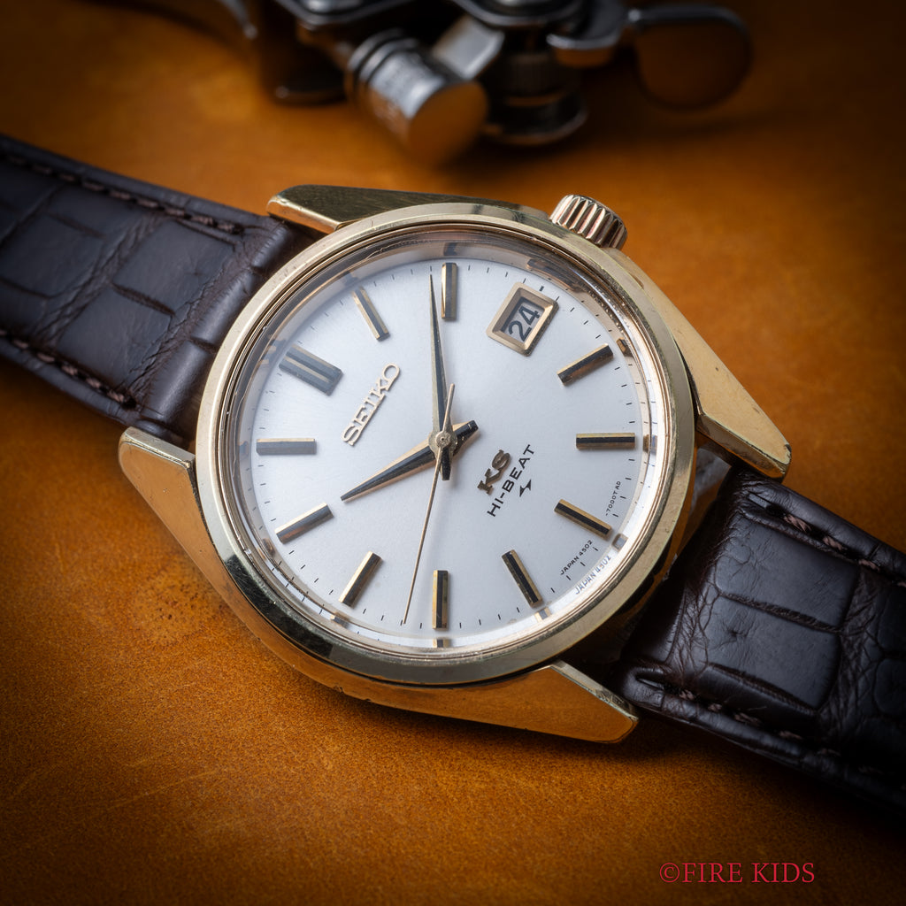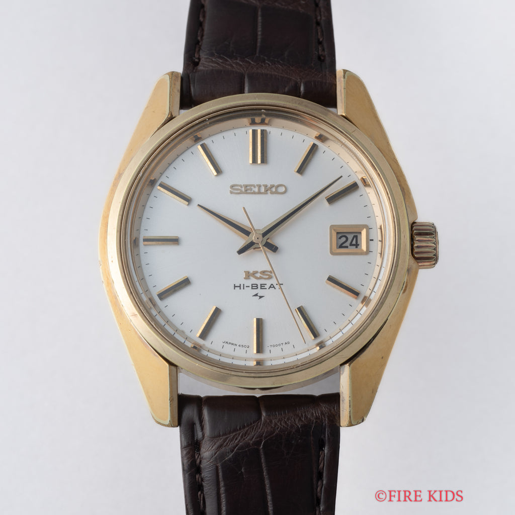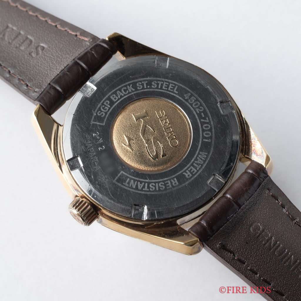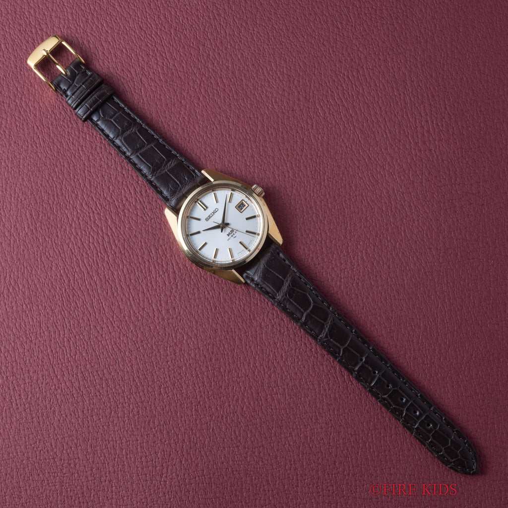 1972年製の45キングセイコー手巻きモデルです。諏訪のグランドセイコーに対抗すべく亀戸のキングセイコーが初めてハイビートの機械を搭載したモデルです。ムーブメントはCal.4502Aを搭載。ステンレスケースに比較して数の少ないSGPケース(ステンレスバックケース)は小傷はございますが大きなダメージはございません。裏ブタのメダリオンも健在です。手巻きや針回しの操作はスムースです。ベルトはファイアーキッズオリジナルのクロコダイル革ベルトを合わせています。こちらは分解掃除済みです。
