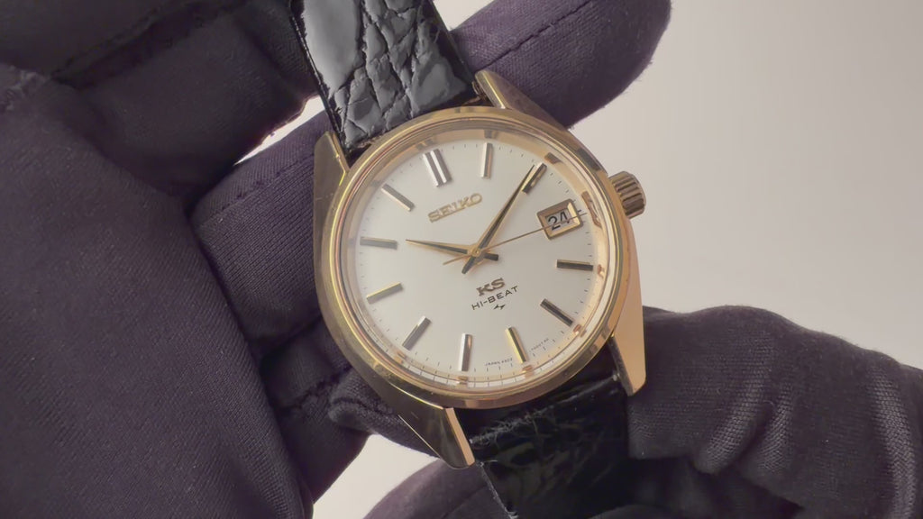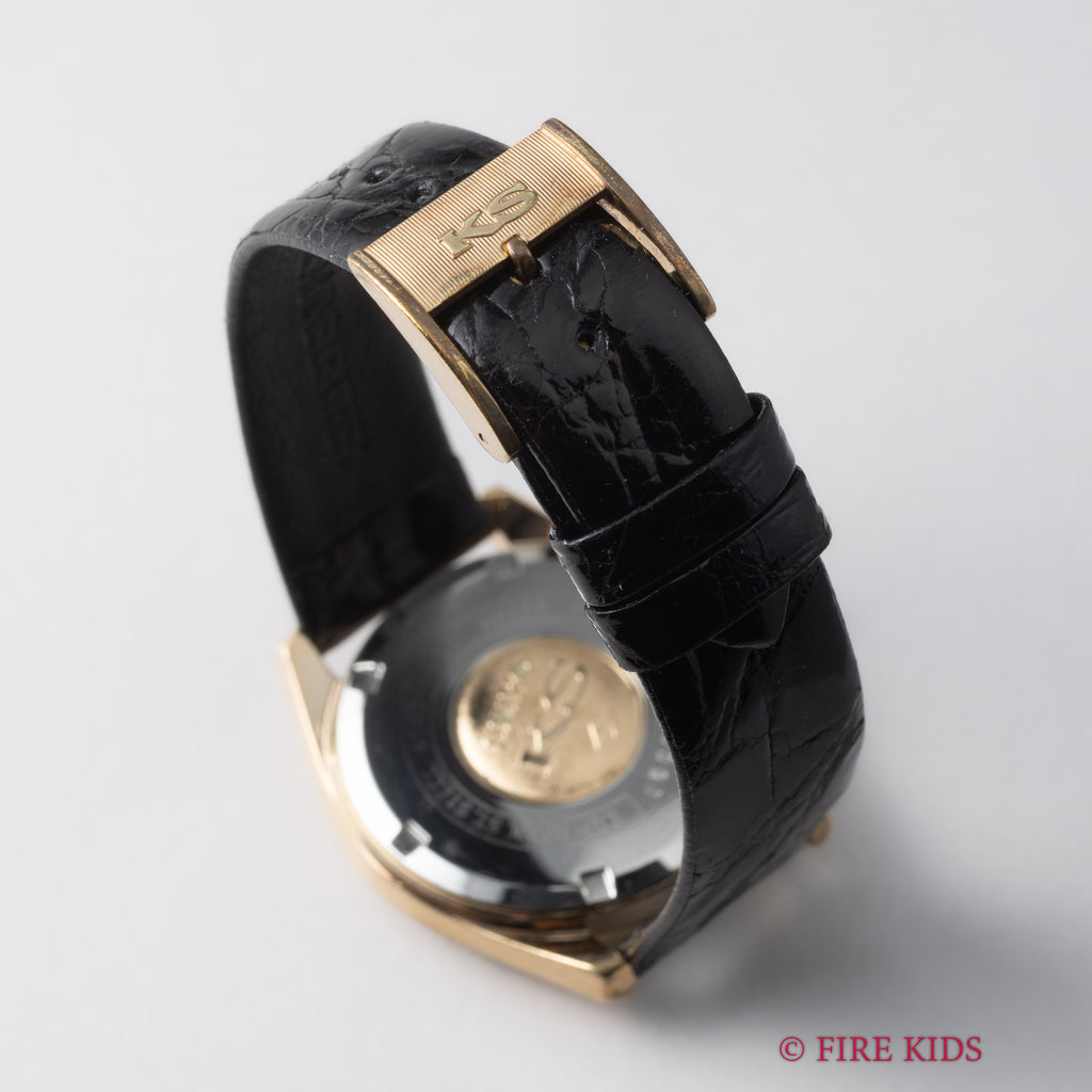 1971年製の45キングセイコー手巻きモデルです。諏訪のグランドセイコーに対抗すべく亀戸のキングセイコーが初めてハイビートの機械を搭載したモデルです。ムーブメントはCal.4502Aを搭載。ステンレスケースに比較して数の少ないSGPケース(ステンレスバックケース)は小傷はございますが大きなダメージはございません。裏ブタのメダリオンも健在です。手巻きや針回しの操作はスムースです。ベルトは社外の革ベルトに純正尾錠が取り付けられています。こちらは分解掃除済みです