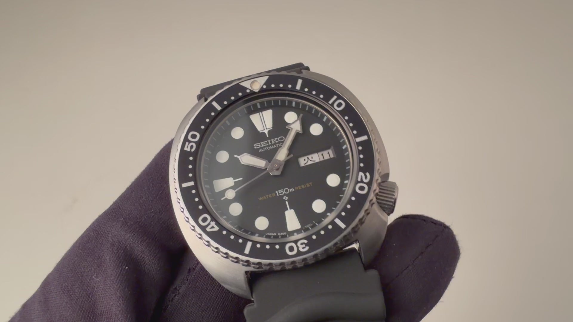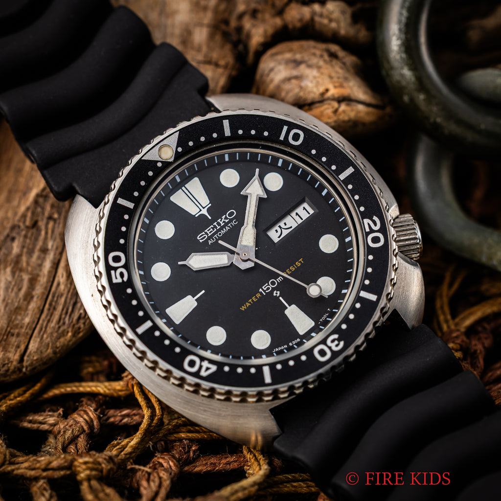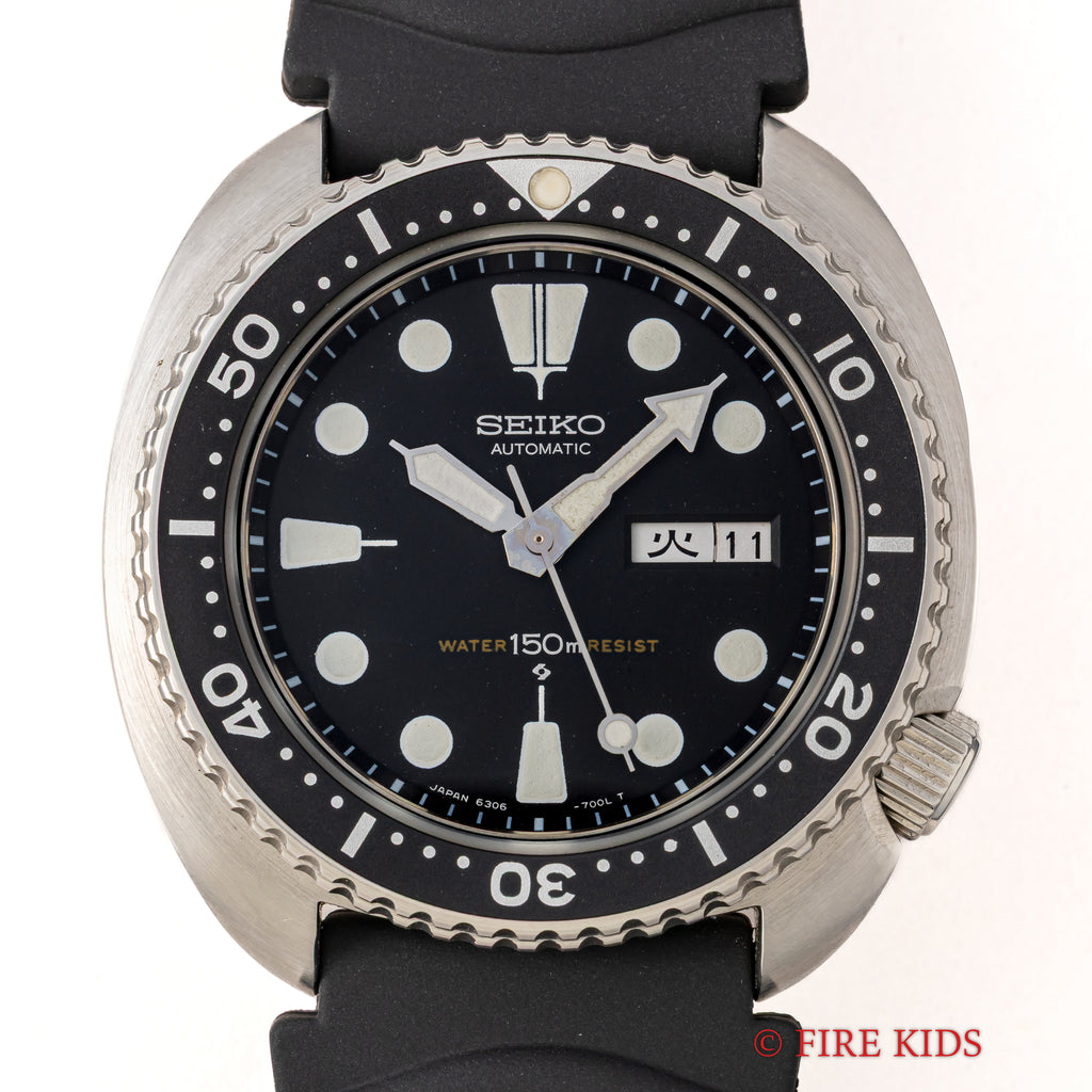 セイコー 150m 3rdダイバー 1979年製 Ref.6306-7001 国内仕様 タートル 自動巻の入荷になります。セイコーのダイバーモデルの中でその独特なケース形状から海外ではタートルと呼ばれ人気のサードダイバーです。ムーブメントは自動巻きのCal.6306Aを搭載、カレンダーは日本語と英語が選べる国内仕様になります。リューズのねじ込みもしっかりと行えます。ベゼル、ケースコンディションは良好で、裏蓋は保護シールがまだ残っています。ベルトは純正のラバーストラップに純正尾錠が取り付けられています。
