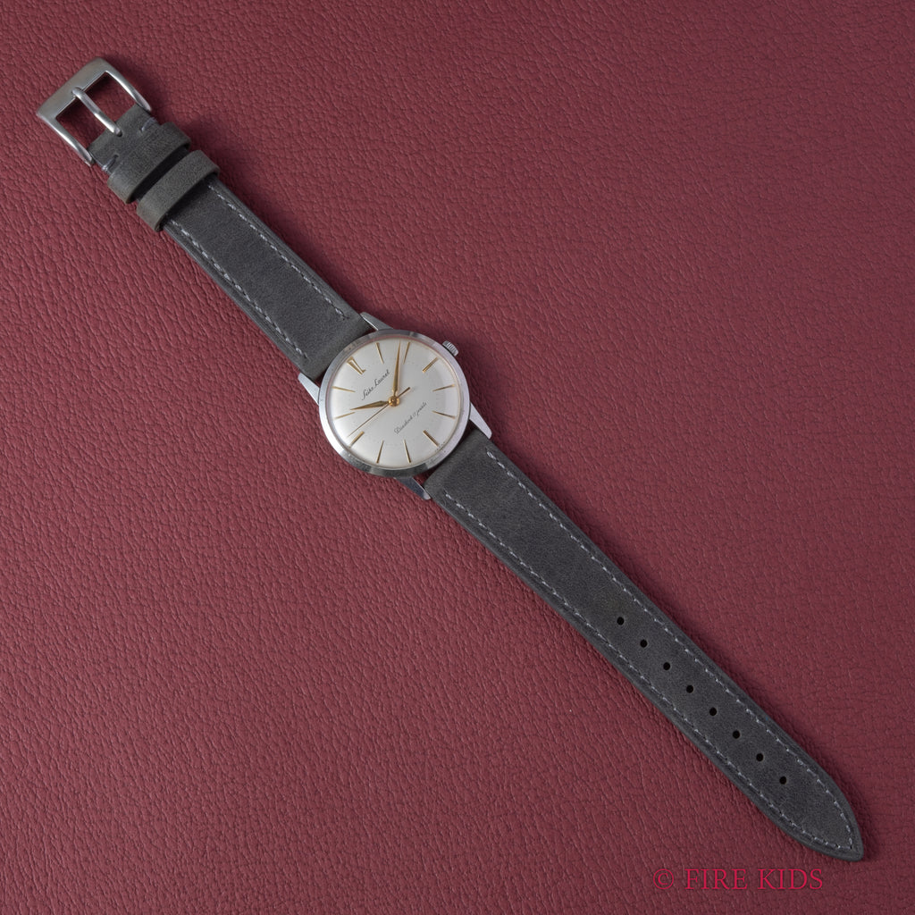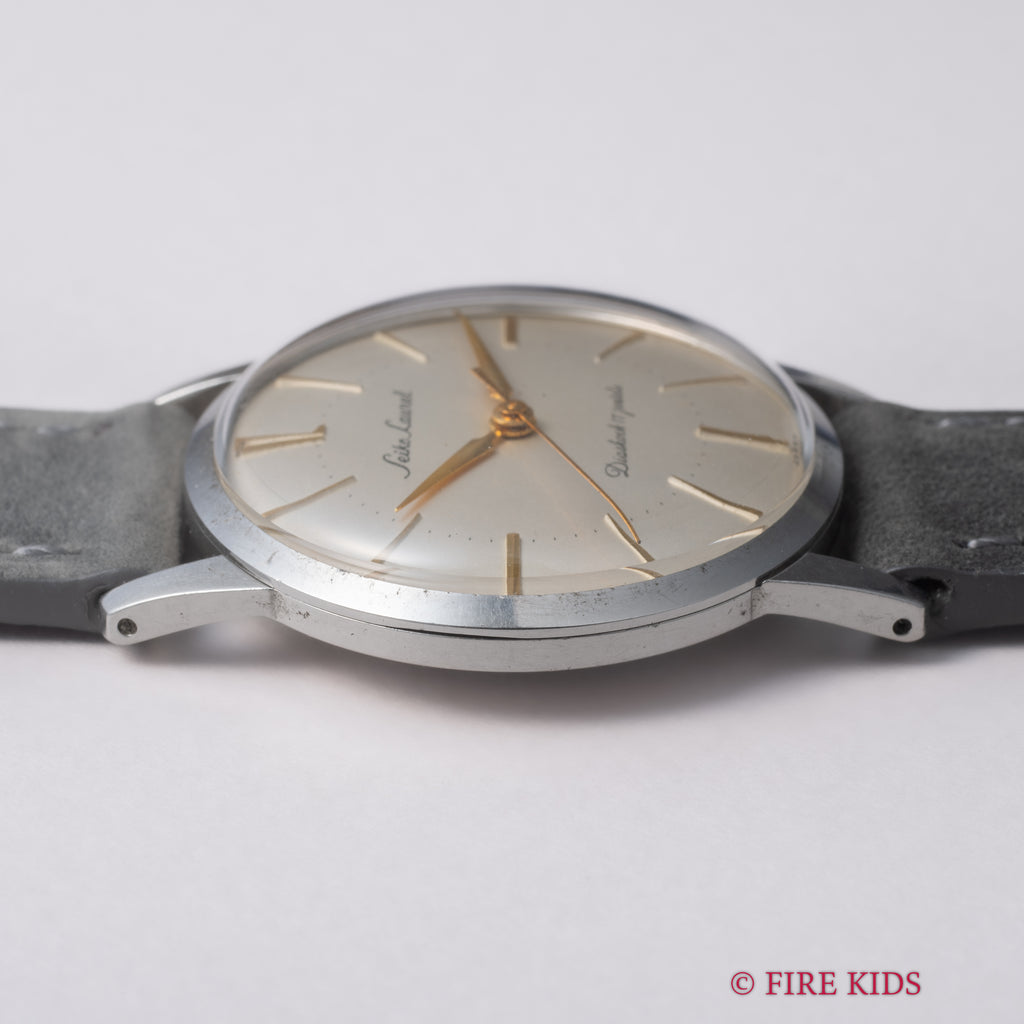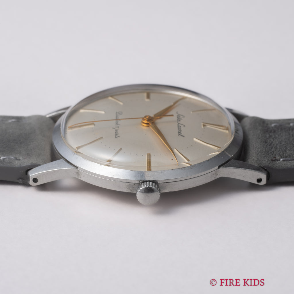 セイコー ローレル 1959年製 Ref.14025 手巻き17石です。長めのインデックスの内側にミニッツがある中々見ない顔付きの一本です。12のアラビア数字のフォントも変わっていて良い感じです。年代の割に大きな経年、傷もなく良いコンディションです。派手さは無いですが随所に捻りがあって飽きの来ない良い時計です。ベルトは社外の起毛感のある革ベルトを合わせています。手巻きや針回しはスムーズです。