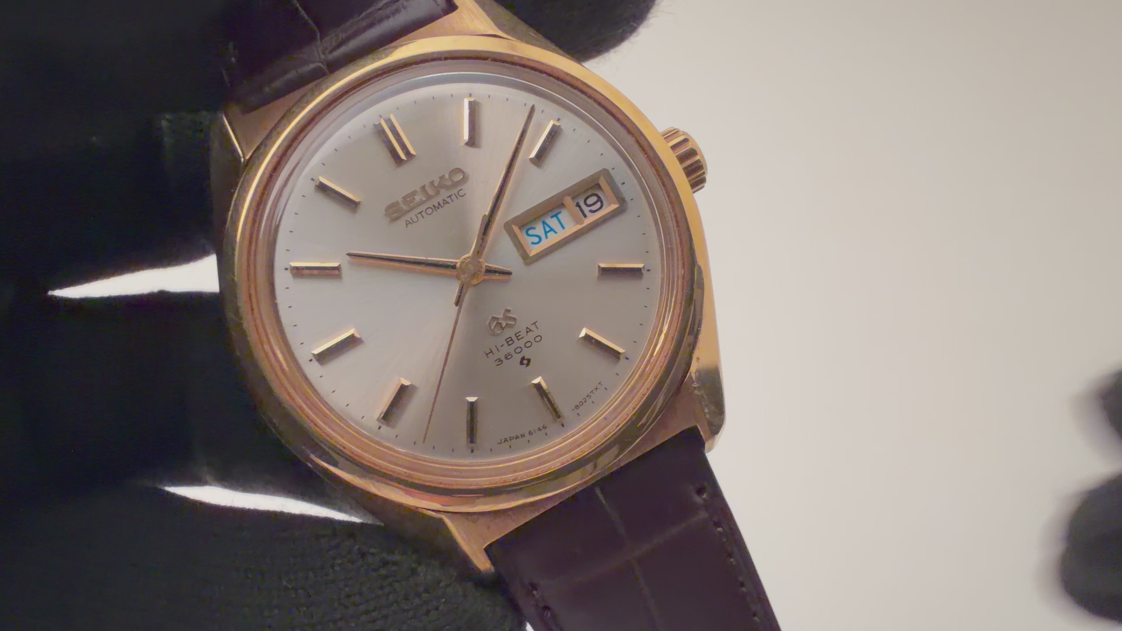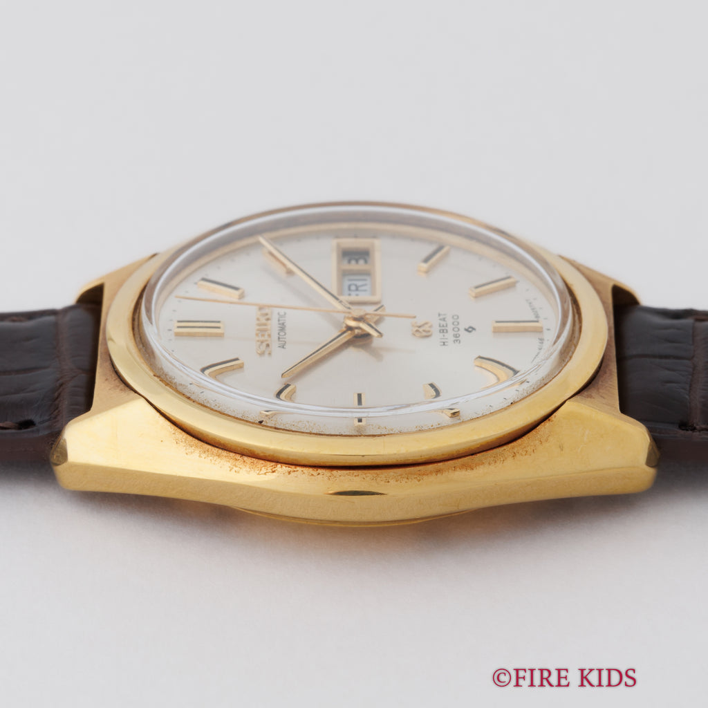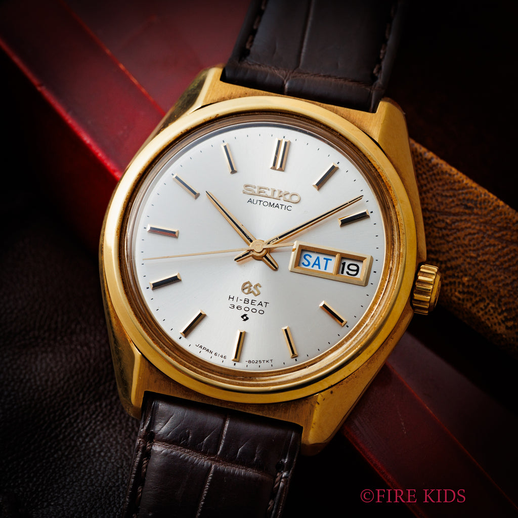 18金無垢グランドセイコー 1969年製 Ref.6146-8000 10振動自動巻きです。18金無垢イエローゴールドのセイコースタイルケースにデイデイト10振動のハイビート自動巻を搭載したスペシャルモデルです。それまで海外の高級時計を意識したデザインから独自デザインに変わった年代でセイコーの技術がスイス製に負けていないという自信がデザインにも現れている感じがします。61GSの中でも金無垢ケースは珍しく状態の良い個体は希少です。文字盤は若干経年がございますが綺麗な状態です。ケースも小キズが見られますが大きなダメージ無く良い状態です。手巻きや針回しの操作はスムーズです。ベルトはファイアーキッズオリジナルのクロコダイル革ベルトが取り付けられています。