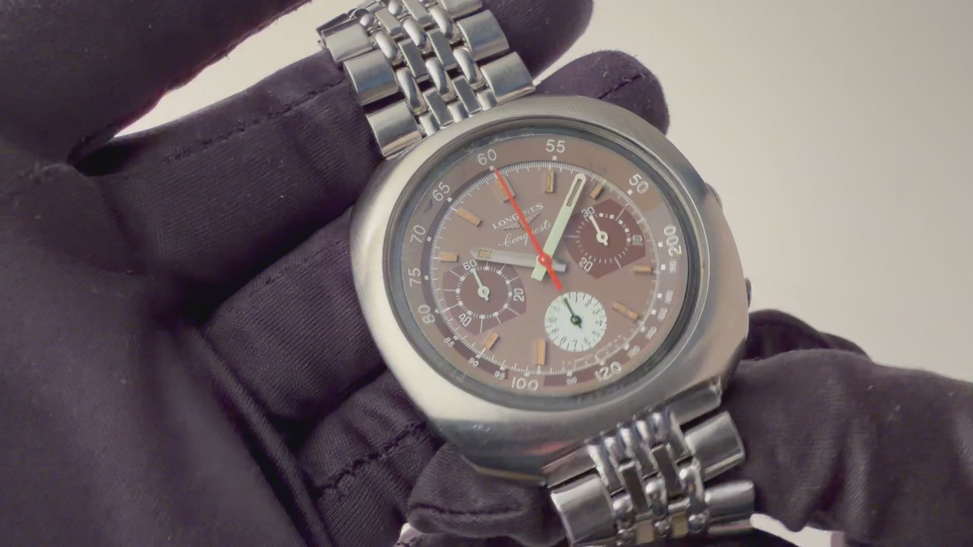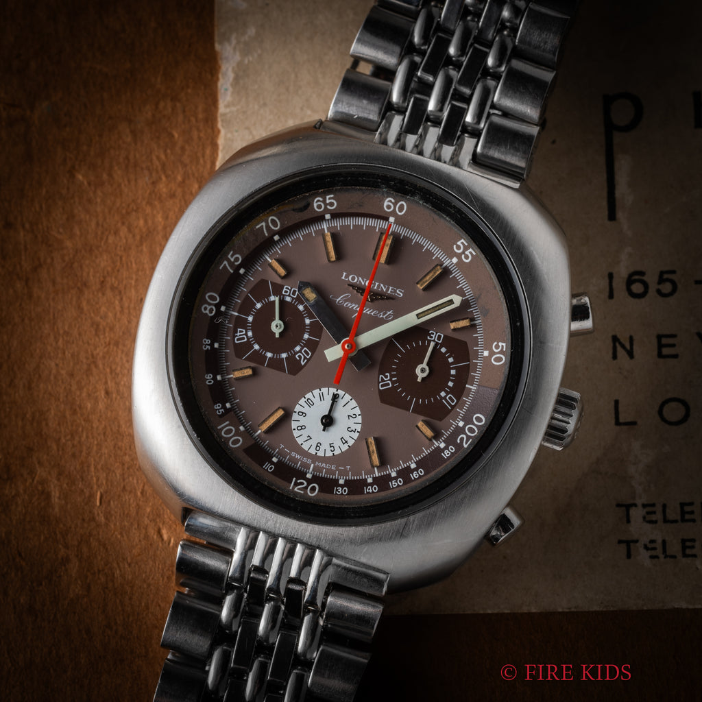 ロンジン コンクエスト クロノグラフ Ref.8595 1970 1969年製 Ca.330 バルジュー72です。43mmの大型、肉厚ケースで存在感抜群のコンクエストクロノグラフです。意外と腕乗りも良いです。文字盤経年も淡いブラウンが良い雰囲気です。Val.72ベースのCal.330は操作もスムーズで良いコンディションです。純正ブレスが付いています。こちらは分解掃除済みです。