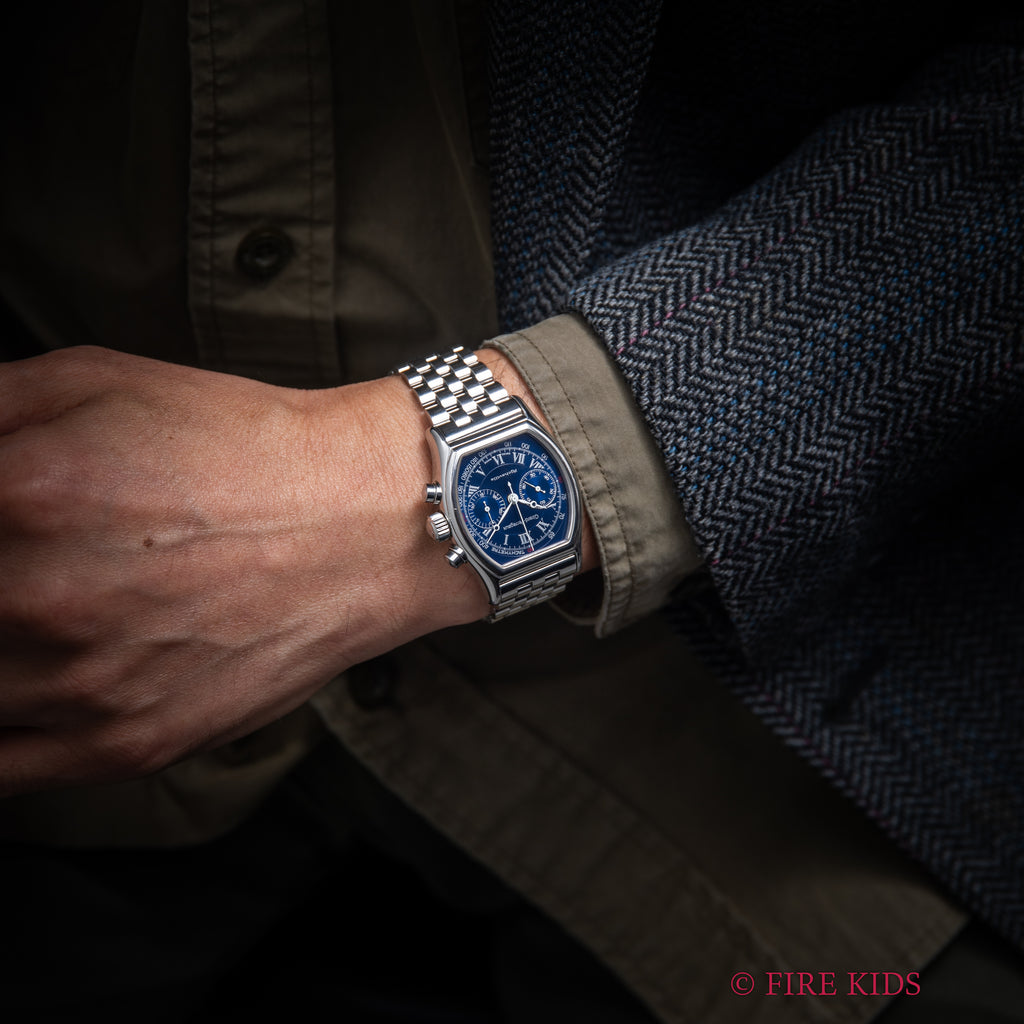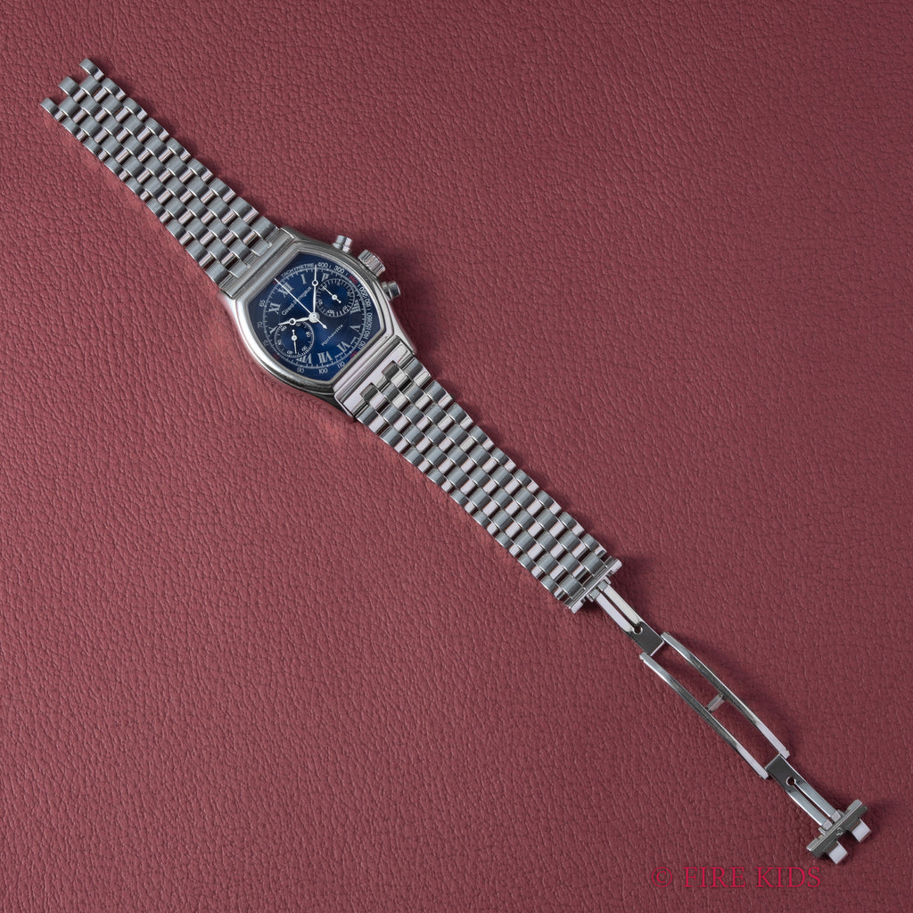 ジラール・ペルゴー リシュビル 1990年代製 Ref.2710 ブルーローマンダイヤル クロノグラフ 箱ギャラ、革ベルト尾錠付の入荷になります。リシュビルでは珍しい純正ステンレスブレス付きです。ジラールペルゴは時計メーカーの中でもかなりの老舗メーカーで1791年創業です。トノー型のケースにクロノグラフを落とし込む珍しい組み合わせが目を惹く一本です。鮮やかなブルーの文字盤にローマンインデックスにブレゲ針の組み合わせはクラシカル印象を演出してます。付属品として中古の純正革ベルト、尾錠と箱、ギャランティーが付属します。