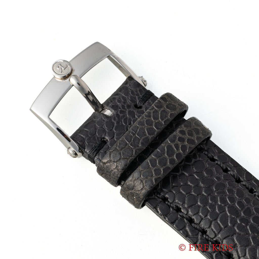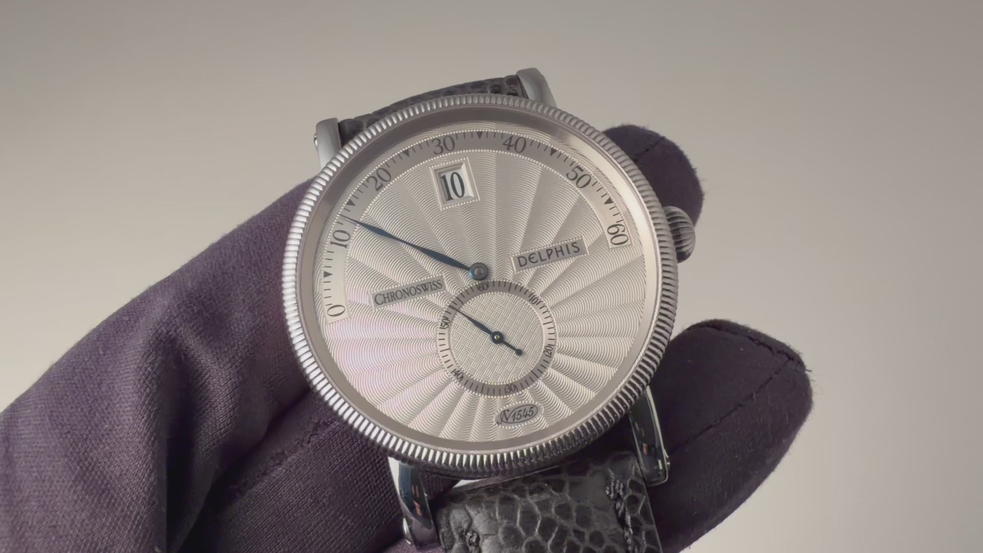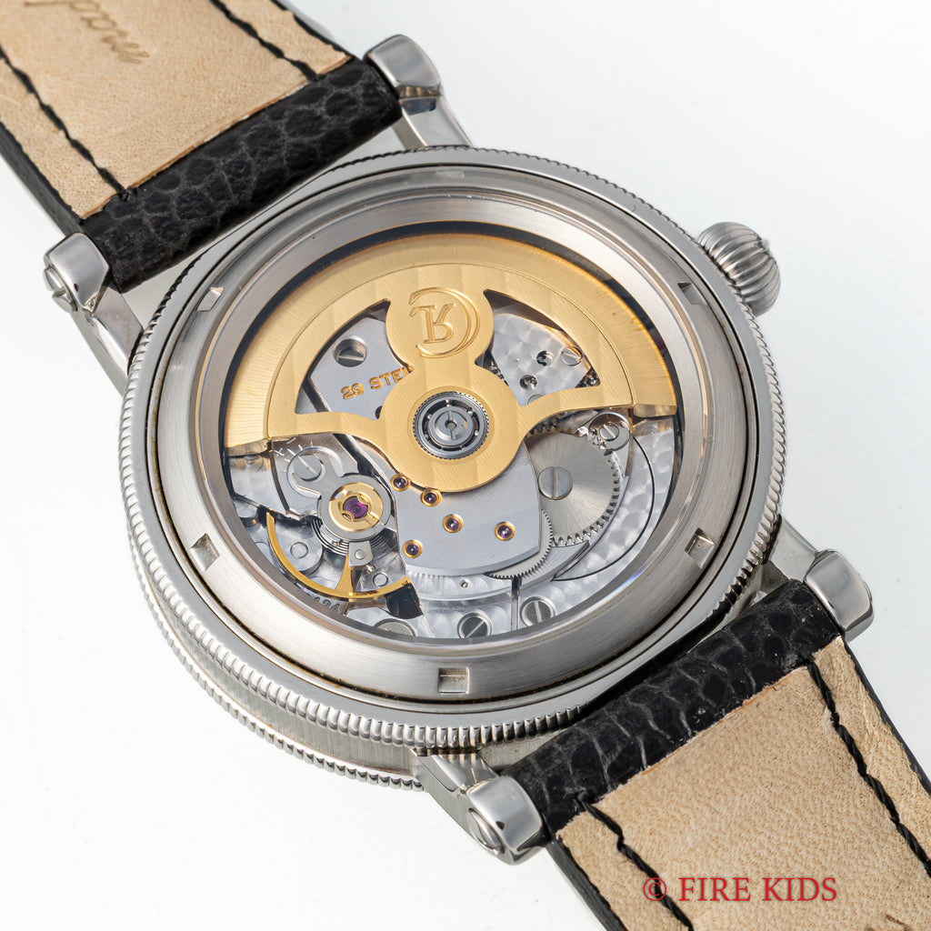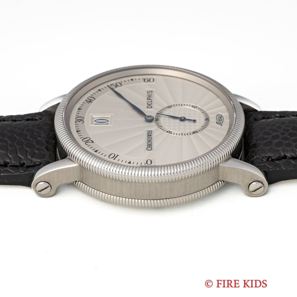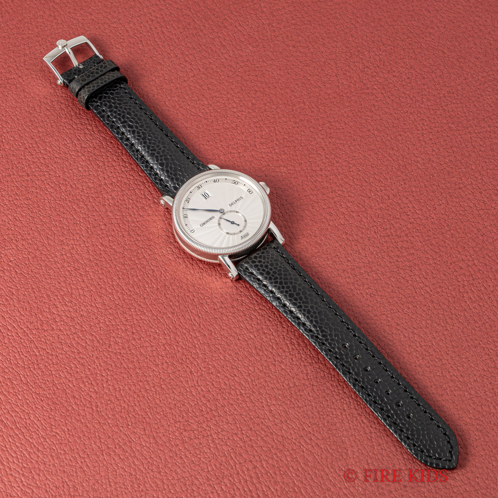 クロノスイス ジャンピングアワー レトログラード デルフィス 1999年発行ギャラ 箱 純正尾錠 の入荷になります。時間表示がジャンピングアワー(24h表記)で分針がレトログラード、スモールセコンドと時計好きには堪らないスペックの時計です。ケースもクラシカルなデザインで裏蓋はスケルトンバックになっています。使用感が少なく全体的に綺麗な1本になります。手巻きや針回しの操作はスムースです。ベルトは社外革ベルトに純正尾錠が取り付けられています。1999年発行のギャランティ、箱が付属します。