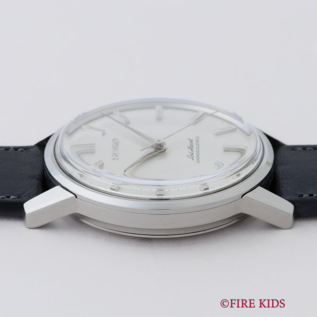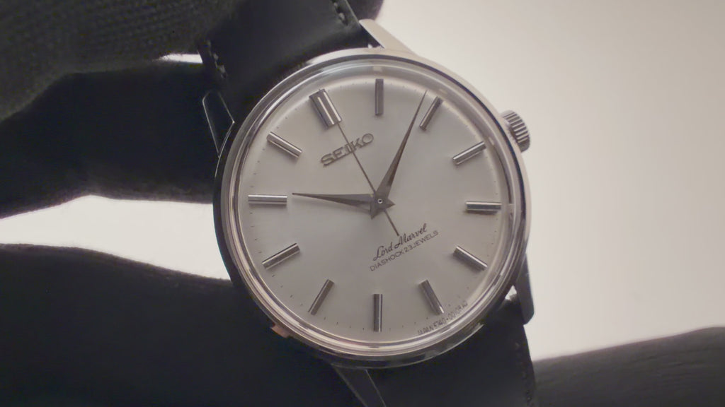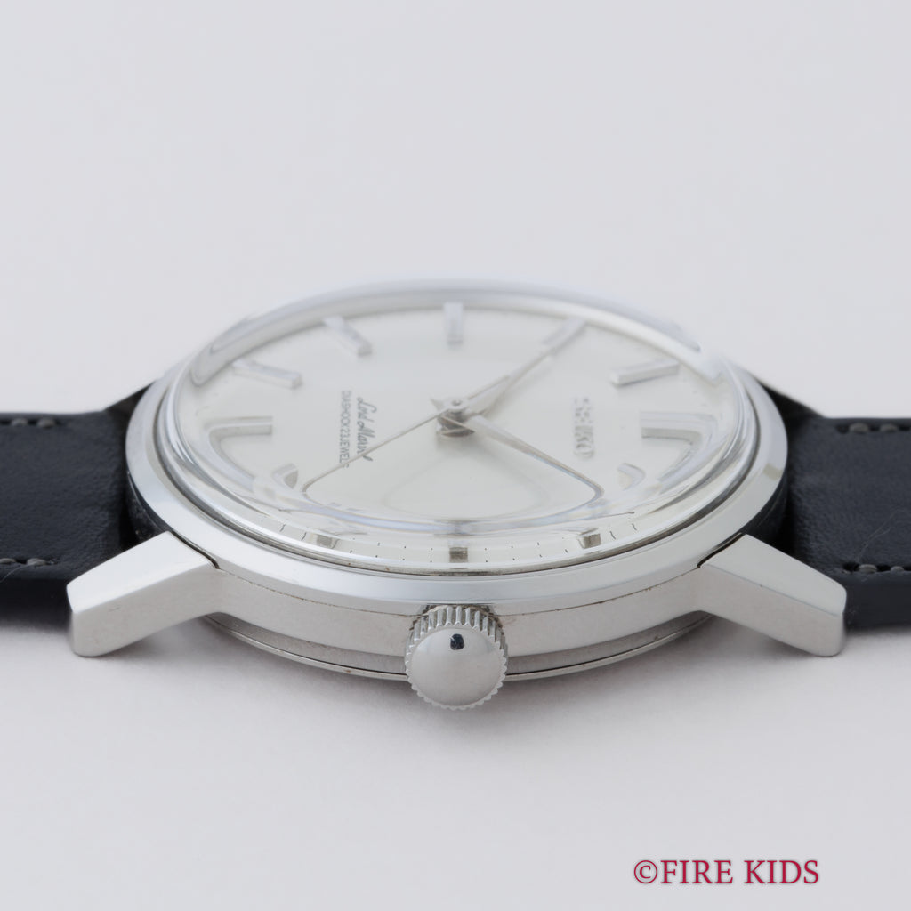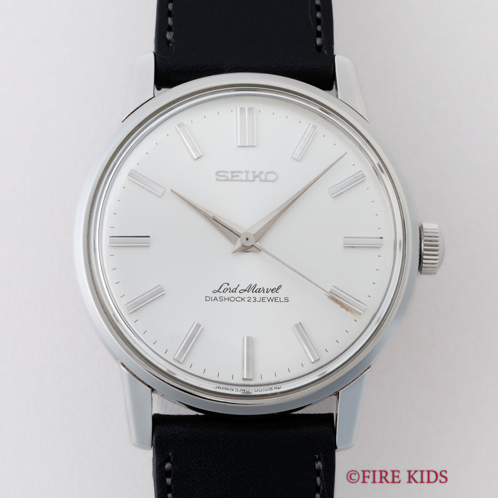 セイコー ロードマーベル 1966年製 Ref.5740-0010 ロービート手巻きの入荷になります。ロードマーベルは1960年にグランドセイコーが生まれる以前の高級機として1958年から製造されたモデルです。サンレイ仕上げの文字盤やドーフィンハンド、植字のインデックスなど高級感が感じられます。年代なりの多少の経年はありますが大きなダメージはありません。機械はロービート(5振動)手巻きのCal.5740Aを搭載。手巻きや針回しはスムーズです。ベルトはファイアーキッズオリジナルのブッテーロカーフレザーに純正尾錠を合わせています。