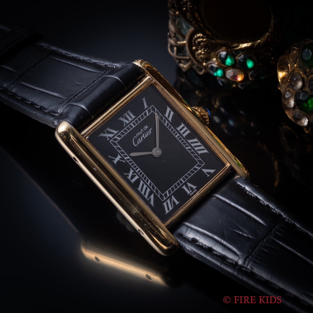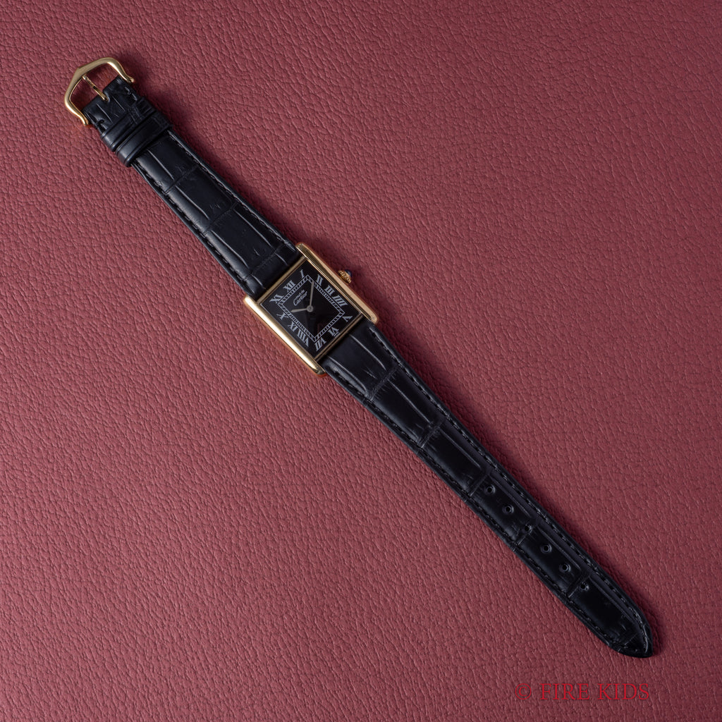 カルティエ マストタンク 1980年代製 LMサイズ ブラックローマンダイヤル 手巻 純正尾錠の入荷になります。文字盤はブラックローマンダイヤルでホワイトとはまた違った上品な印象を感じます。ダイヤルは肉眼で綺麗なコンディションを維持しています。ベルメイユ(銀無垢ケースに金張り)のケースは小傷等多少の使用感はございますが大きなダメージはありません。ベルトはファイアーキッズオリジナルのクロコダイル革ベルトに純正尾錠が取り付けられています。