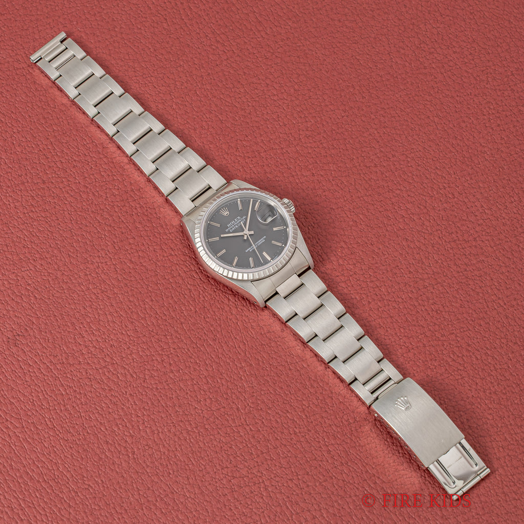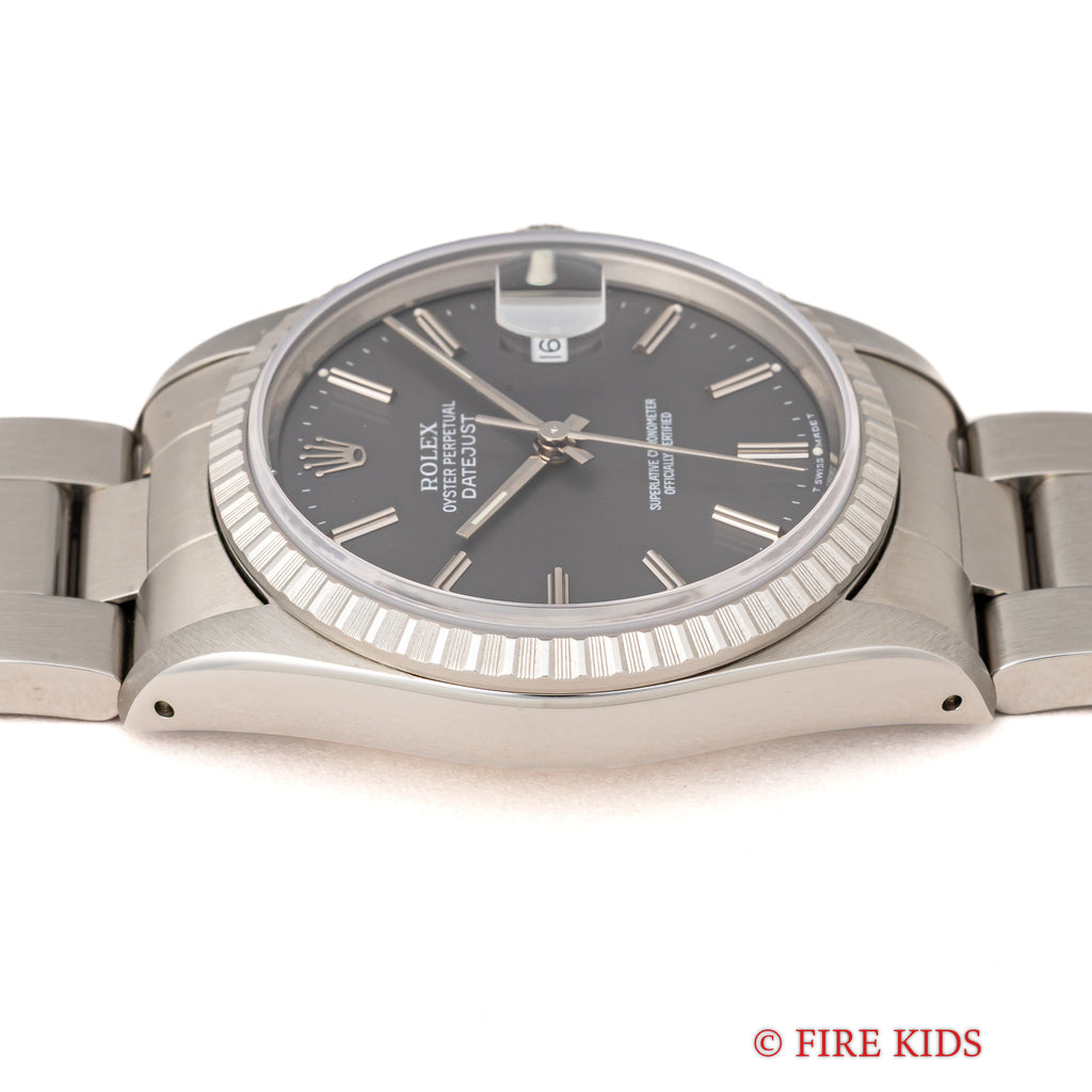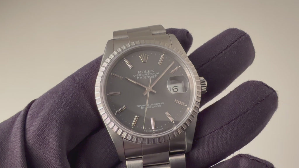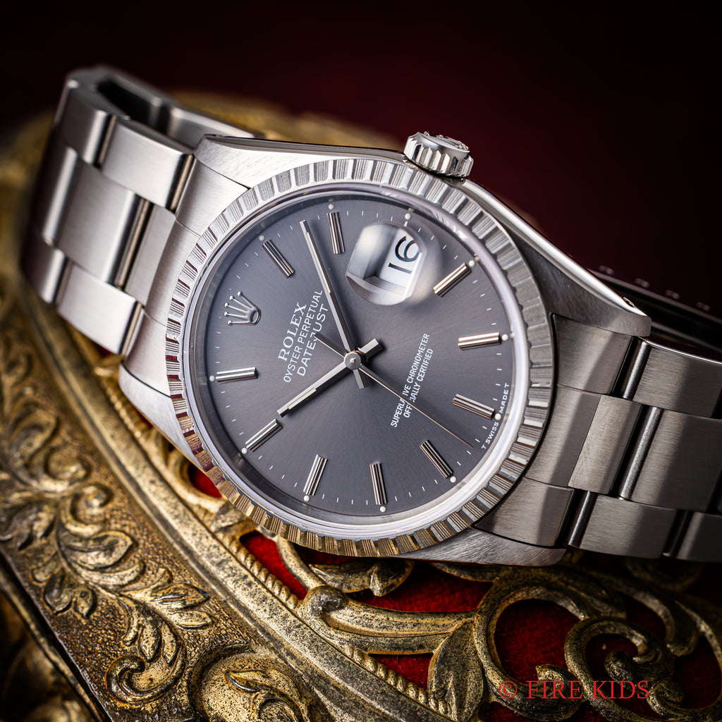 ロレックス デイトジャスト 1991年製 Ref.16220 グレーダイヤル 純正オイスターブレスの入荷になります。珍しいグレーのゴーストダイヤルにエングレーブドベゼルを搭載し、華やかな雰囲気も感じる一本です。ケースは小傷程度で大きなダメージはありません。機械は安心のロングセラーCal.3135を搭載しております。手巻きや針回し、ねじ込みリューズの操作はスムースです。ベルトは人気の3連オイスターブレスが取り付けてあります。