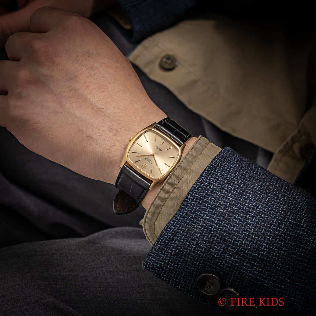 ロレックス 1975年製 チェリーニ トノー型 18金無垢イエローゴールド Cal.1601 Ref.3805です。ルネサンス期のイタリア人芸術家、ベンベヌト・チェリーニの名から着想を得ているシリーズでオイスターケースとは異なる高級時計です。横に広いトノー型の18金無垢イエローゴールドケースはシンプルで上品な印象です。ケースは小傷程度の綺麗な状態です。文字盤も傷や痛みもなく綺麗な状態です。ベルトはファイアーキッズオリジナルクロコダイル革ベルトを合わせています。手巻きや針の操作感もスムースです。
