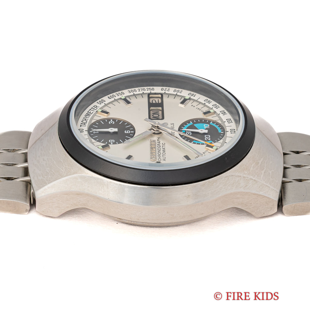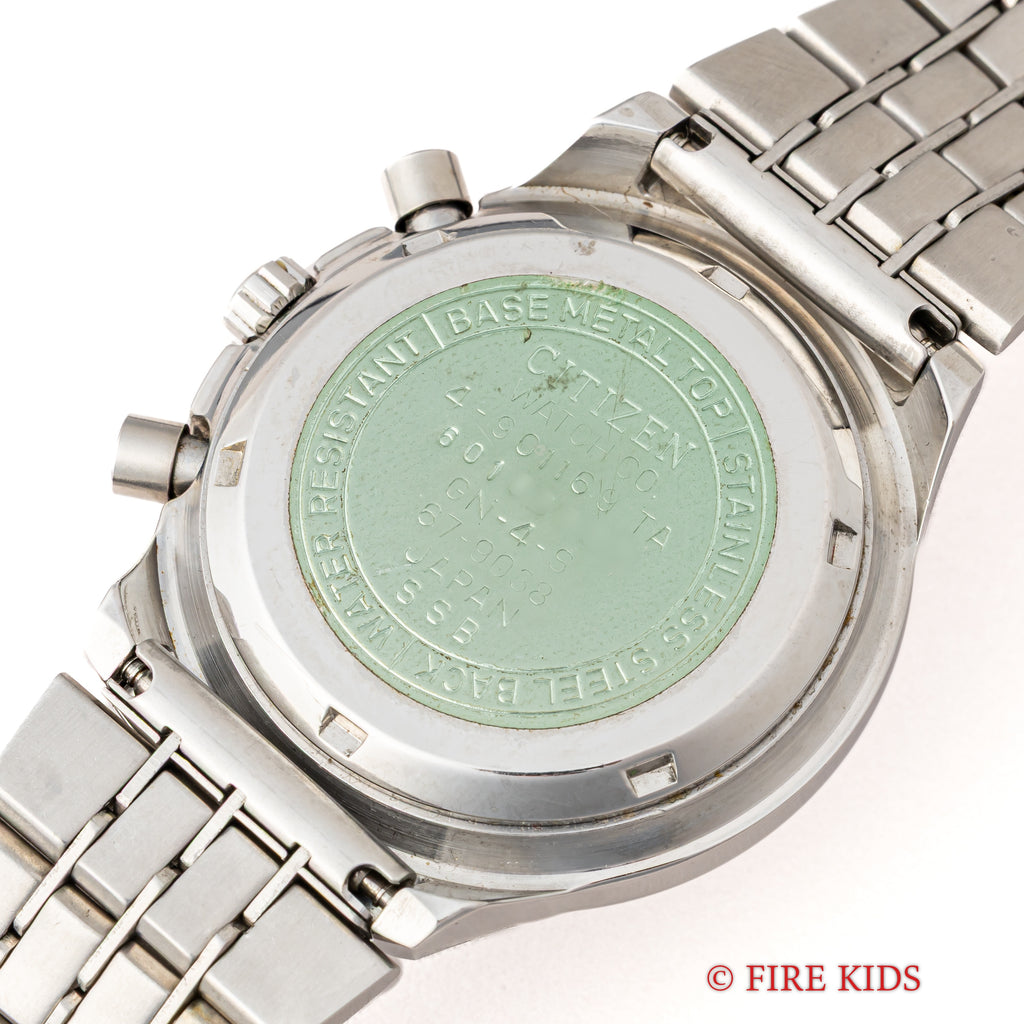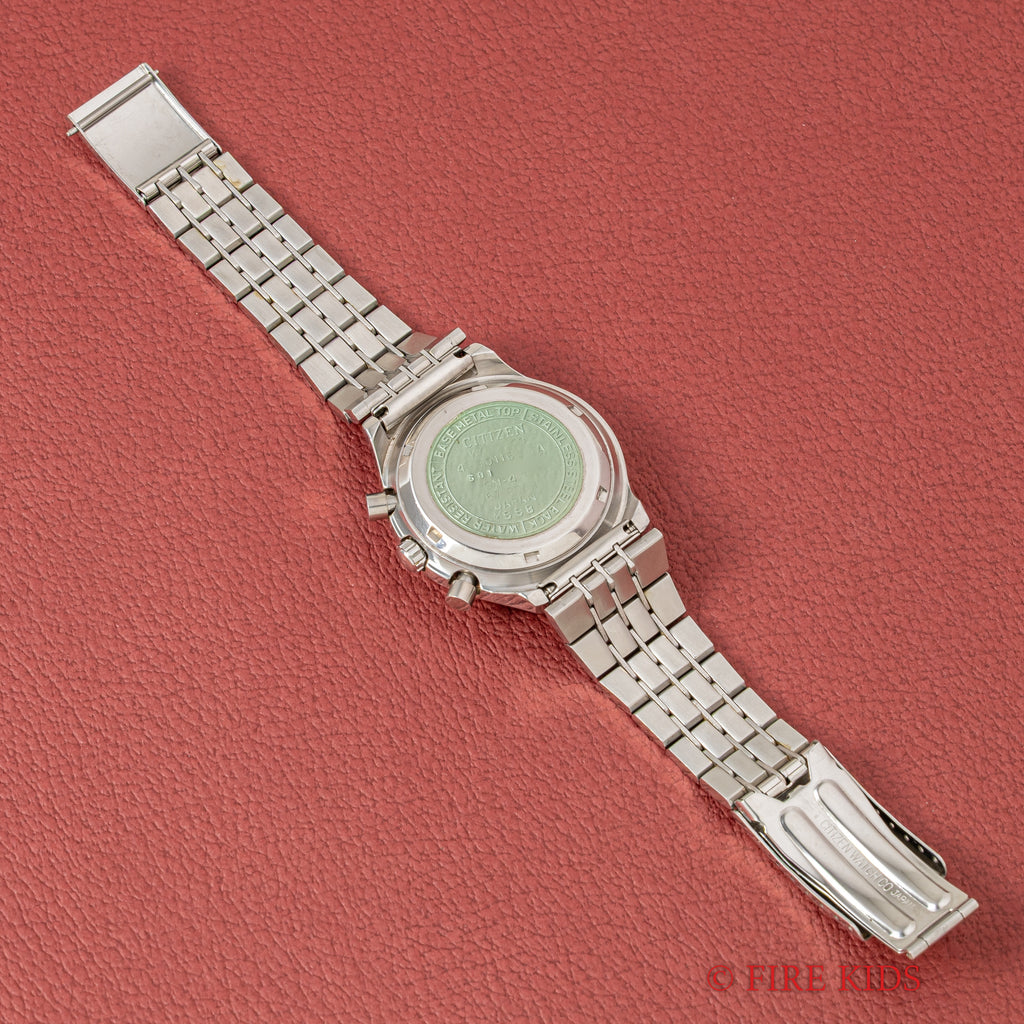 1976年製シチズンのクロノグラフ チャレンジタイマーです。裏蓋にシールの残った個体となします。通常のクロノグラフ機能に加えて、ムーブメントはカレンダーのクイックチェンジとフライバック機能も搭載しています。ケースは小傷が見られますが大きなダメージはありません。手巻きや針回し、クロノグラフの操作はスムーズです。純正のステンレスブレス付きです。