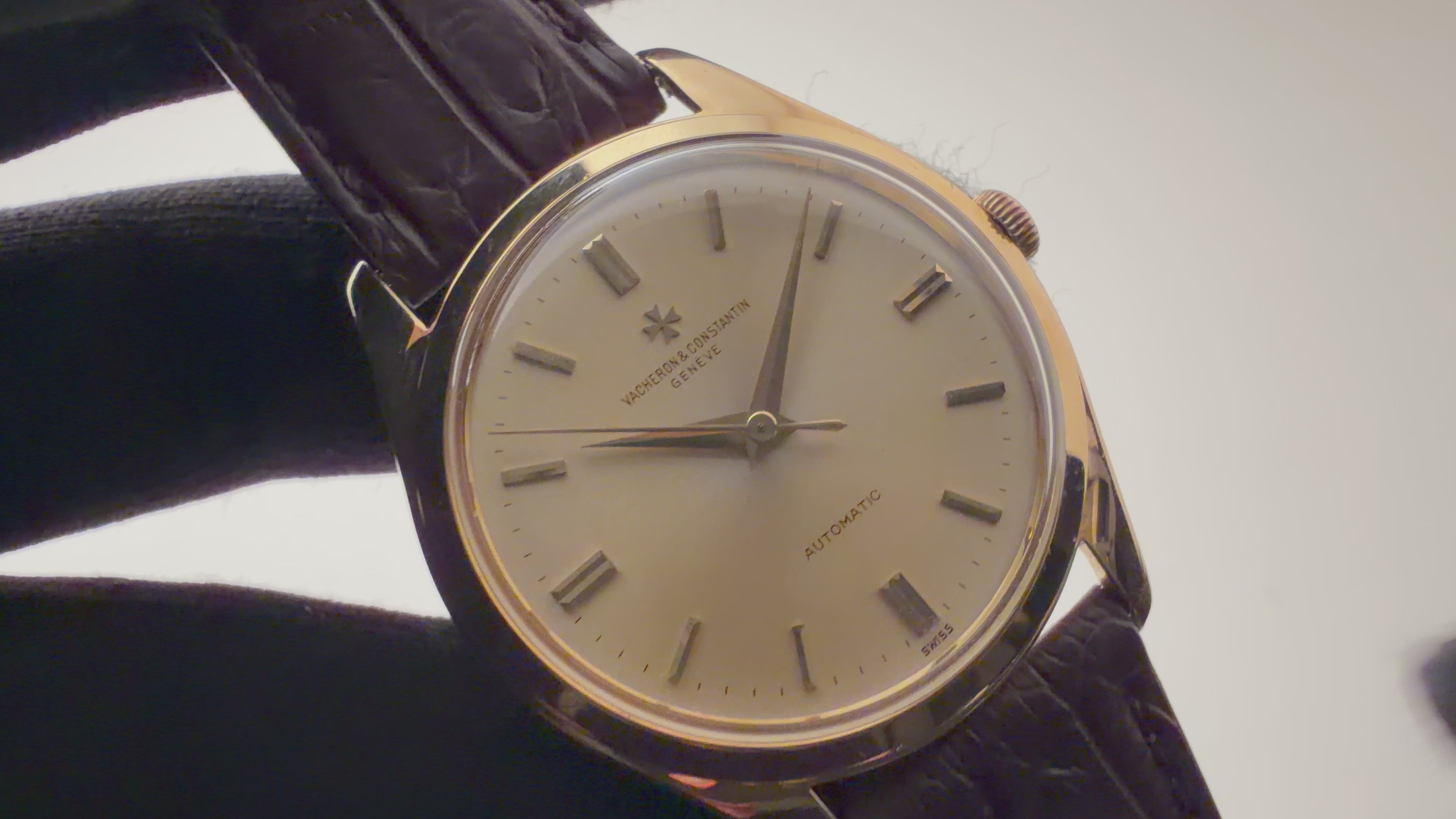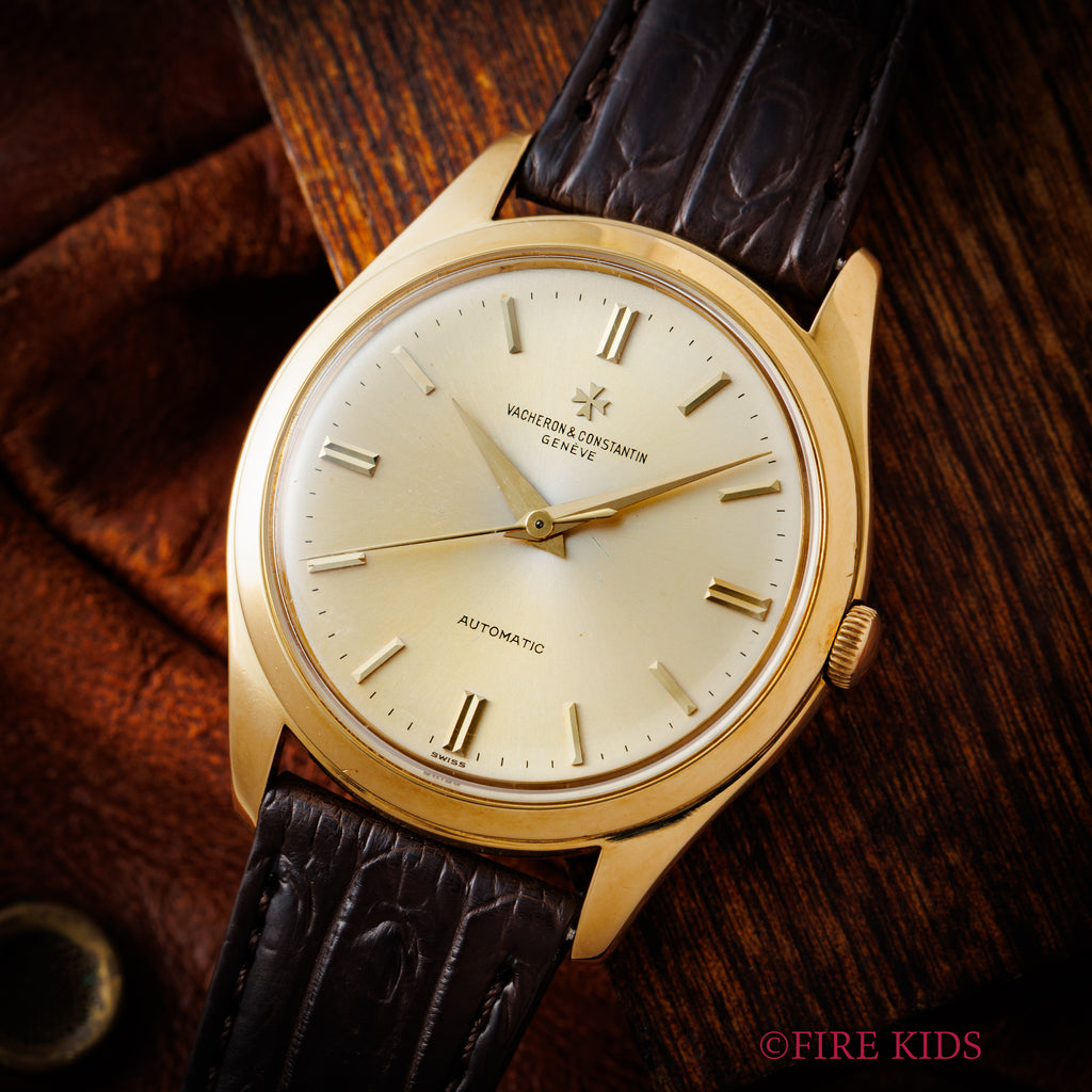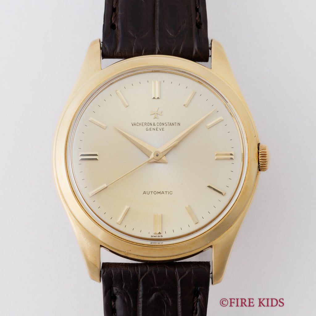 1960年代製 ヴァシュロン・コンスタンタン ラウンドケース 18金無垢モデルです。 3針で自動巻き、ノンデイト スクリューバックケースと非常に使い勝手の良い一本です。視認性が良いダイヤルは、ルーペで見るとやや経年、コキズが感じられますが肉眼ではそこまで目立ちません。ケースは全体的に磨きが若干入ってますがその他大きなダメージはありません。18金無垢のローターを搭載するCal.K1071は綺麗な状態です。手巻きや針回しの操作はスムースです。ベルトはファイアーキッズオリジナルのクロコダイルに純正尾錠を取り付けてあります。