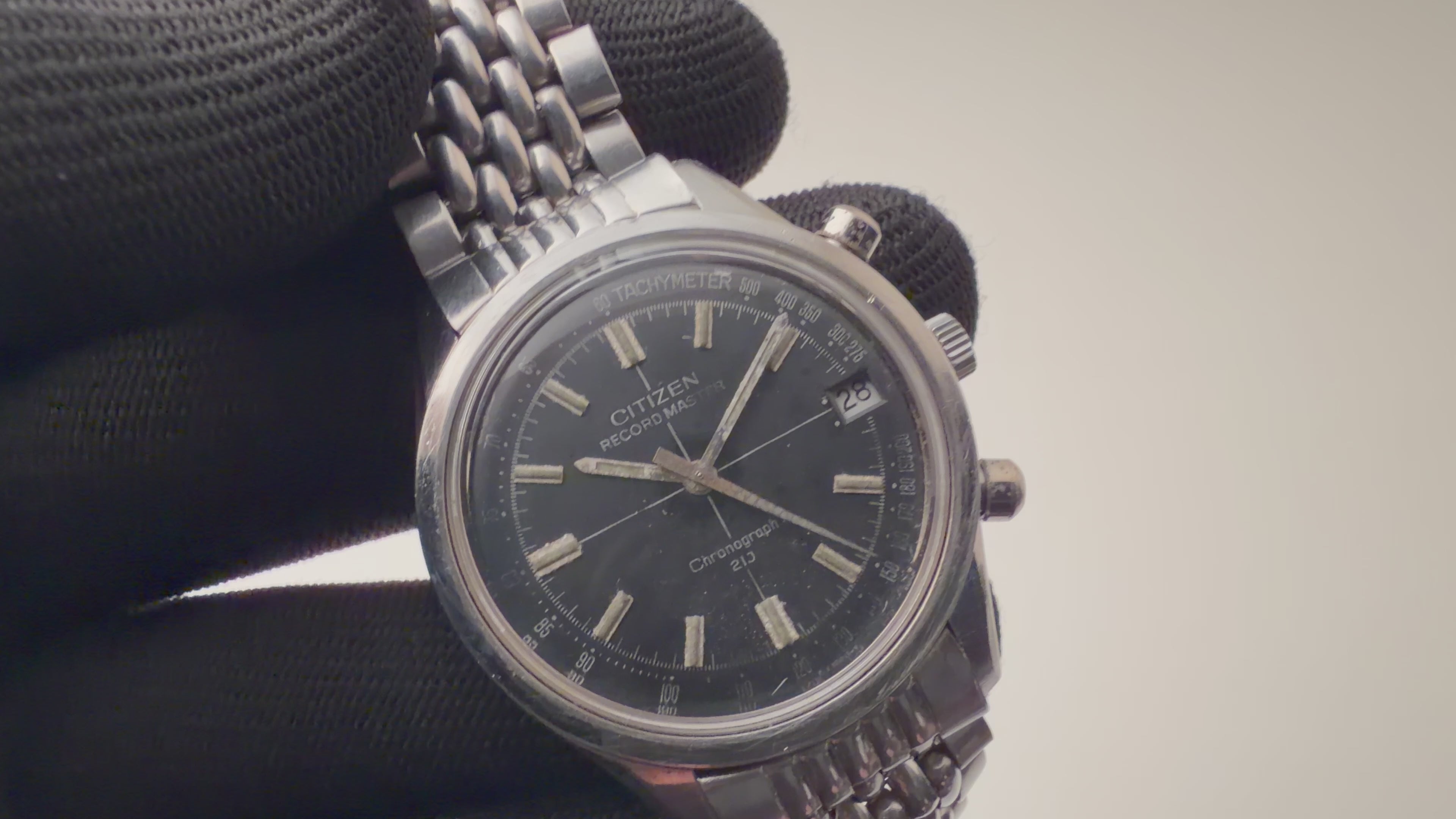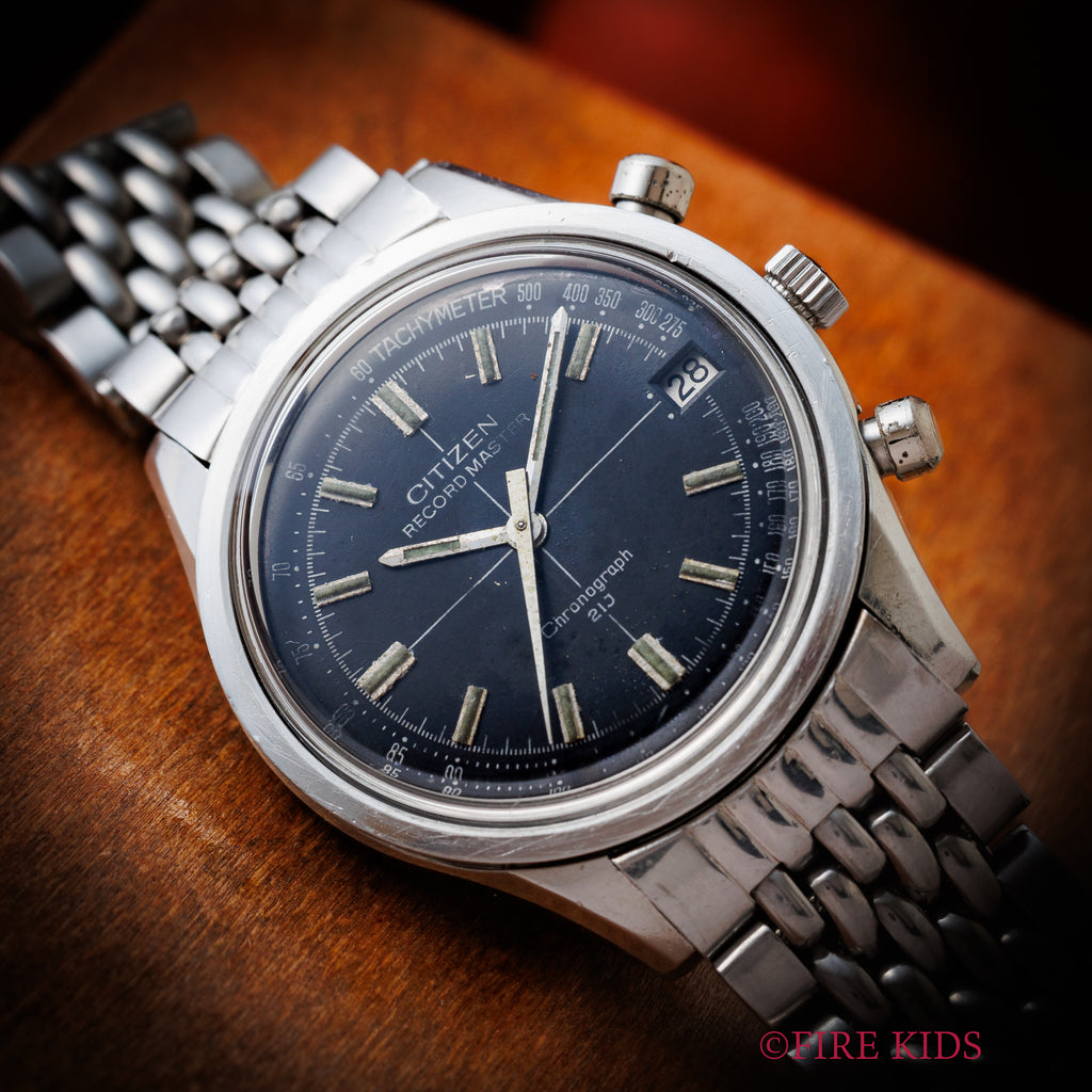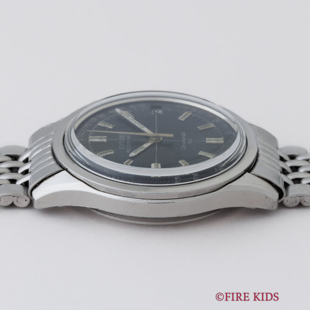 1973年製のシチズンレコードマスターです。フライバック機能搭載のクロノグラフで製造期間も僅か5年というレアなモデルです。ムーブメントは手巻き21石のCal.5702を搭載。手巻きや針回し、クロノグラフの操作はスムースです。ベルトは純正のステンレスブレスが取り付けられています。