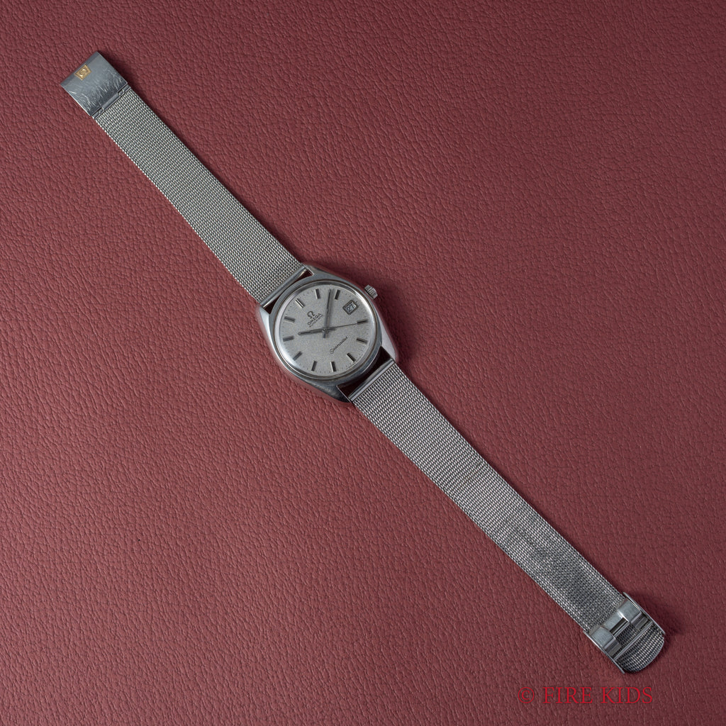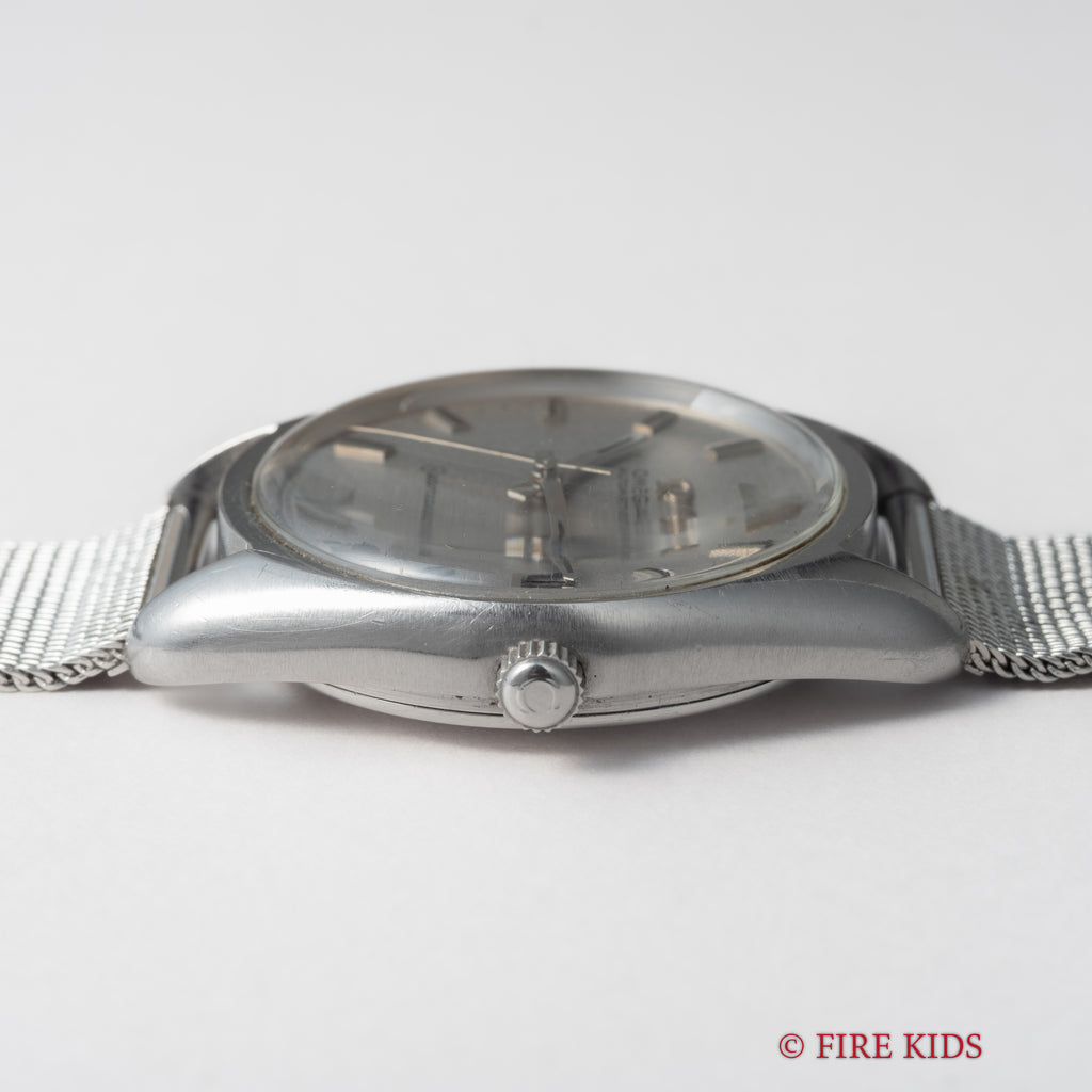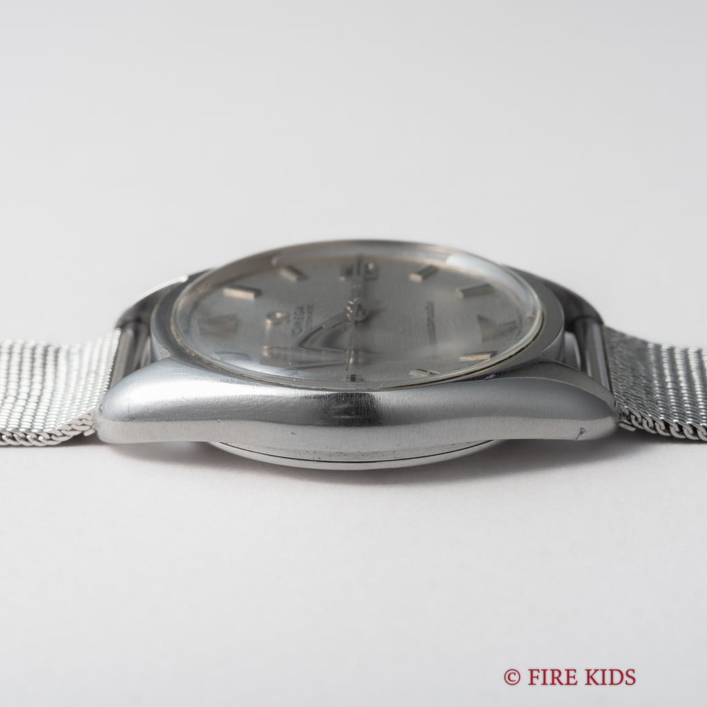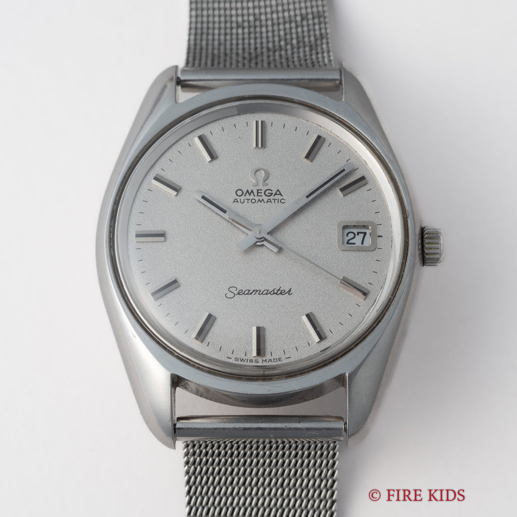 1969年製のオメガ「シーマスター」です。ステンレスのケースに梨地仕上げの文字盤とアップライトのバーインデックスのシンプルで飽きの来ない組み合わせです。キャリバーはオメガの名作自動巻き500系Cal.565を搭載。スワンネック式微動緩急針を持ち、高い精度の出る機械です。カレンダーはリューズを2段引くと早送り可能です。文字盤に劣化は無く綺麗な状態を保っています。ケースは小傷等ございますが目立つ大きな傷はございません。手巻きや針回しの操作はスムースです。ブレスは純正のメッシュブレスを合わせています。