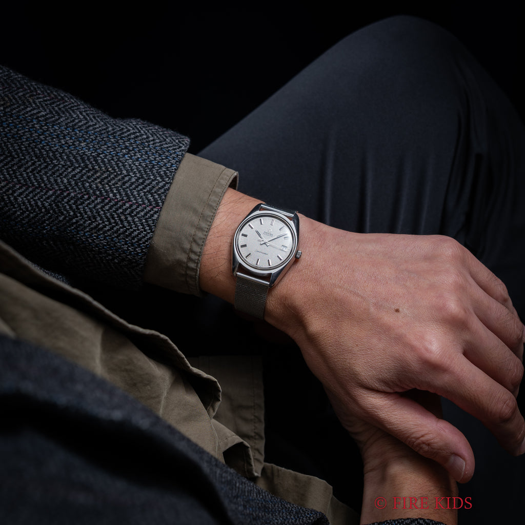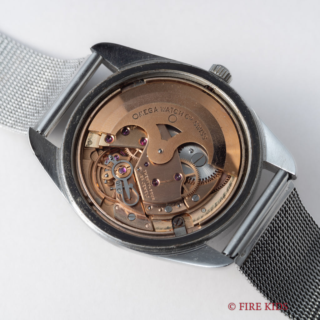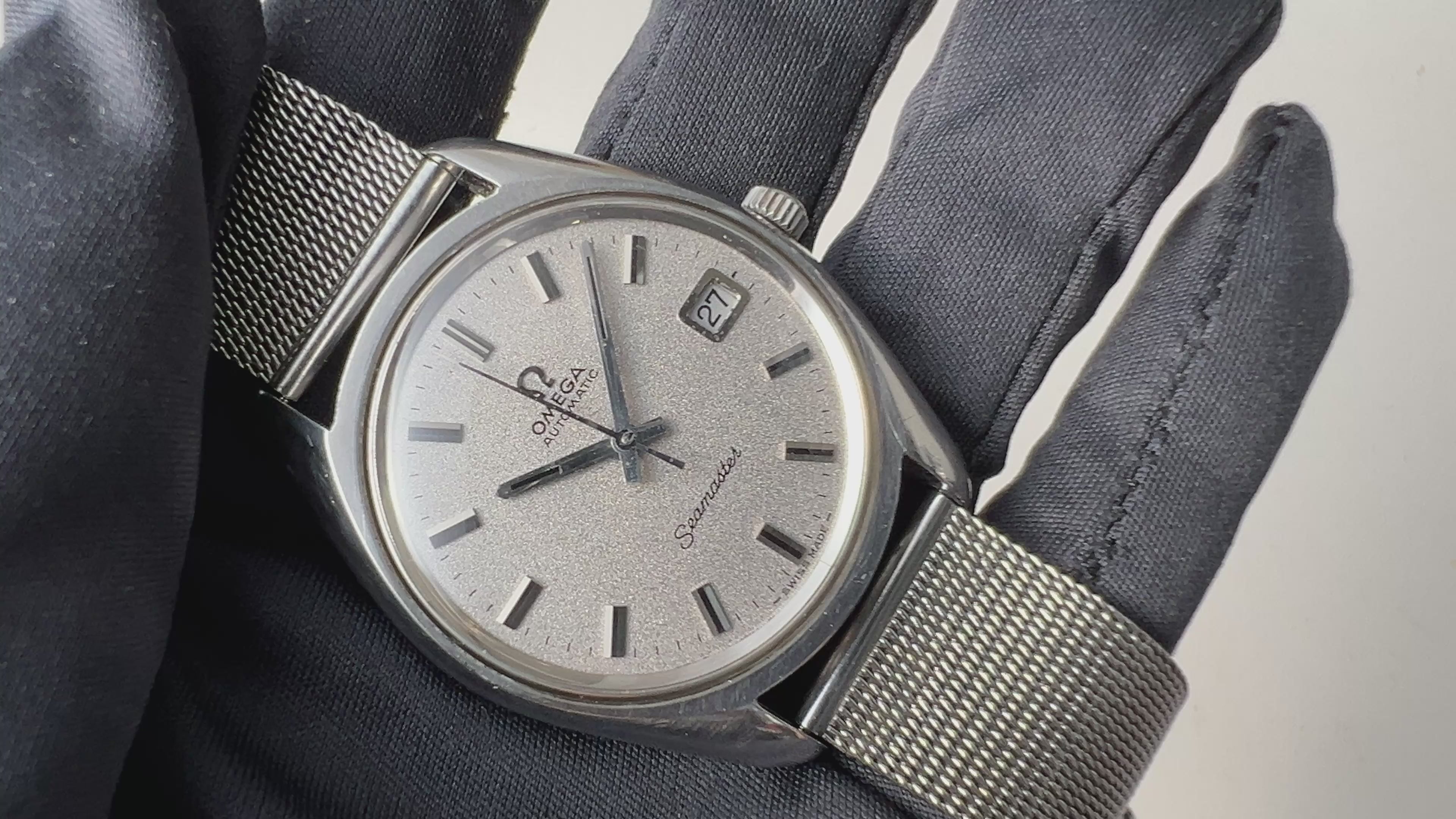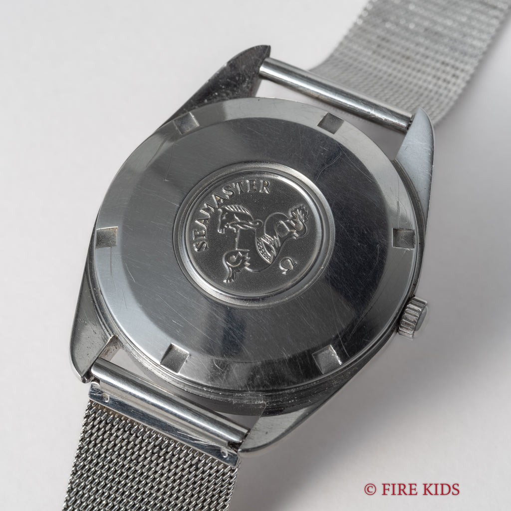 1969年製のオメガ「シーマスター」です。ステンレスのケースに梨地仕上げの文字盤とアップライトのバーインデックスのシンプルで飽きの来ない組み合わせです。キャリバーはオメガの名作自動巻き500系Cal.565を搭載。スワンネック式微動緩急針を持ち、高い精度の出る機械です。カレンダーはリューズを2段引くと早送り可能です。文字盤に劣化は無く綺麗な状態を保っています。ケースは小傷等ございますが目立つ大きな傷はございません。手巻きや針回しの操作はスムースです。ブレスは純正のメッシュブレスを合わせています。