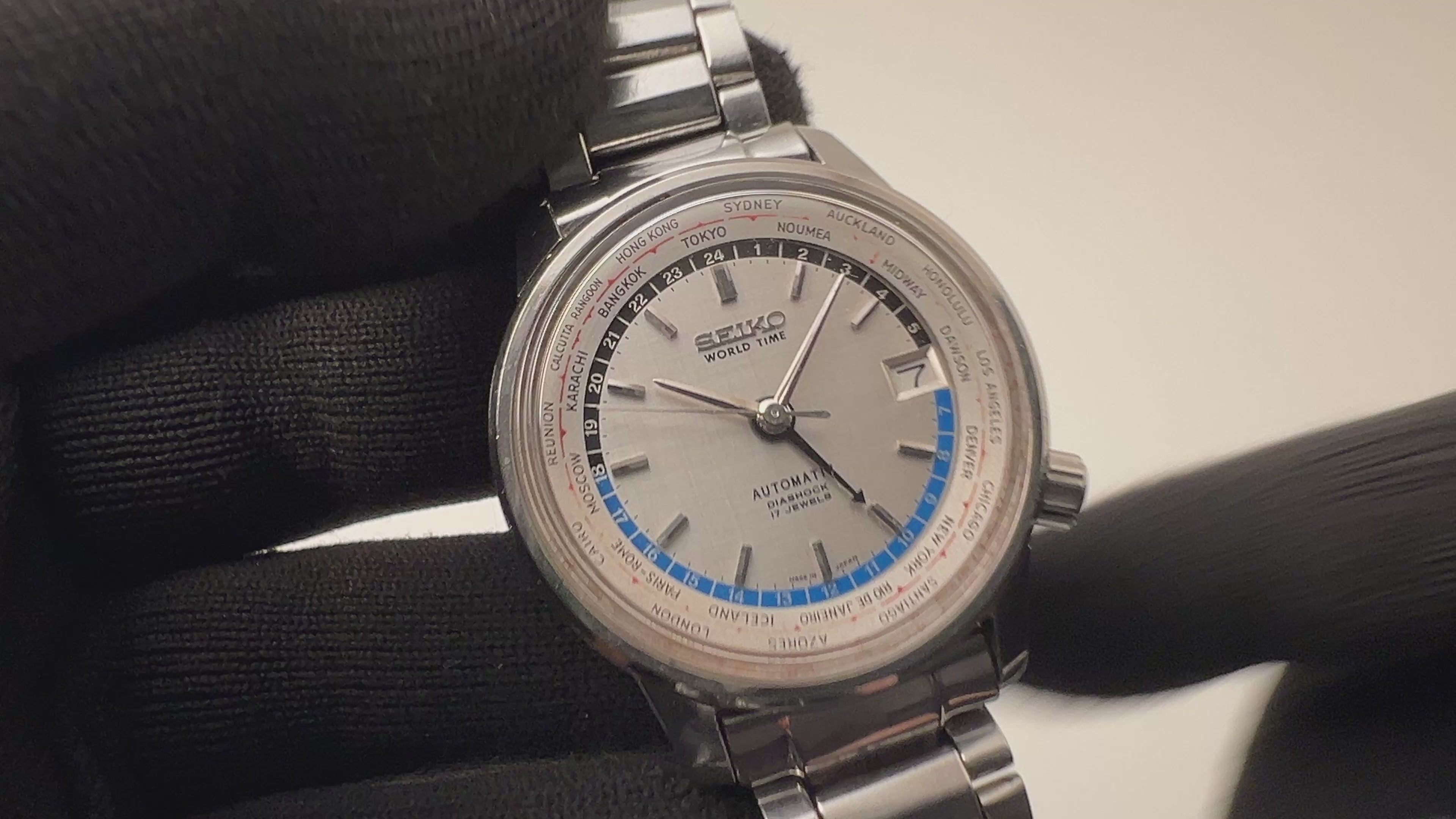 セイコー ワールドタイム ファーストモデル 1964年製 Ref.6217-7000 自動巻 ステンレスブレスです。 1964年に東京オリンピックに合わせて販売されたモデルでインナーベゼルには世界中の各主要都市が書かれて世界中の時間を知ることができるオリンピックにふさわしいモデルです。4時の位置のリューズでインナーベゼルを回転させることができます。ムーブメントは自動巻きのCal.6217Aを搭載。ケースは小傷あります大きなダメージはありません。ベルトは純正のステンレスブレスが取り付けてあります。