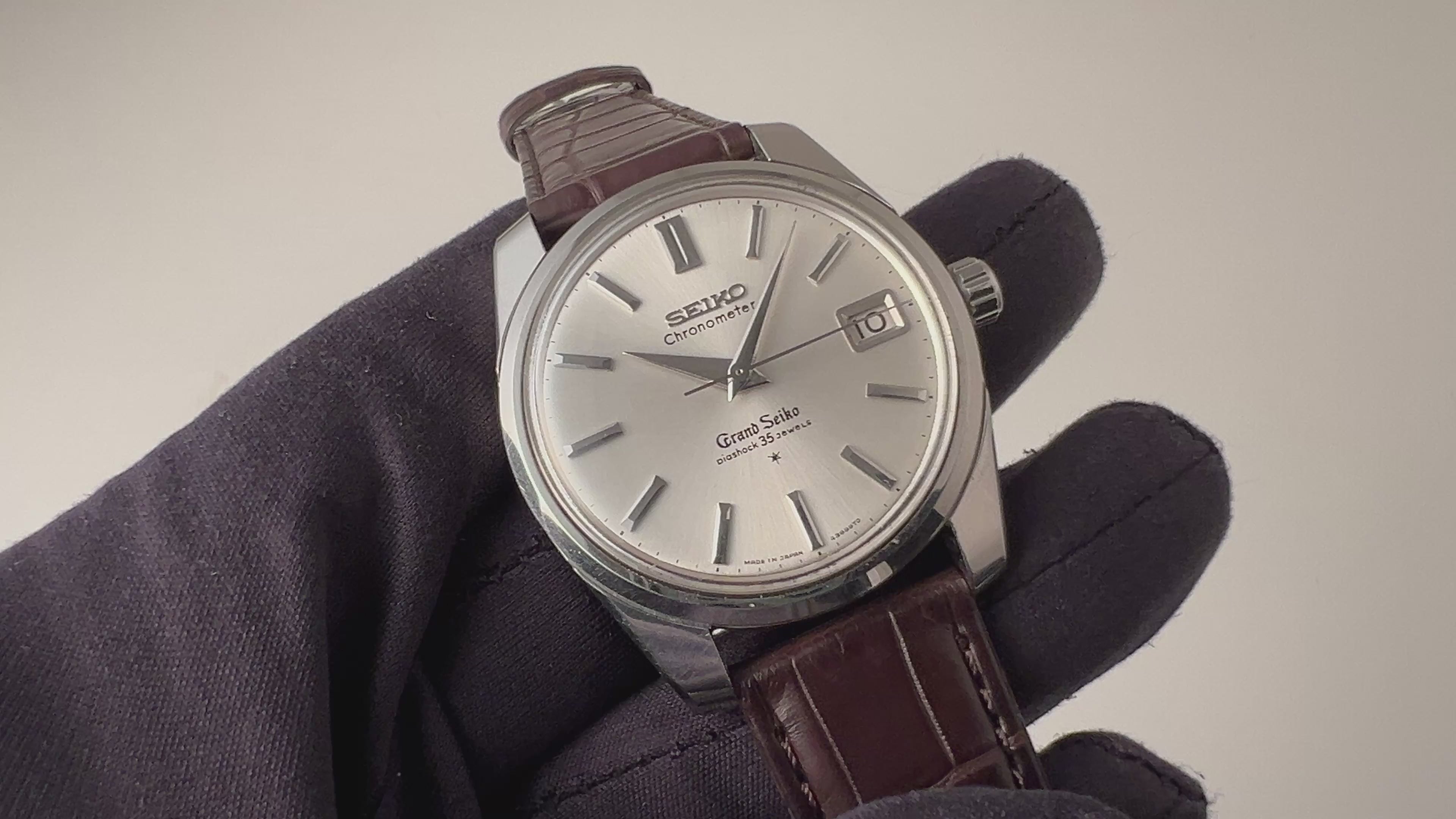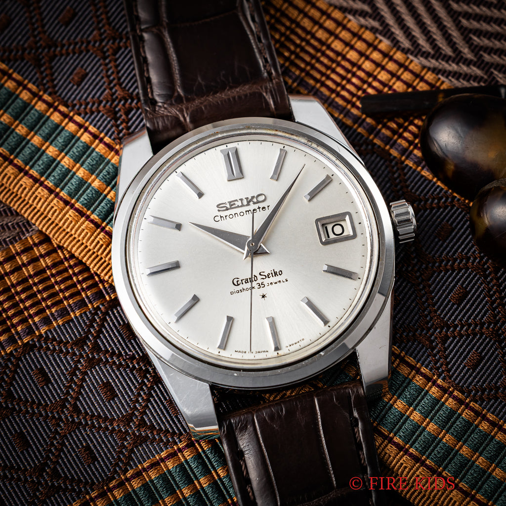グランドセイコー セルフデーター 1964年製 Ref.43999 GS2nd 初期 ライオンメダル ロービート手巻です。グランドセイコーの第2世代セルフデーター前期型になります。ステンレスケースにスクリューバック、日付早送り機能の搭載など実用性がアップしたモデルです。文字盤、ケース共に状態の良い個体です。ムーブメントは手巻き35石のCal.430を搭載。手巻きや針回しの操作はスムースです。ベルトはファイアーキッズオリジナルの革ベルトを合わせています。ベルトはファイアーキッズオリジナルのクロコダイル革ベルトが取り付けられています。