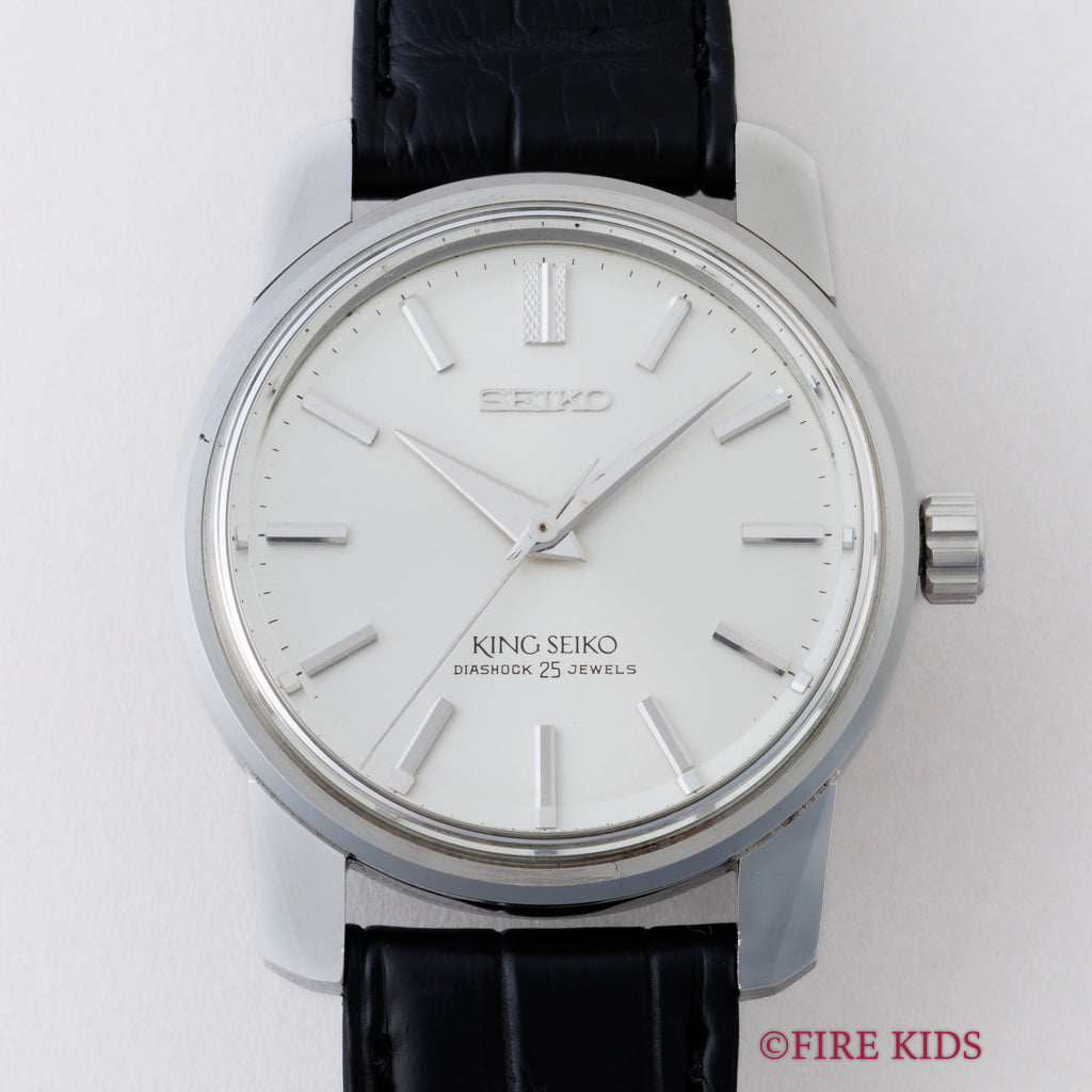 1965年製の44キングセイコー手巻きモデルです。人気のノンデイトで亀戸工場で製造されたキングセイコーのセカンドモデルの前期型にあたります。セイコーらしい堅実なデザインで裏ブタのメダリオンもキレイな状態です。手巻きの機械を搭載し、鎌形の秒針規制装置が特徴です。ダイヤルは大きなダメージ無く全体的に綺麗です。ケースは小傷と裏蓋に若干腐食があります。手巻きや針回しの操作はスムースです。ベルトはファイアーキッズオリジナルクロコダイル革ベルトが取り付けてあります。