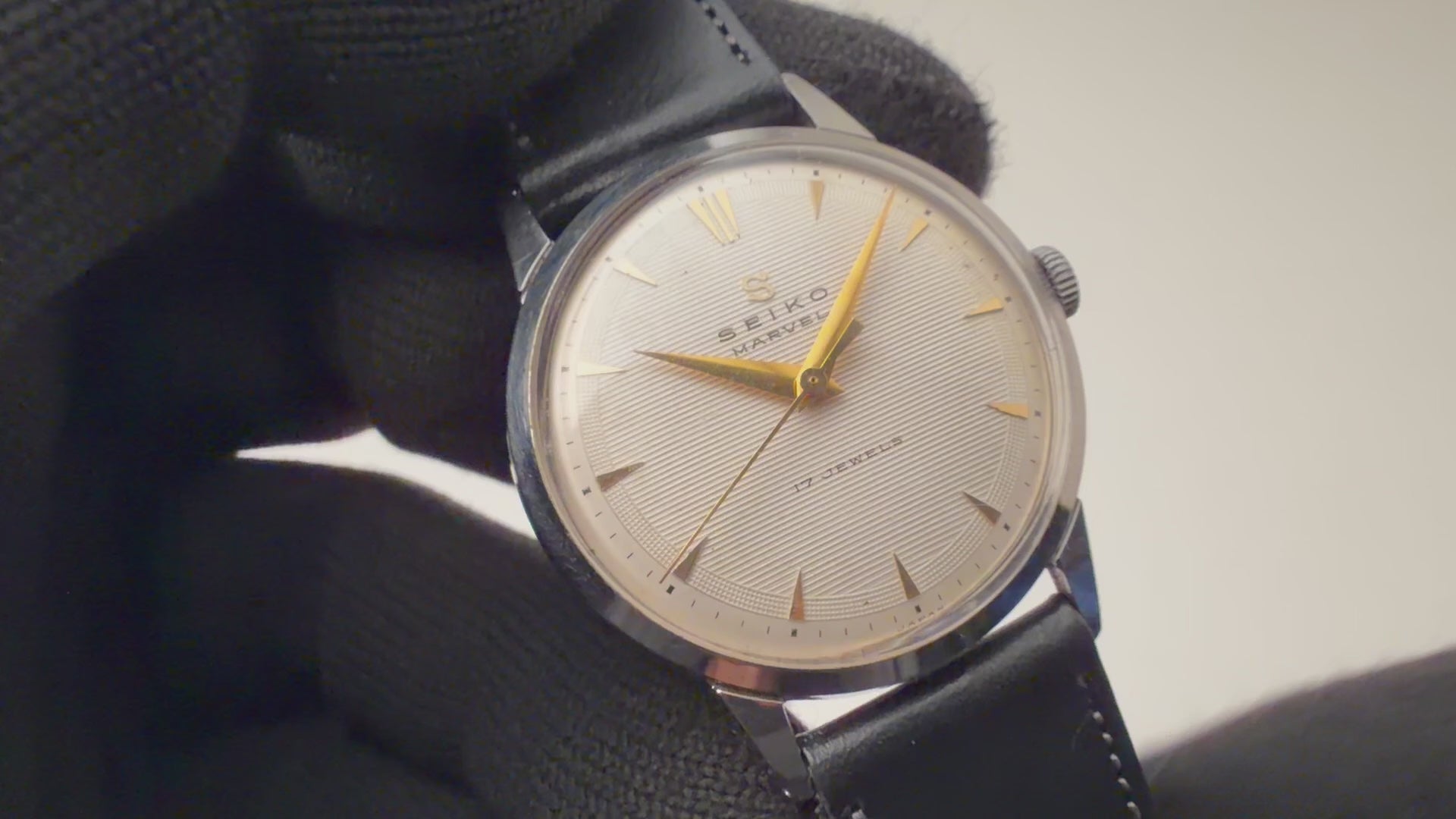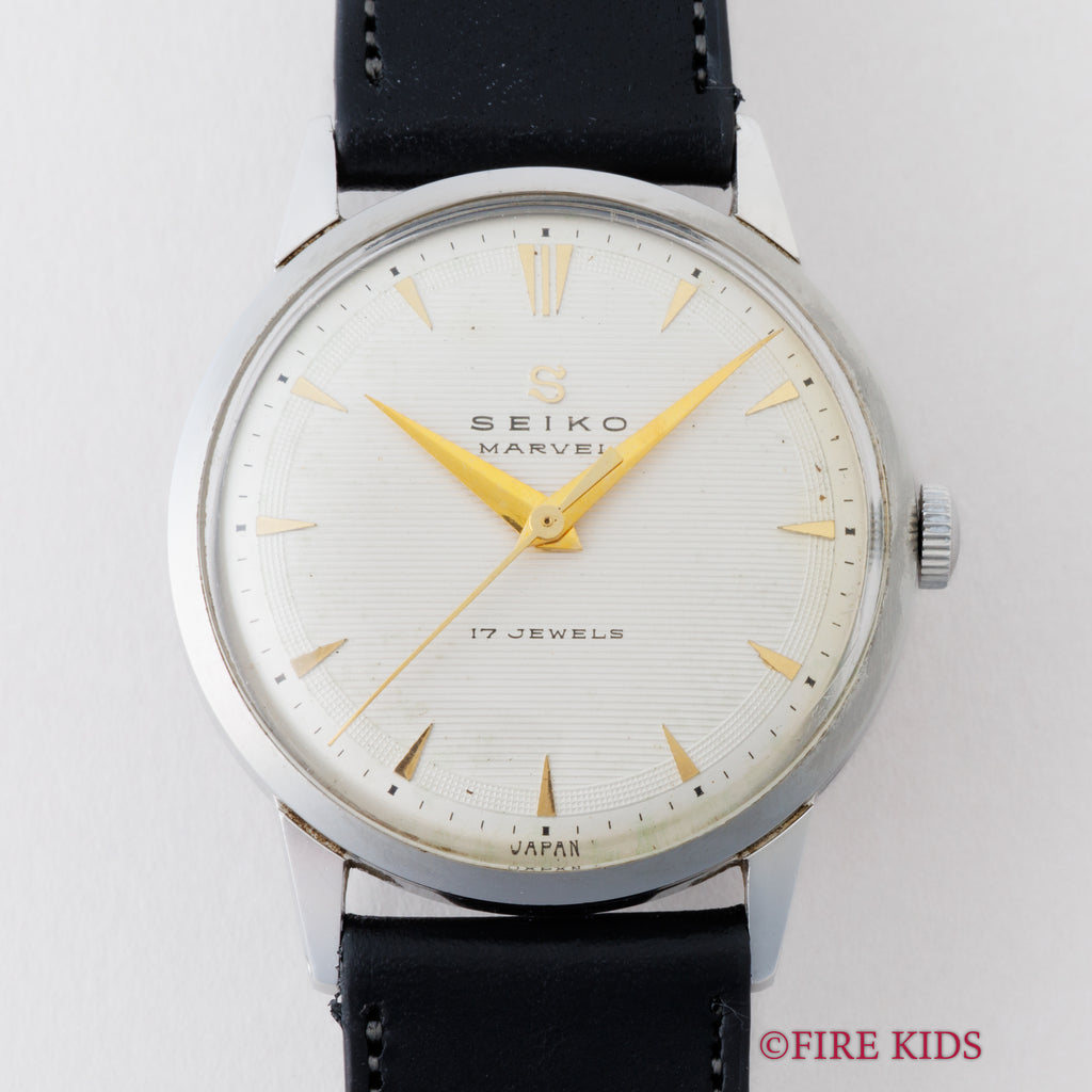 セイコー マーベル Ref.14025 1957年製 変わり文字盤 手巻きです。様々な文字盤バリエーションがあるマーベルの中でもストライプとギョーシェ彫りを組み合わせたあまり見る機会の無い一本です。年代なりの経年はありますが雰囲気は良いです。ケースは小傷程度です。ベルトはファイアーキッズオリジナルのブッテーロカーフレザーを合わせています。手巻きや針回しはスムーズです。