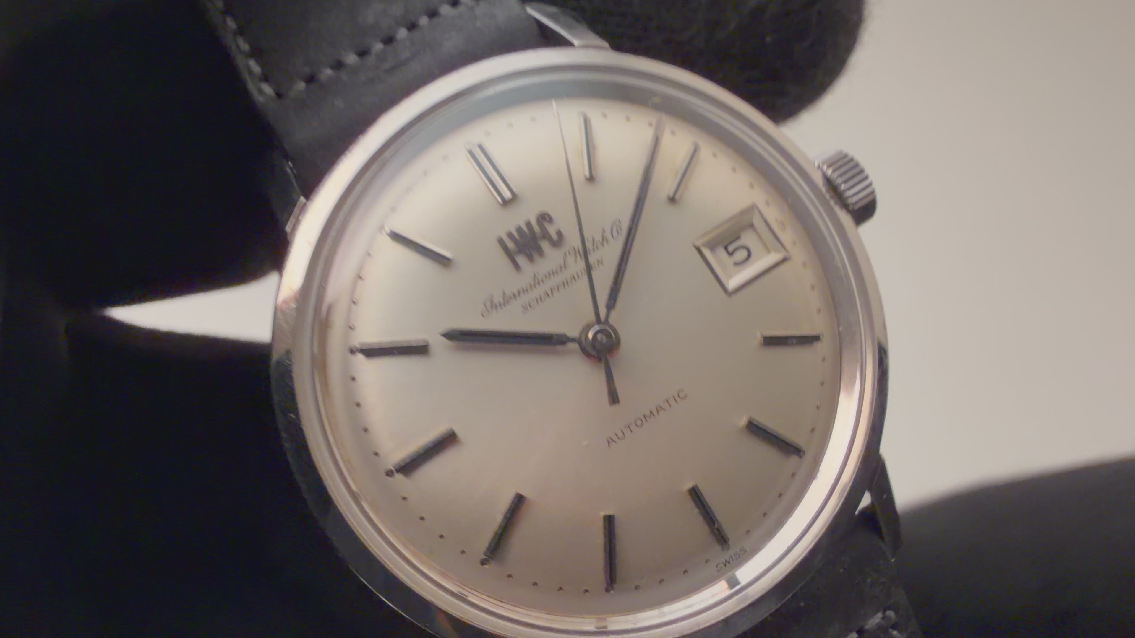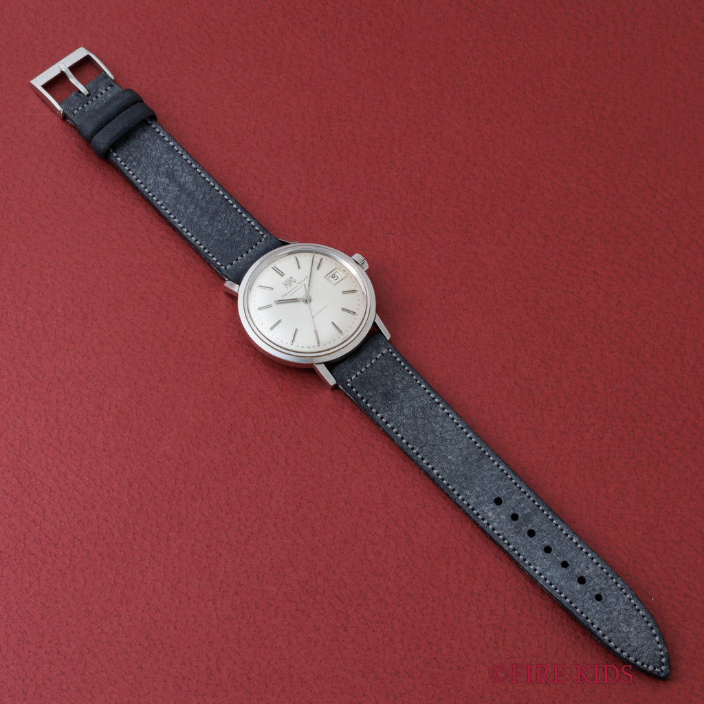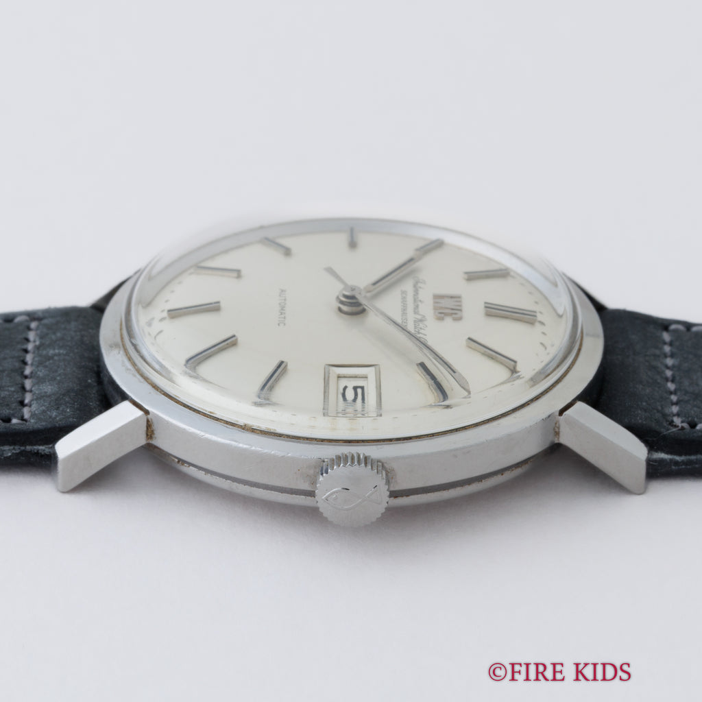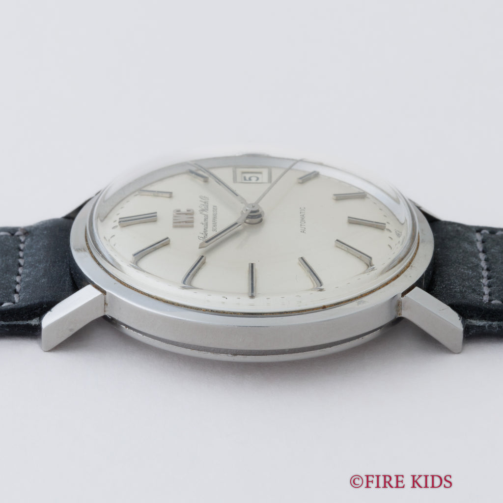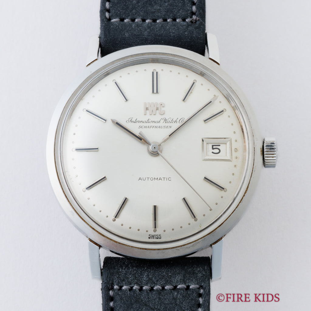 1972年製のIWCラウンドケースオートマチックモデルです。ラウンドケースに3針、シルバーダイヤルのシンプルで飽きの来ないデザインです。IWCのアップライトのロゴと筆記体のレターが両方入るダイヤルは、非常に良いコンディションです。ムーブメントはペラトン式自動巻きのCal.8541B搭載しております。ケースは小傷はございますが大きなダメージはございません。手巻きや針回しの操作はスムーズです。ベルトはアキュレイトフォルムのレザーベルトが取り付けてあります。