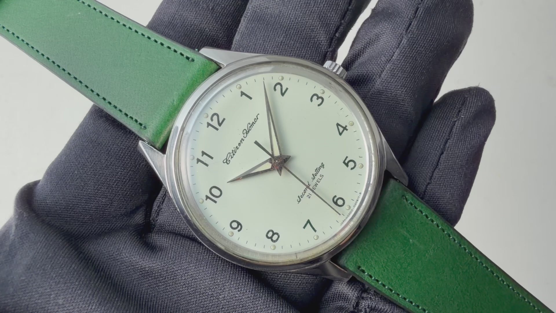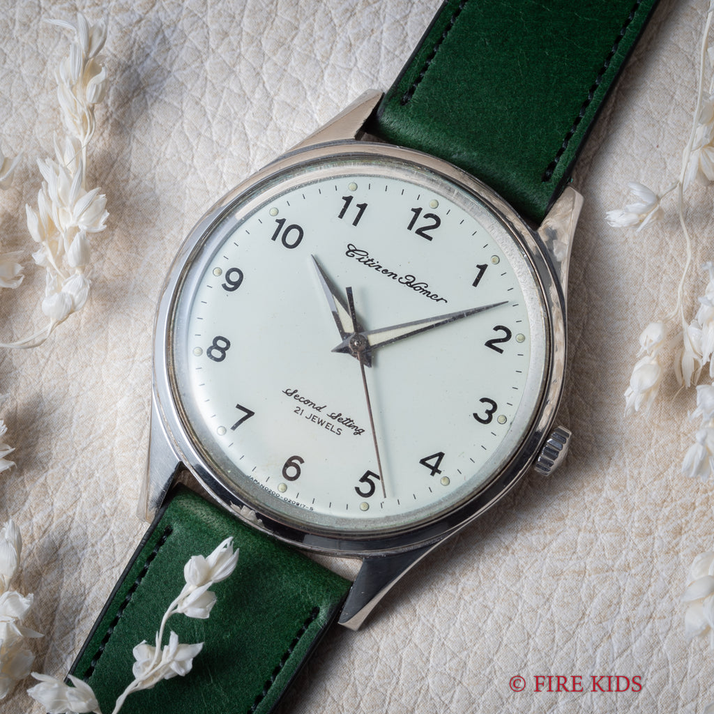シチズン ホーマー 国鉄 1976年製 千葉鉄道管理局 鉄道時計 手巻き 秒針規制装置 昭和51年の入荷になります。国鉄時代に職員に支給されていた鉄道時計です。アイボリー文字板は視認性の高いアラビア数字に夜光がのったドルフィンハンドで裏ブタには「昭51」「腕 個体番号2桁」「千鉄」の文字が刻印されています。ムーブメントは手巻きのCal.1160を搭載。手巻きや針回しの操作はスムーズです。ベルトは社外の革ベルトが取り付けてあります。