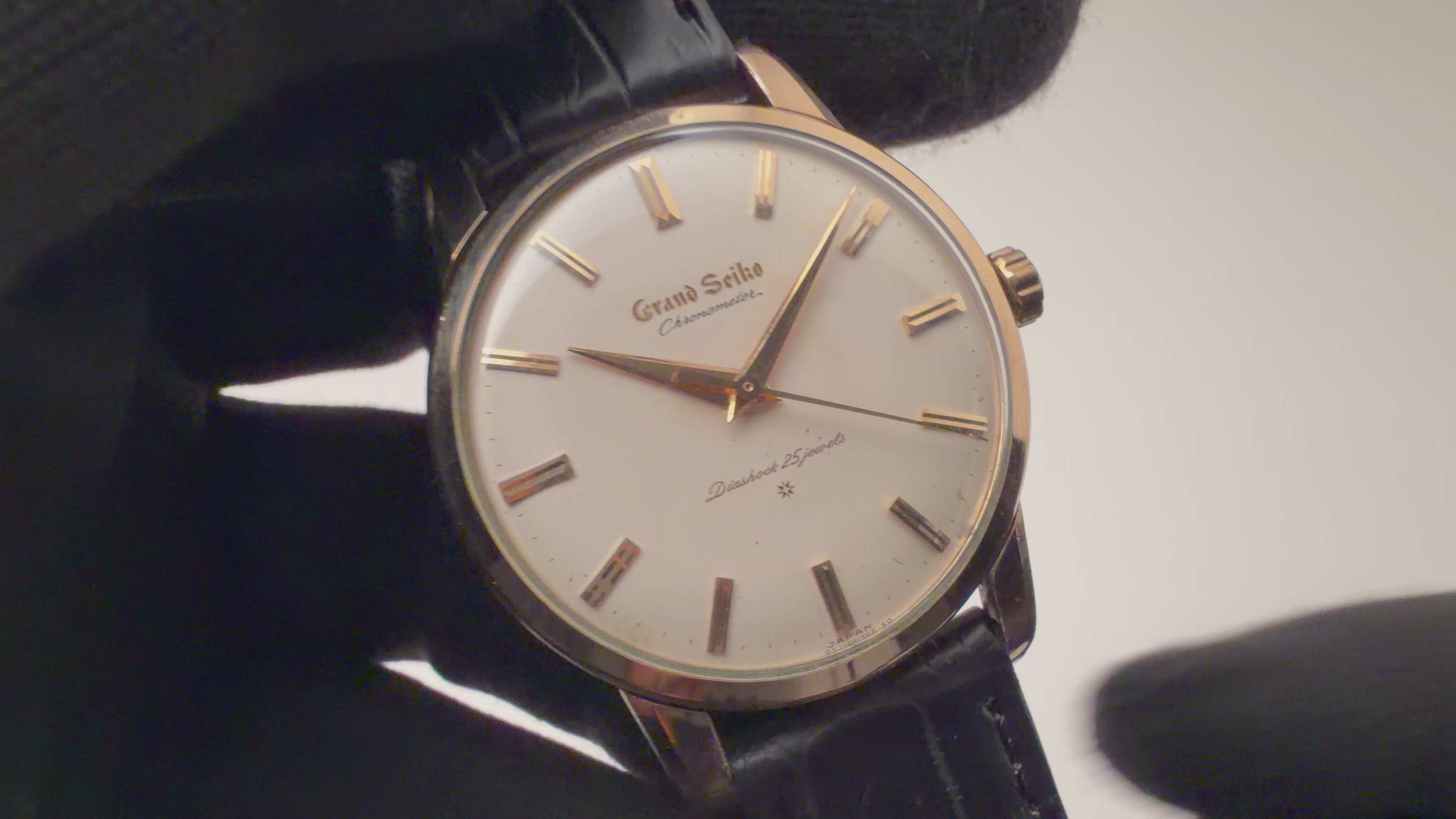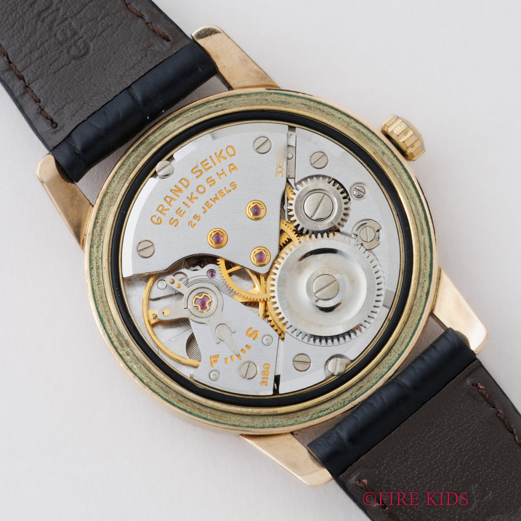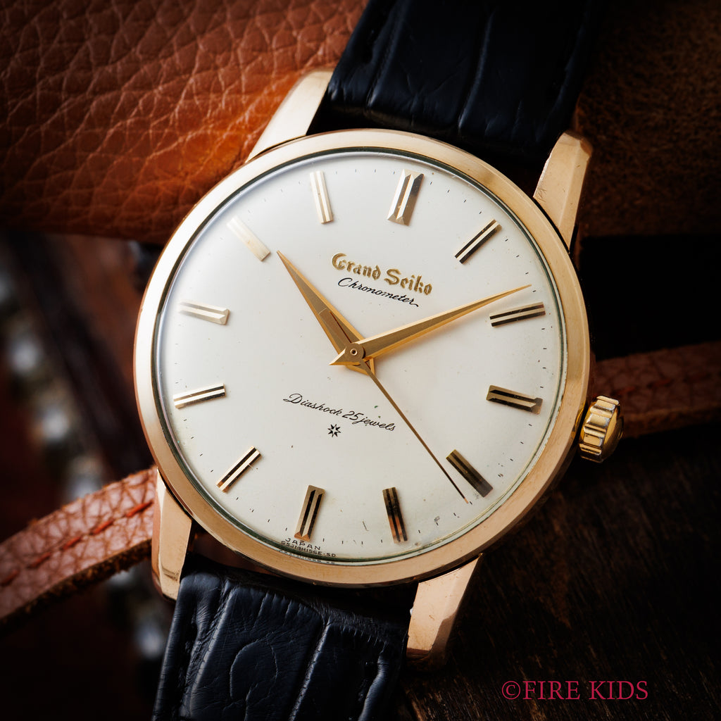グランドセイコー ファーストモデル 1963年製 Ref.J14070 GS アップライトロゴです。グランドセイコー1stモデルは、1960年から1963年の3年間だけ製造され、こちらの文字盤は、後期型で『GRAND SEIKO』の文字がアップライト仕様のものになります。ダイヤルの4時位置に経年変化が見られますが、概ね良好なコンディションです。14金80ミクロンの金張りケースは、大きなダメージもなく、ライオンメダリオンはしっかり残っています。手巻きや針回しの操作には問題ありません。ベルトはファイアーキッズオリジナル、クロコダイルが取り付けられています。