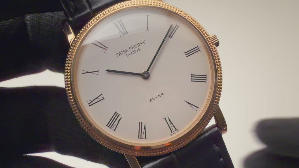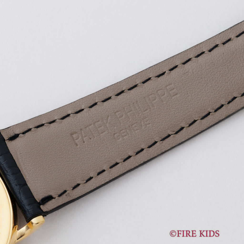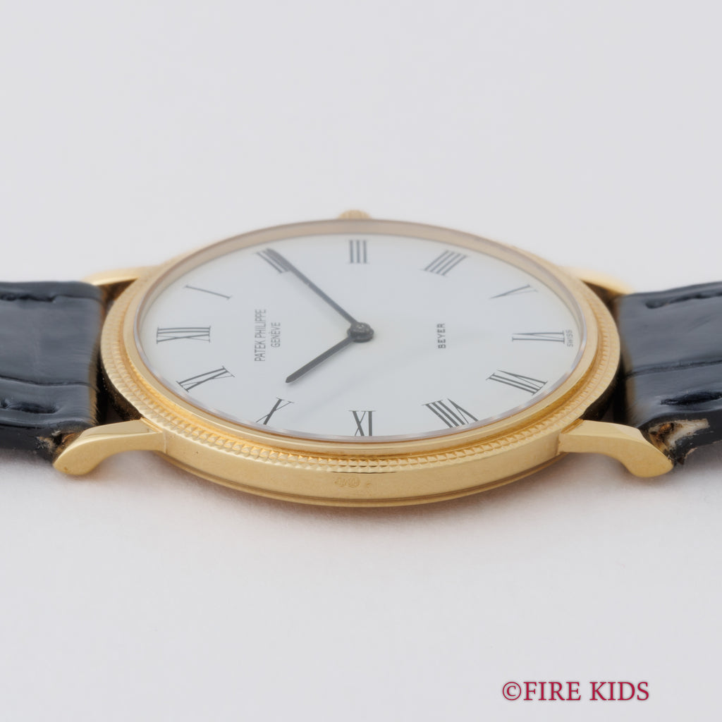 パテックフィリップ 1990年代製 18金無垢イエローゴールド Ref.3520/D ラウンドケース ホワイトローマンダイヤル ベイヤーWネーム 手巻き 純正革ベルト、尾錠付き