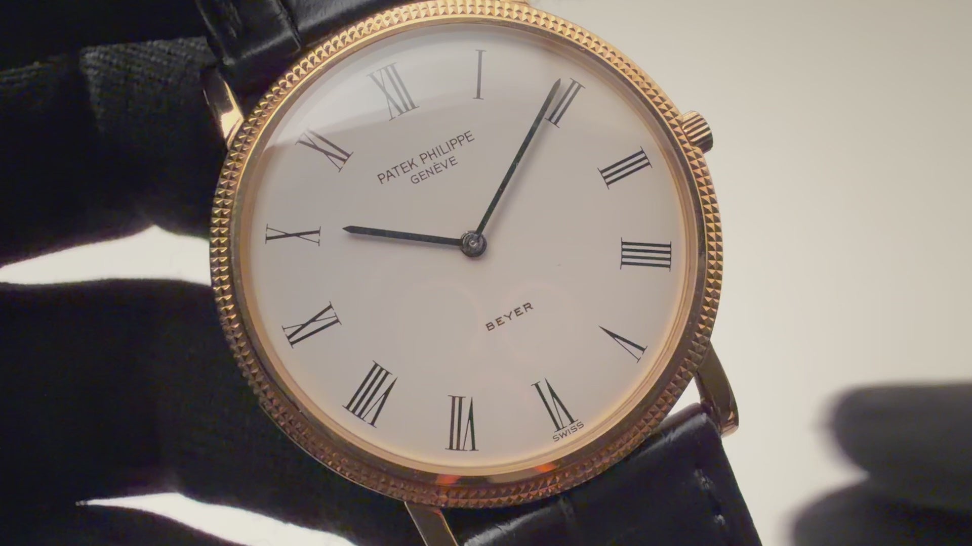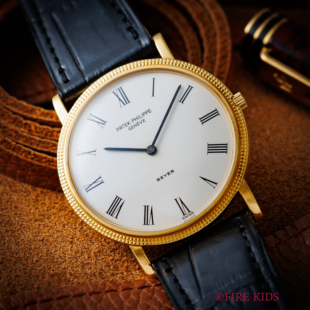パテックフィリップ 1990年代製 18金無垢イエローゴールド Ref.3520/D ラウンドケース ホワイトローマンダイヤル ベイヤーWネーム 手巻き 純正革ベルト、尾錠付きです。スイスの宝飾店、ベイヤーとの珍しいWネーム個体で、18金無垢イエローゴールドケースはクルドパリ仕上げと呼ばれるベゼルにホワイトローマンダイヤルが上品な印象です。文字盤とケース共に気になるダメージのない良好なコンディションです。ムーブメントはCal.177を搭載、コートドジュネーブ仕上げが施された高級機です。ベルトは純正革ベルトに純正尾錠が付いています。