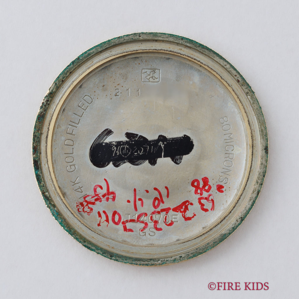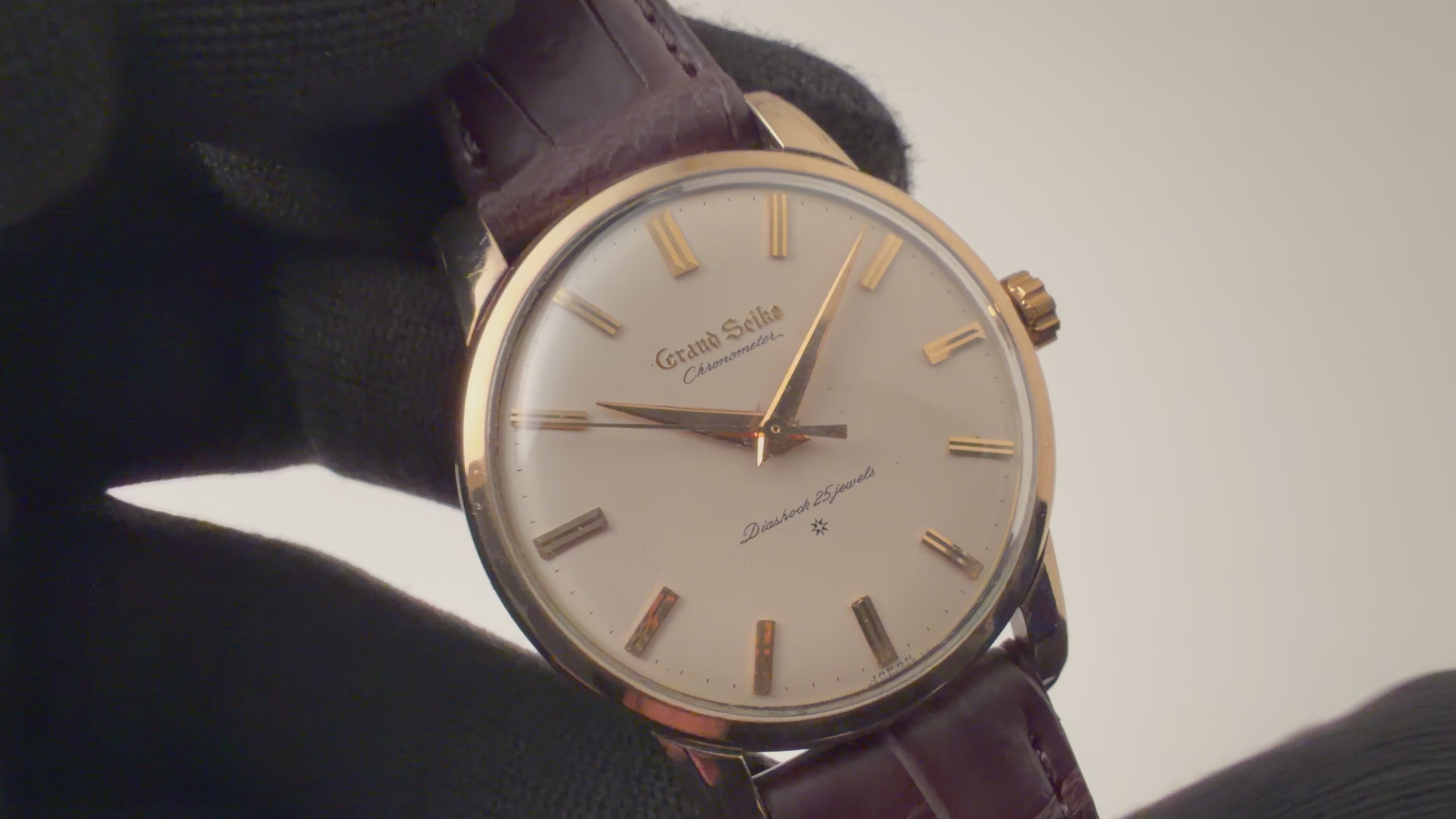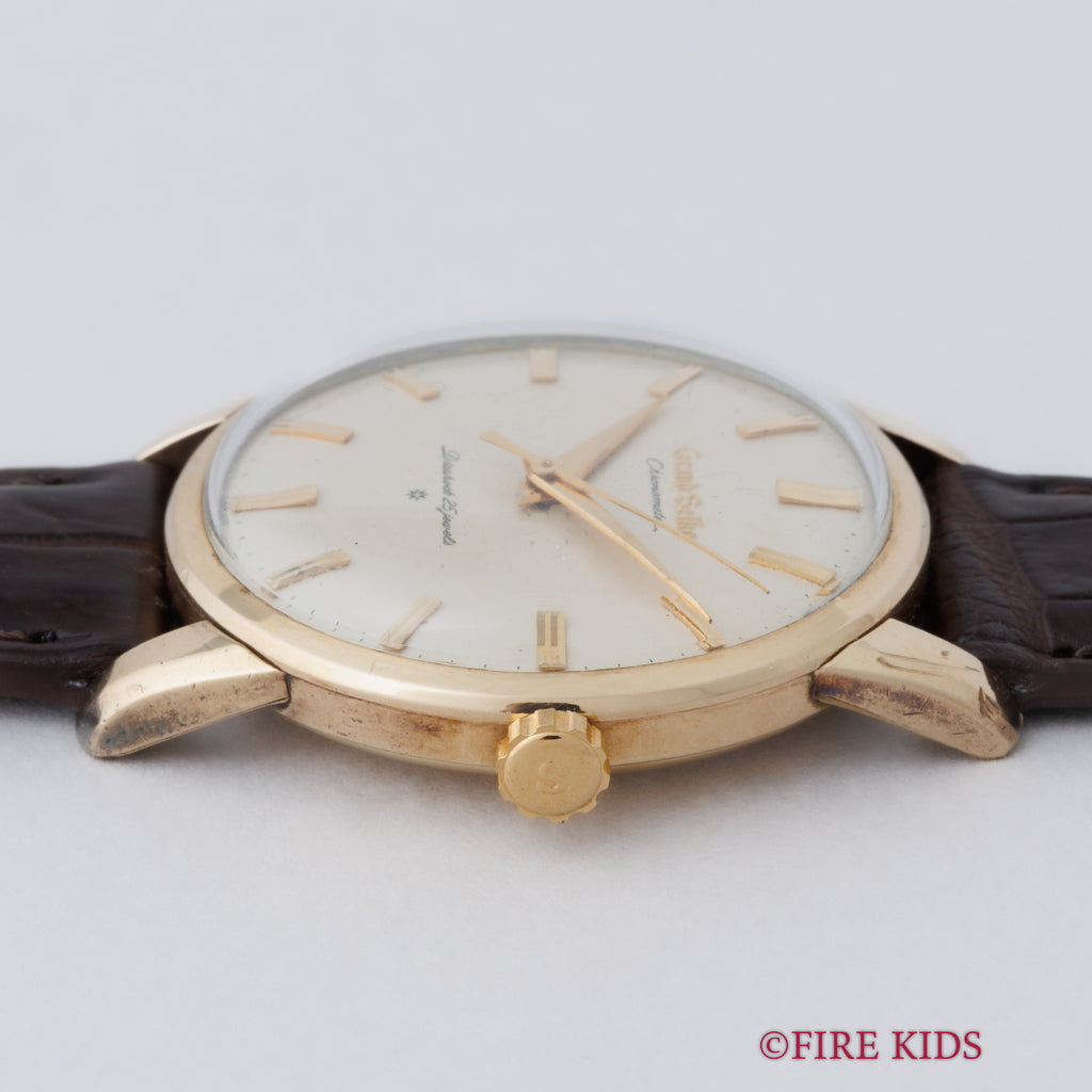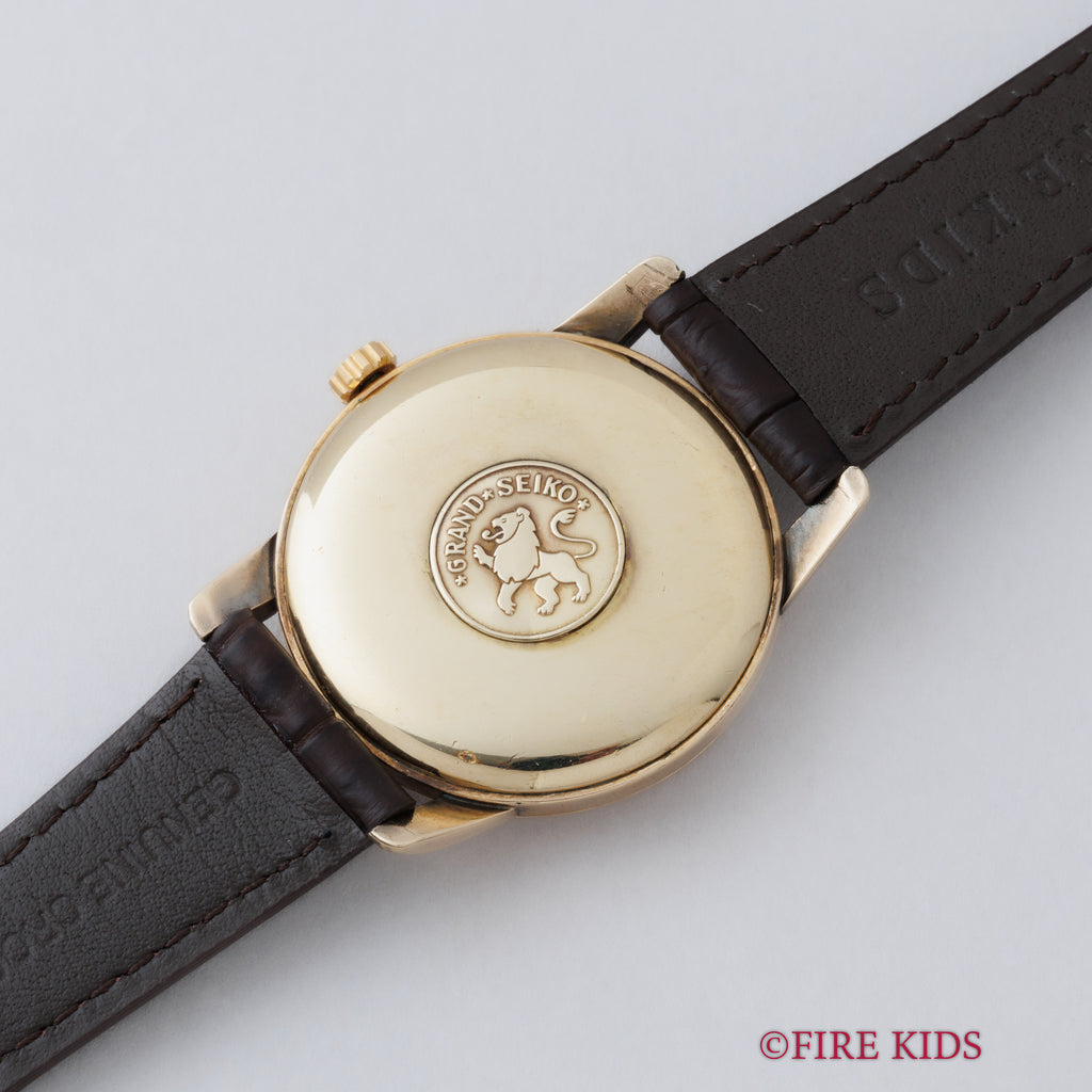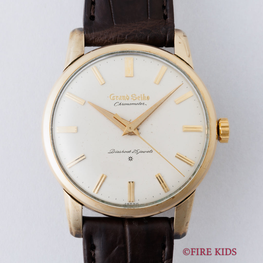 グランドセイコー ファーストモデル 1962年製 Ref.J14070 GS アップライトロゴです。グランドセイコー1stモデルは、1960年から1963年の3年間だけ製造され、こちらの文字盤は、後期型で『GRAND SEIKO』の文字がアップライト仕様のものになります。ダイヤルは多少経年は見受けられますが大きなダメージはありません。14金80ミクロンの金張りケースは、大きなダメージもなく、ライオンメダリオンはしっかり残っています。手巻きや針回しの操作には問題ありません。ベルトはファイアーキッズオリジナル、クロコダイルが取り付けられています。