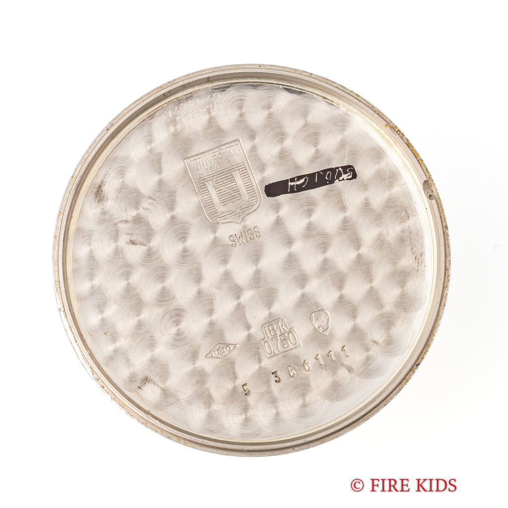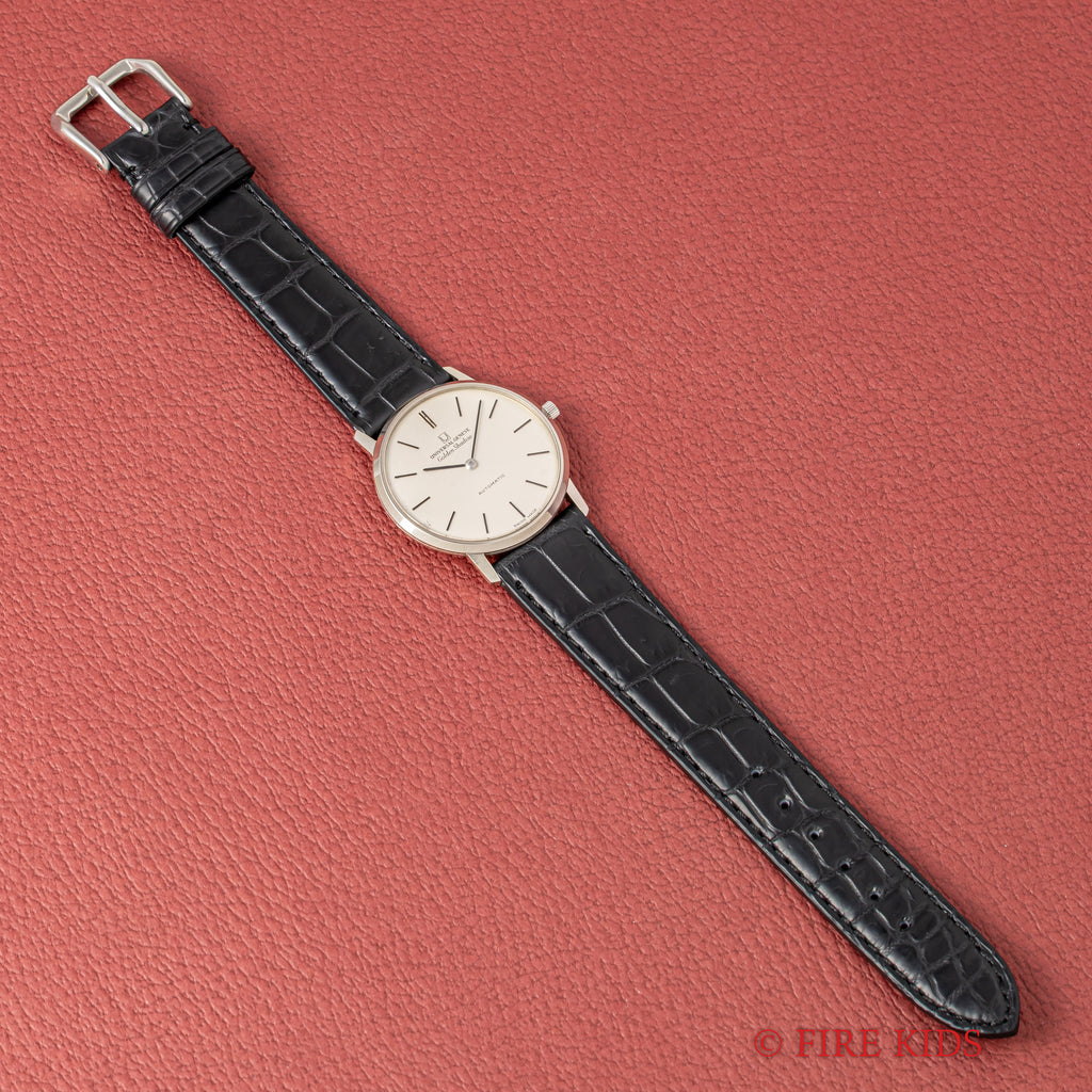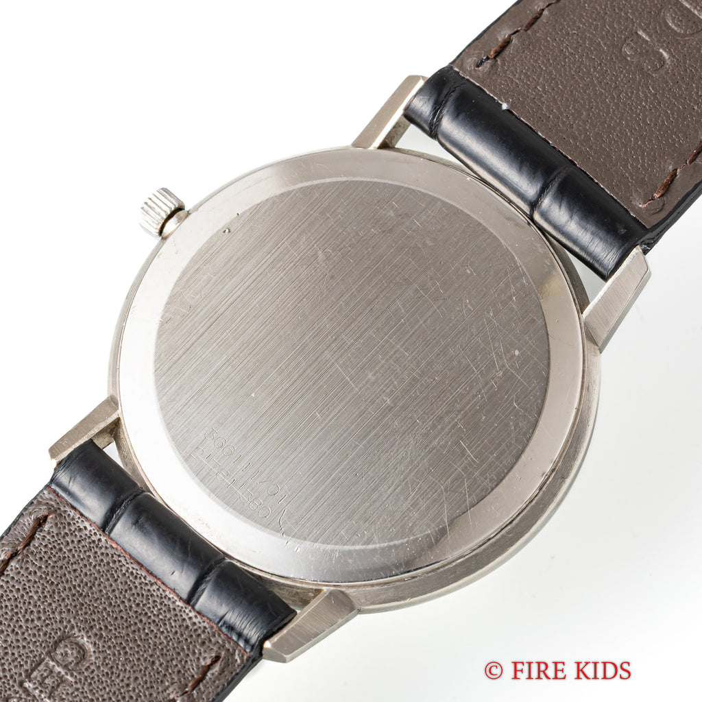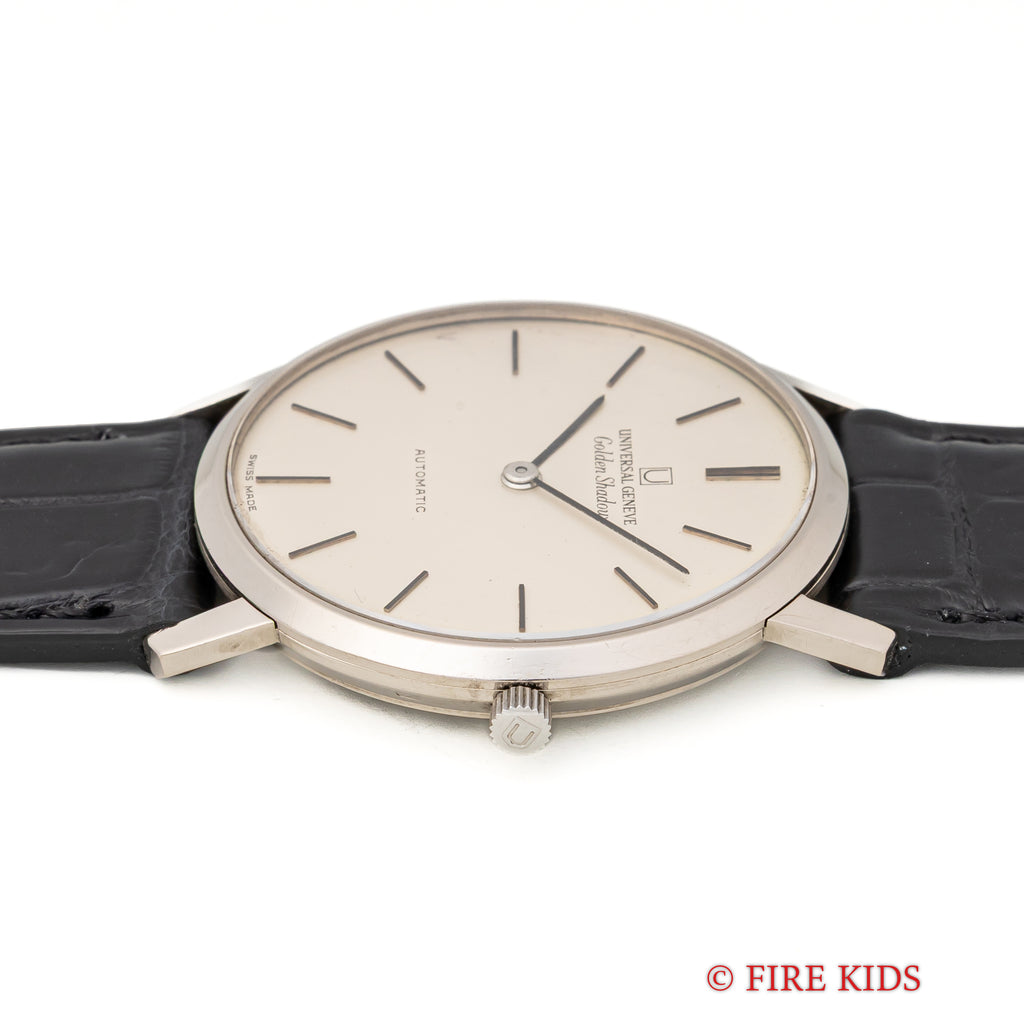 ユニバーサル ジュネーブ ゴールデンシャドウ 18金無垢 1967年製 マイクロローター自動巻きです。118KWGのラウンド型の薄型ステンレスケースでマイクローターを搭載し、この薄さでありながら自動巻きを実現させています。シンプルなラウンドケースのデザインで腕乗りの良い時計です。ムーブメントは抜群の仕上がりの自動巻きCal.2-66を搭載。手巻きや針回しの操作はスムースです。ケースは小傷はございますが大きなダメージはございません。ベルトはファイアーキッズオリジナルのクロコダイル革ベルトが取り付けてあります。