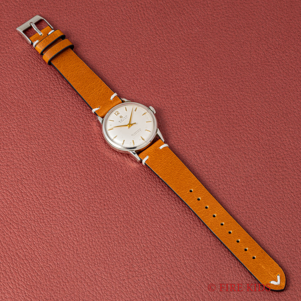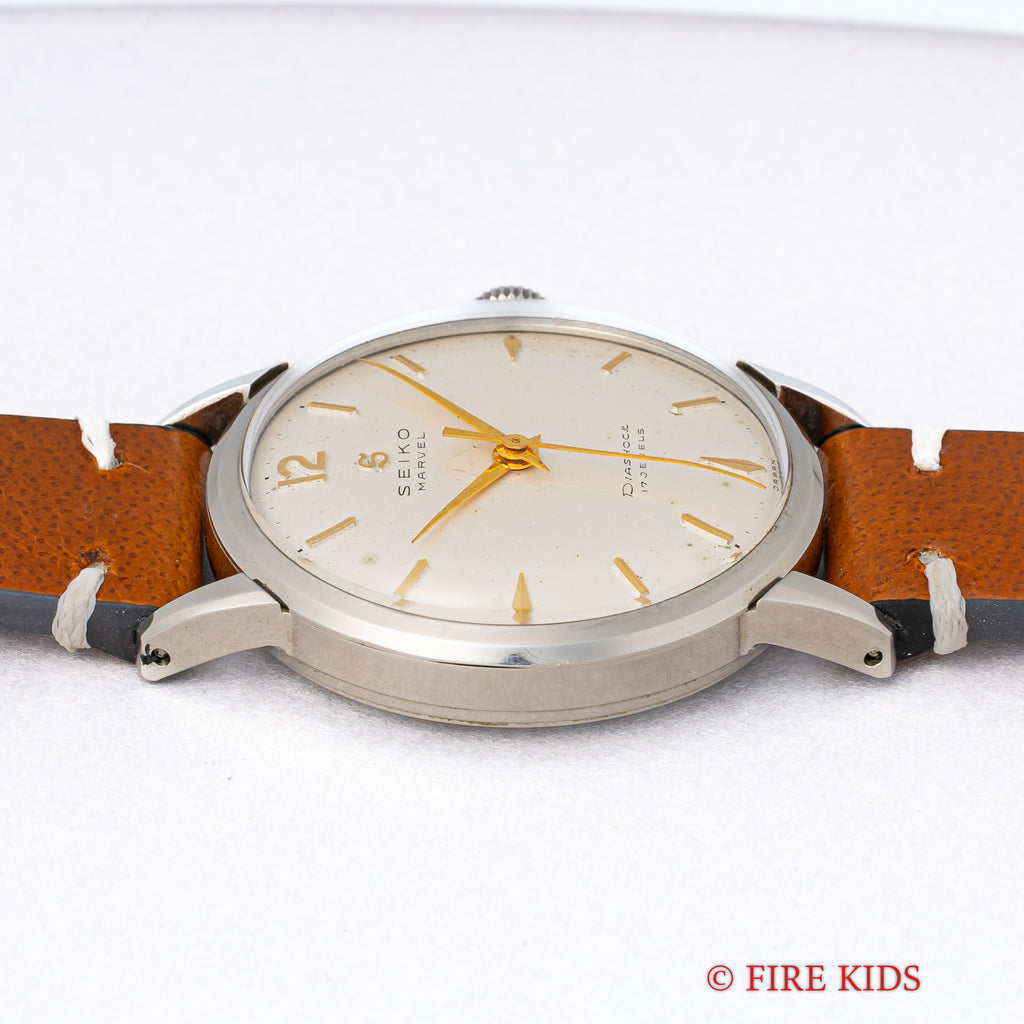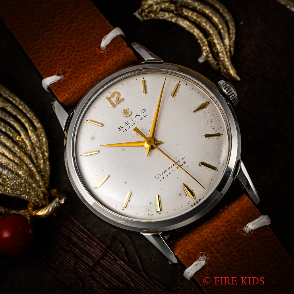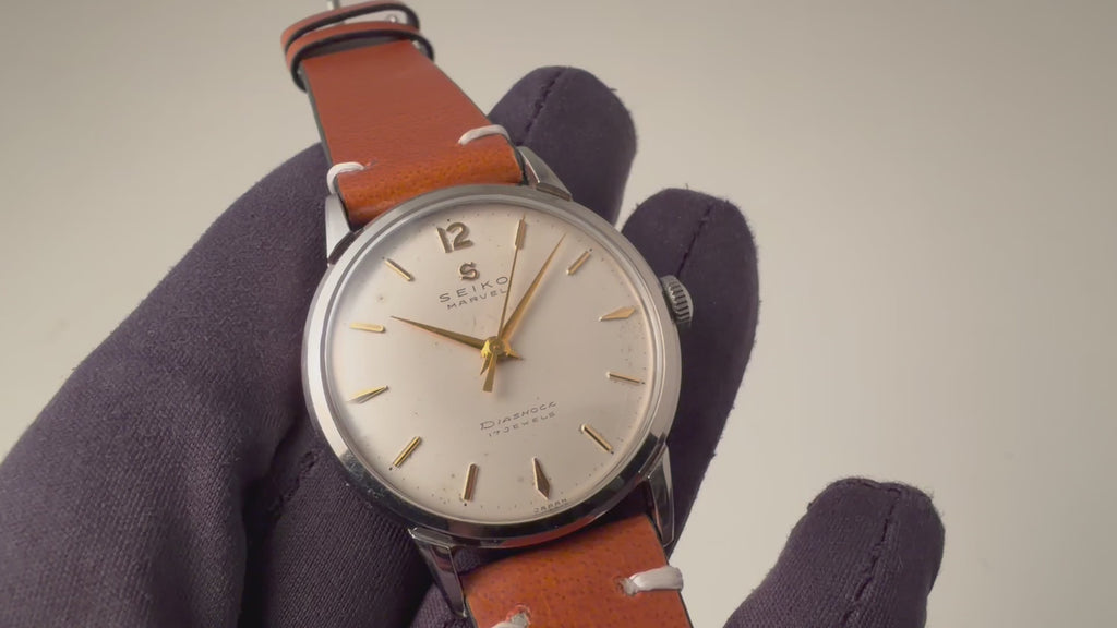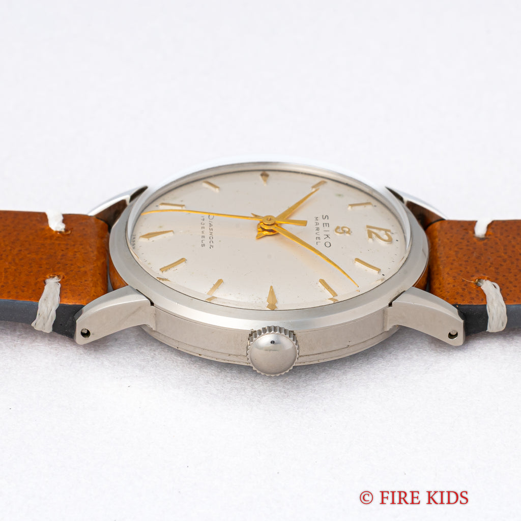 1950年代製のセイコーマーベルが入荷しました。こちらは12時にSマークがあるセイコーマーベルの初期型です。12時位置のSマークは通称「蛇S」と呼ばれており、掘り込み式のSマークです。裏蓋にはDUSTPROOFの表記がりスクリューバックの裏蓋を採用されています。文字盤は若干のヤケ等ありますが良好なコンディションです。手巻きや針回しはスムースです。革ベルトは社外新品を装着しております。