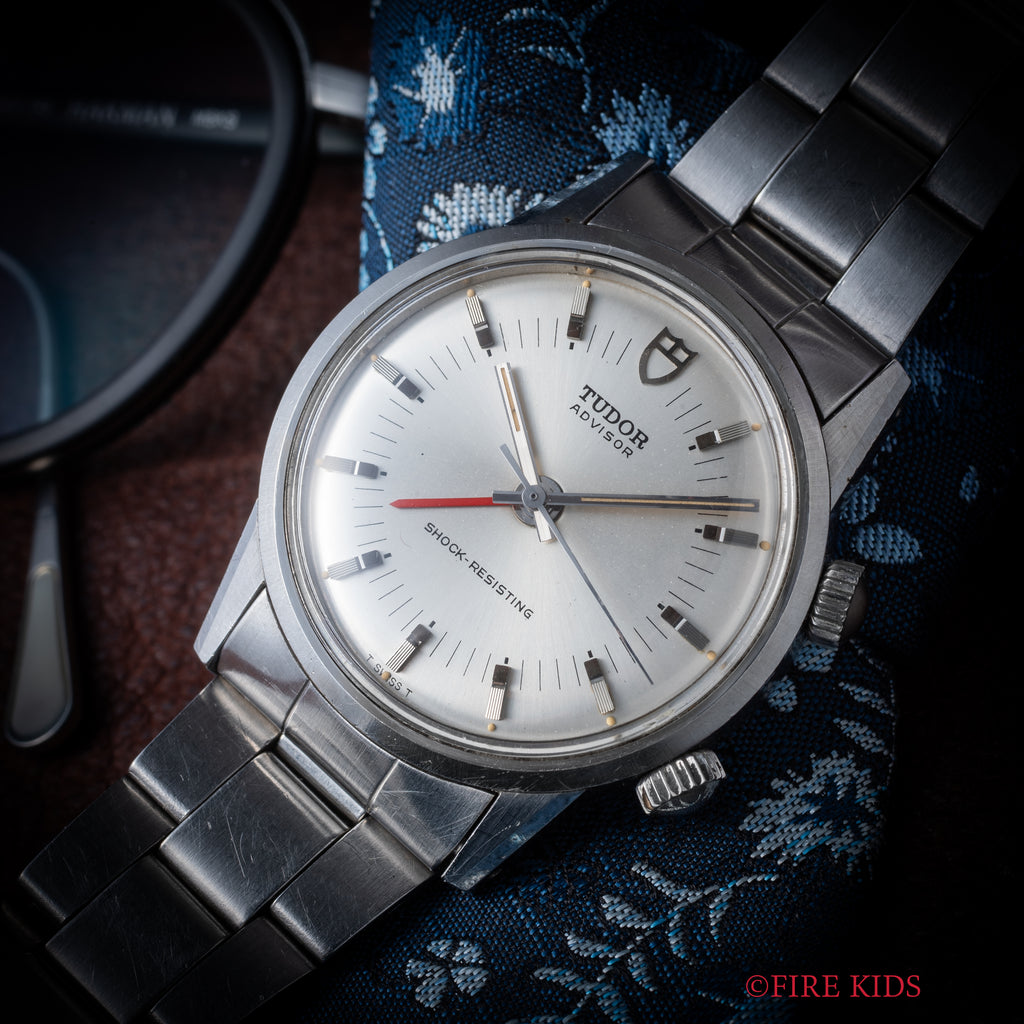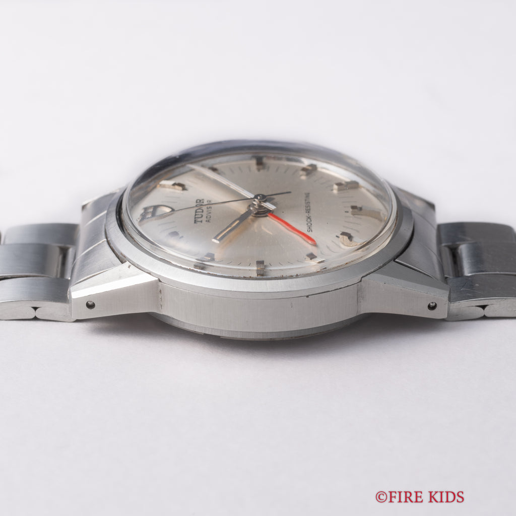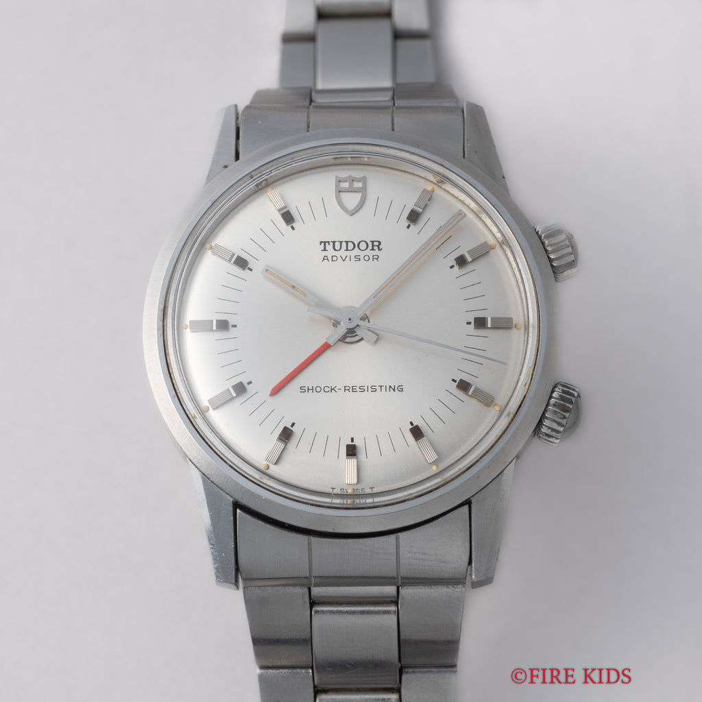チューダー アドバイザー アラームウォッチ Ref.10050 1982年製が入荷いたしました。チューダー唯一のアラーム機能を搭載したモデル「アドバイザー」で、専用のケースに収められているためより特別感があります。赤のアラーム針がシルバーでまとめられた文字盤に映える顔立ちです。シンプルながらもインデックスは植字で立体感があり、縦のライン・カット・鏡面と三種類の仕上げが施されている点に細かなこだわりを感じます。二つあるリューズの2時位置側でアラーム針の操作とアラームの巻き上げ、4時位置側で時分針の操作と主ゼンマイの巻き上げを行います。小傷はありますがケースのヘアラインやカットはしっかりと残っています。手巻きや針回しはスムーズです。ブレスはロレックスの巻きブレスが取り付けてあります。