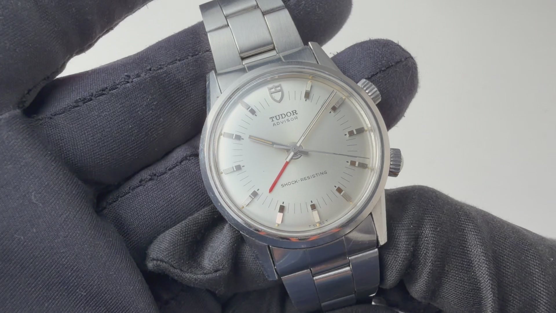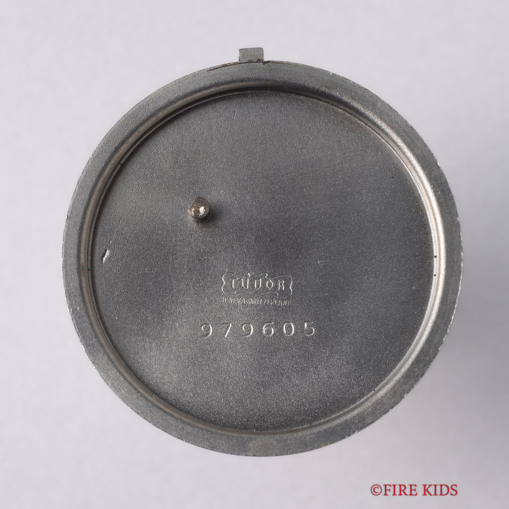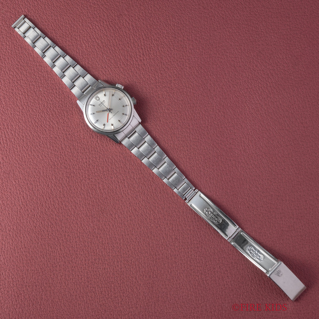 チューダー アドバイザー アラームウォッチ Ref.10050 1982年製が入荷いたしました。チューダー唯一のアラーム機能を搭載したモデル「アドバイザー」で、専用のケースに収められているためより特別感があります。赤のアラーム針がシルバーでまとめられた文字盤に映える顔立ちです。シンプルながらもインデックスは植字で立体感があり、縦のライン・カット・鏡面と三種類の仕上げが施されている点に細かなこだわりを感じます。二つあるリューズの2時位置側でアラーム針の操作とアラームの巻き上げ、4時位置側で時分針の操作と主ゼンマイの巻き上げを行います。小傷はありますがケースのヘアラインやカットはしっかりと残っています。手巻きや針回しはスムーズです。ブレスはロレックスの巻きブレスが取り付けてあります。
