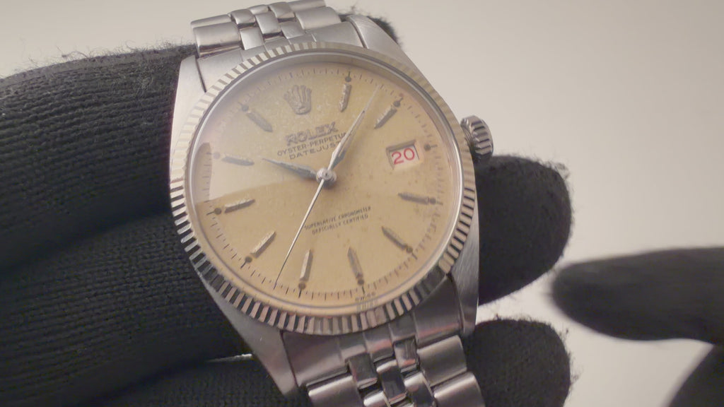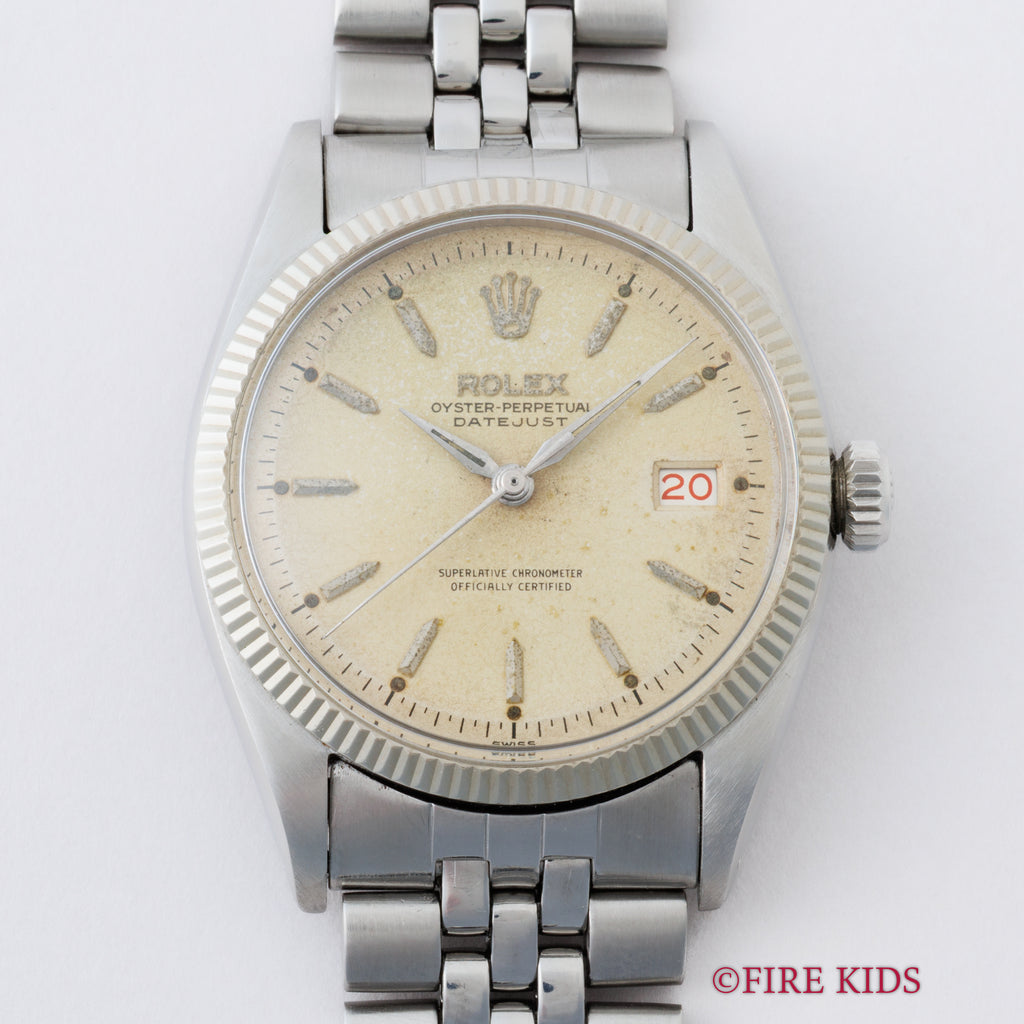 ロレックス デイトジャスト 1957年製 Ref.6605 シルバーダイヤル ドーフィンハンド USジュビリーブレスの入荷になります。ロングセラーの1601と違い6605は製造期間が僅か3年程度で希少種になっています。1601と比べて若干長いラグ足や刻みの細かいホワイトゴールド製フルーテッドベゼル等ヴィンテージの魅力が詰まっています。ケースは小傷が見られますが大きなダメージはありません。文字盤は表面の変色等が見られますが雰囲気が抜群の良い雰囲気になっています。ブレスは純正のアメリカ製ジュビリーブレスが取り付けられています。