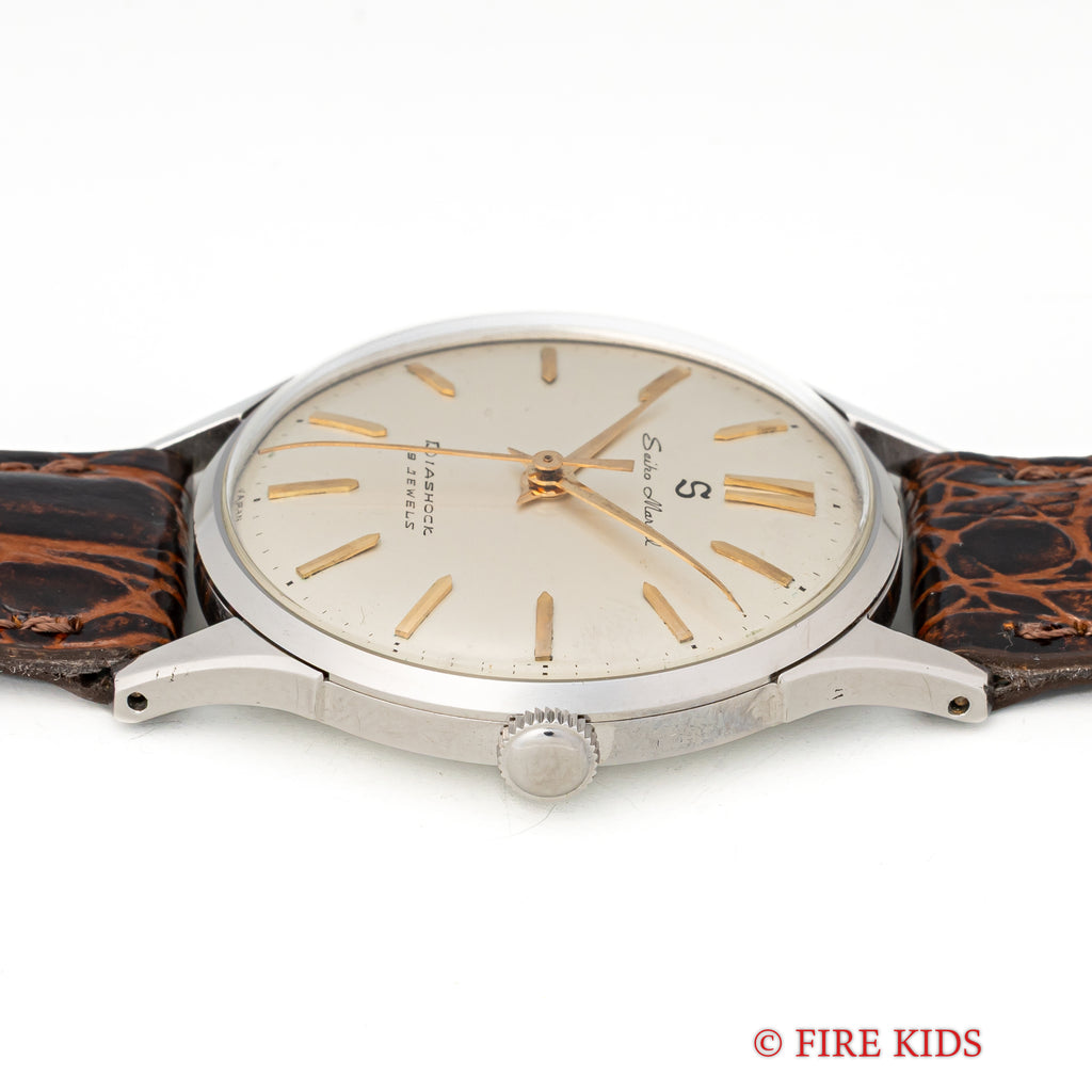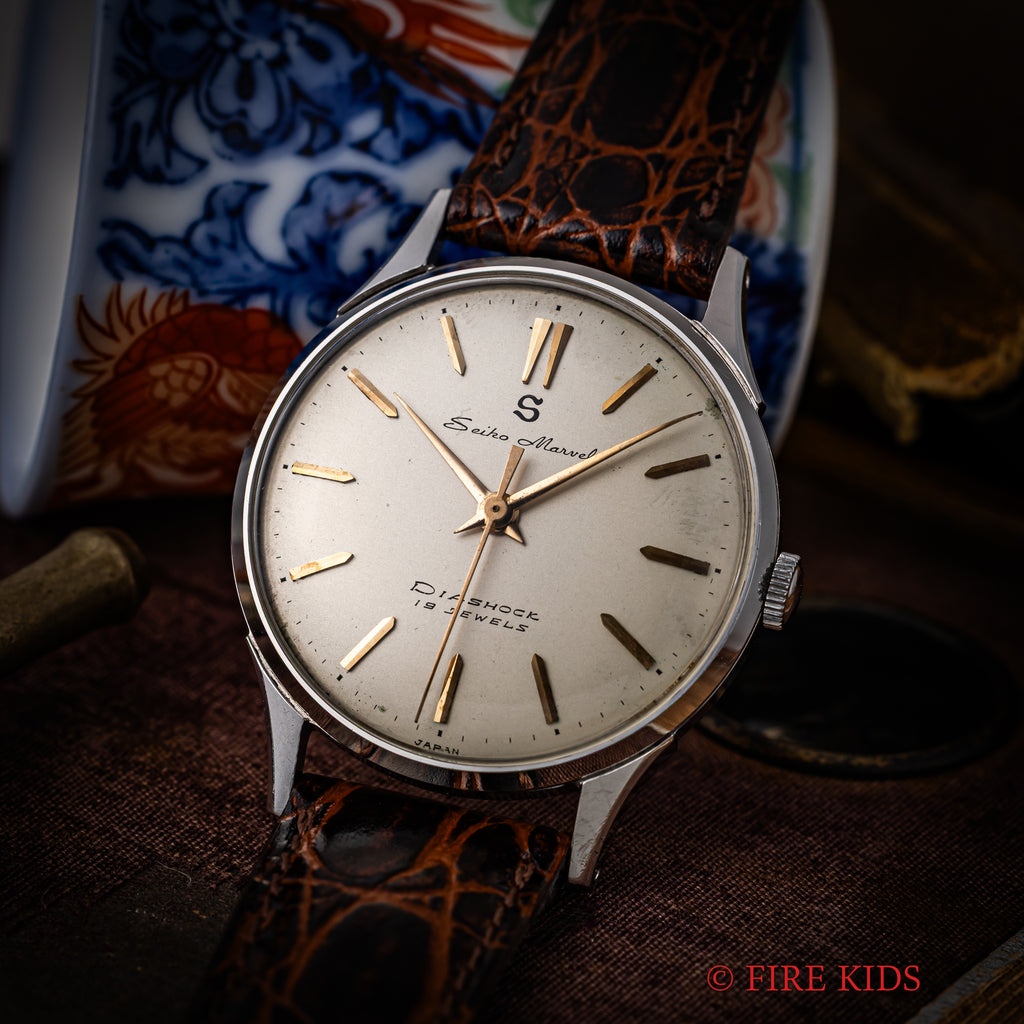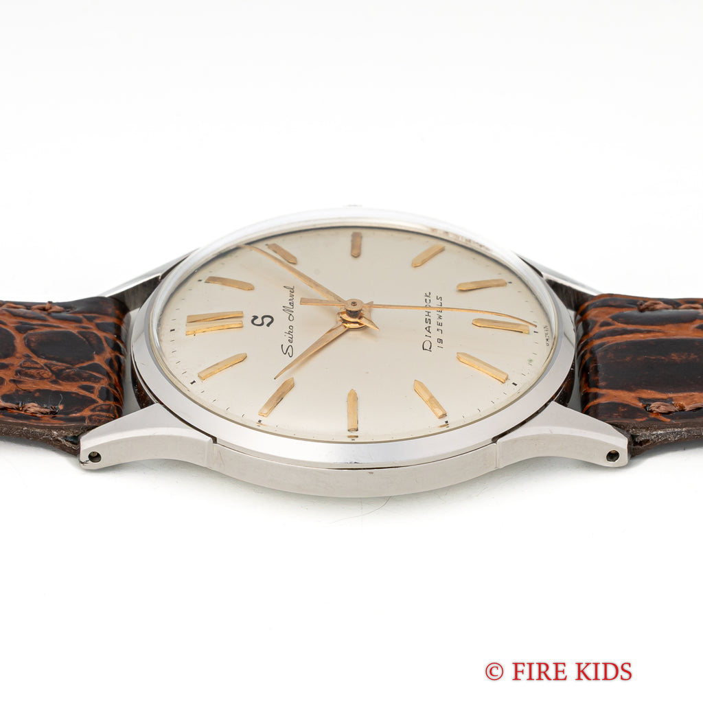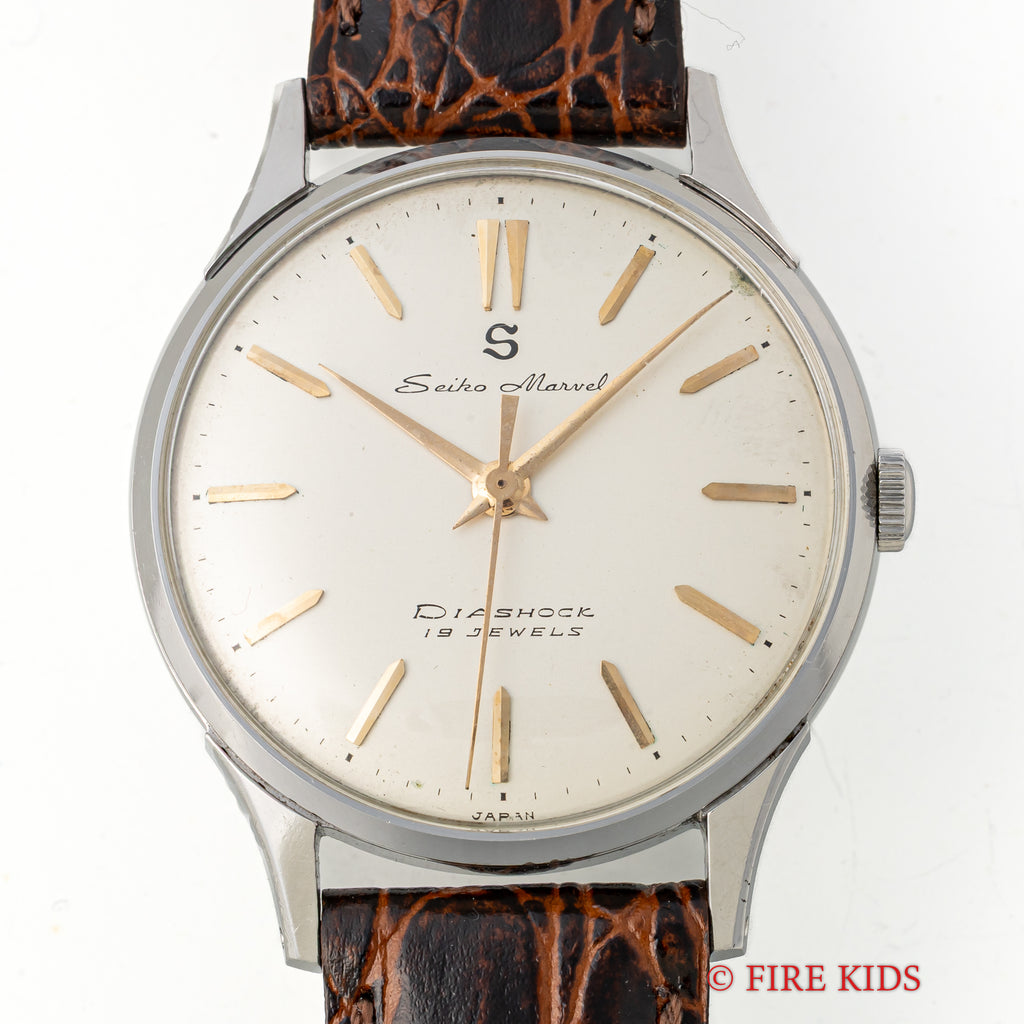 セイコー マーベル 1958年製 ステンレスケース 蛇S 19石手巻の入荷になります。こちらは12時にSマークがあるセイコーマーベルです。12時位置のSマークは通称「蛇S」と呼ばれており、プリントのSマークです。文字盤は若干のヤケ等ありますが良好なコンディションです。ケースはステンレス製でしっかりとエッジが立った良い状態です。手巻きや針回しはスムースです。革ベルトは社外新品を装着しております。