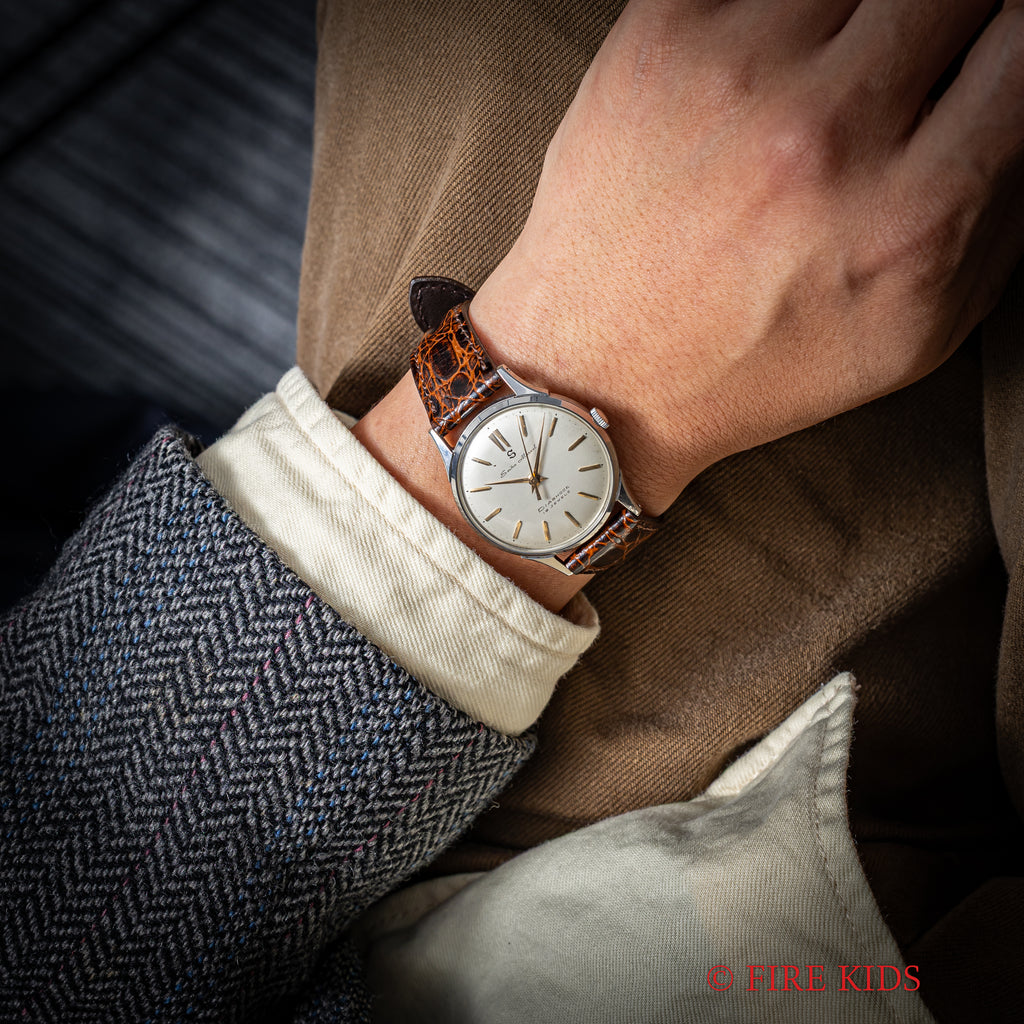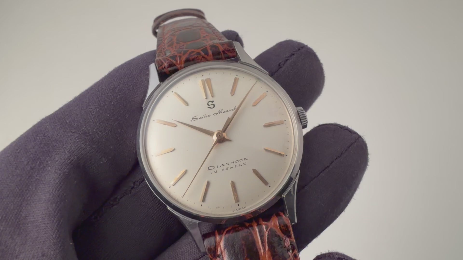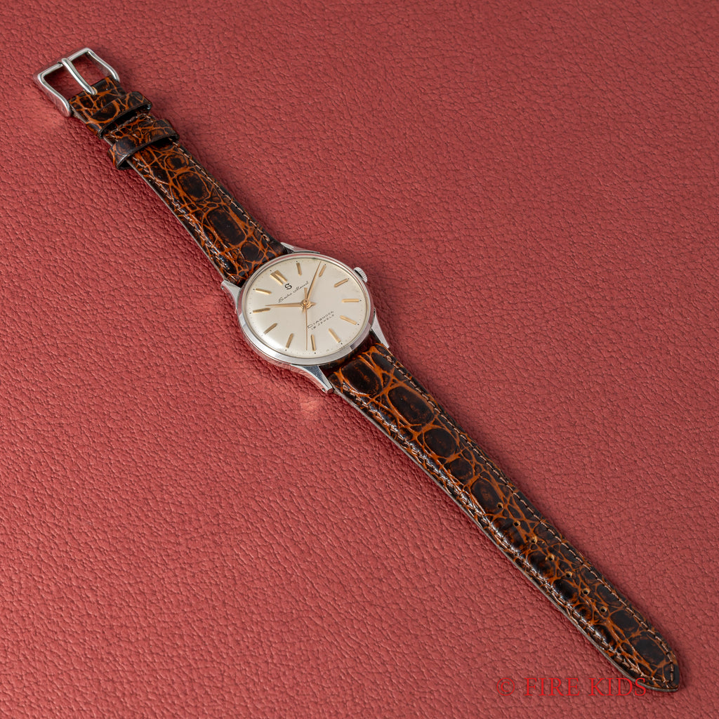 セイコー マーベル 1958年製 ステンレスケース 蛇S 19石手巻の入荷になります。こちらは12時にSマークがあるセイコーマーベルです。12時位置のSマークは通称「蛇S」と呼ばれており、プリントのSマークです。文字盤は若干のヤケ等ありますが良好なコンディションです。ケースはステンレス製でしっかりとエッジが立った良い状態です。手巻きや針回しはスムースです。革ベルトは社外新品を装着しております。
