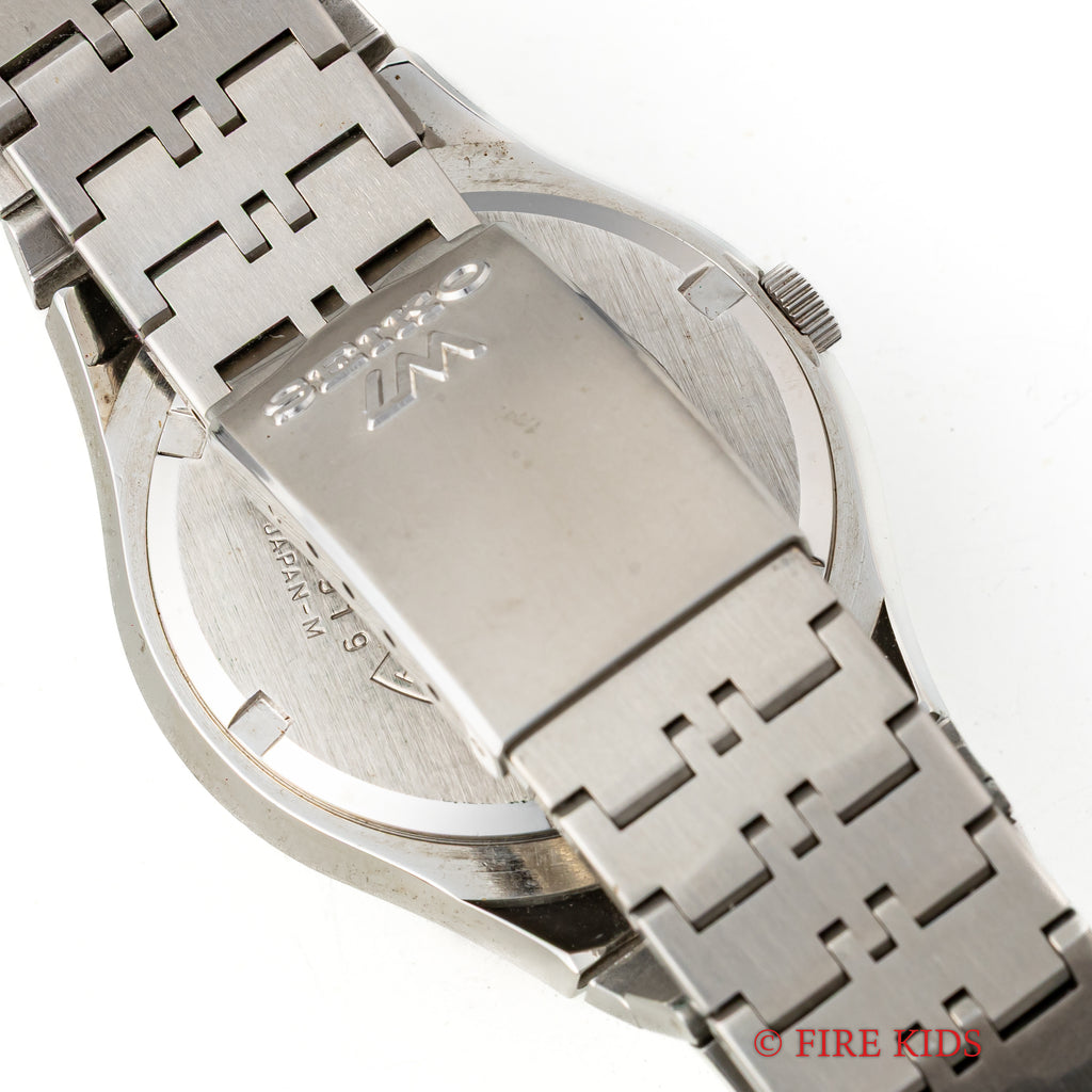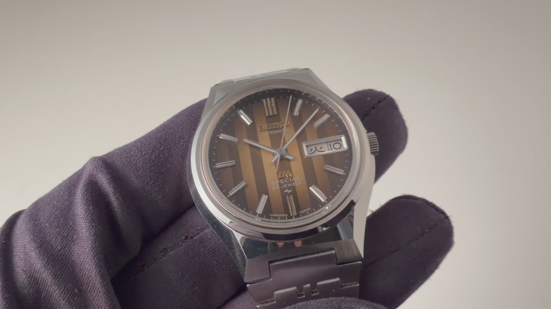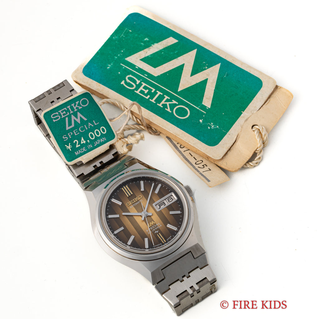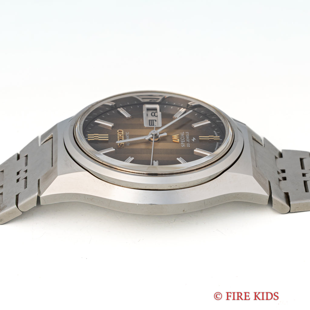 セイコーのロードマチックスペシャル1973年製です。ロードマチックはセイコーマチックのハイグレードモデルで23石の自動巻きムーブメントを搭載しています。1970年代らしい自由なデザインで、ブラウンのストライプが印象的な1本です。ストライプ柄は単に模様が付けてあるわけではなく、縦のヘアラインと横のヘアラインが交互に配置されているため、角度を変えるたびに表情が変わる個性的な文字盤となっております。ケースは小傷がありますが角がしっかりと立っている状態です。ブレスはLM用のオリジナルステンレスブレスが取り付けています。