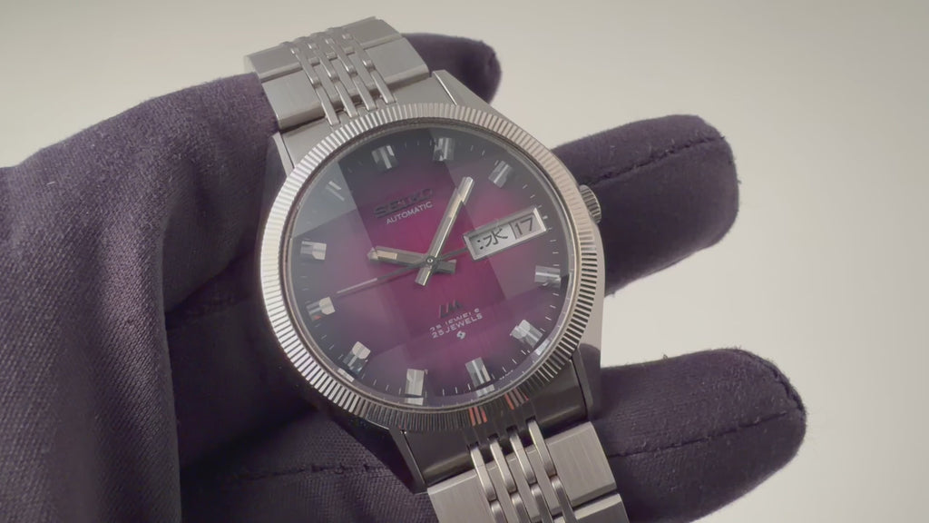 セイコー ロードマチック Ref.5606-7330 1974年製 カットガラス パープルダイヤルです。当時グランドセイコー、キングセイコーに次ぐ上位機種として若者やサラリーマン向けに登場したロードマチック。70年代らしいパープルグラデーションダイヤルとコインエッジベゼルで上品に仕上げられており、カットガラスで華やかさがプラスされています。ラグ形状は単に真っすぐ伸びているのではなく、内側にカットが施されており全体を調和させています。使用感はあまりない美品です。純正ブレス付きです。タグ付きです。