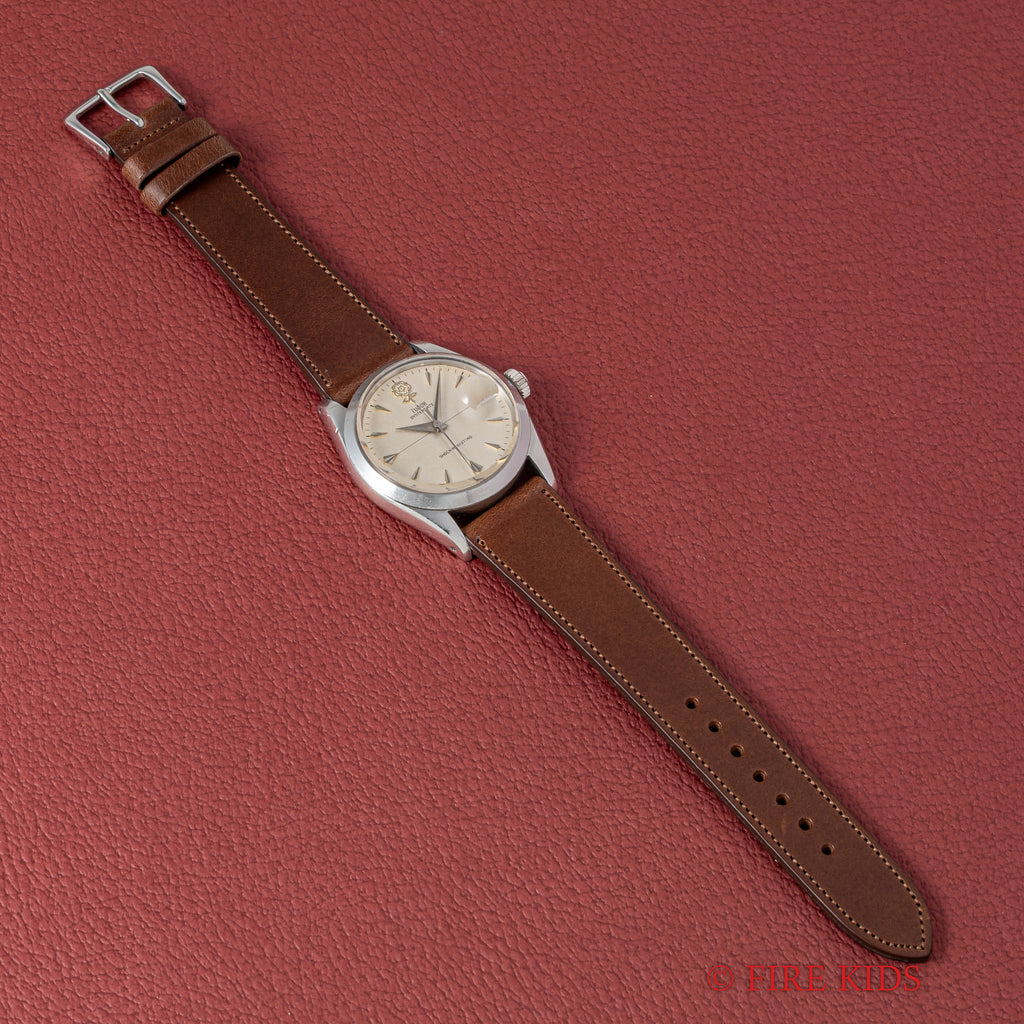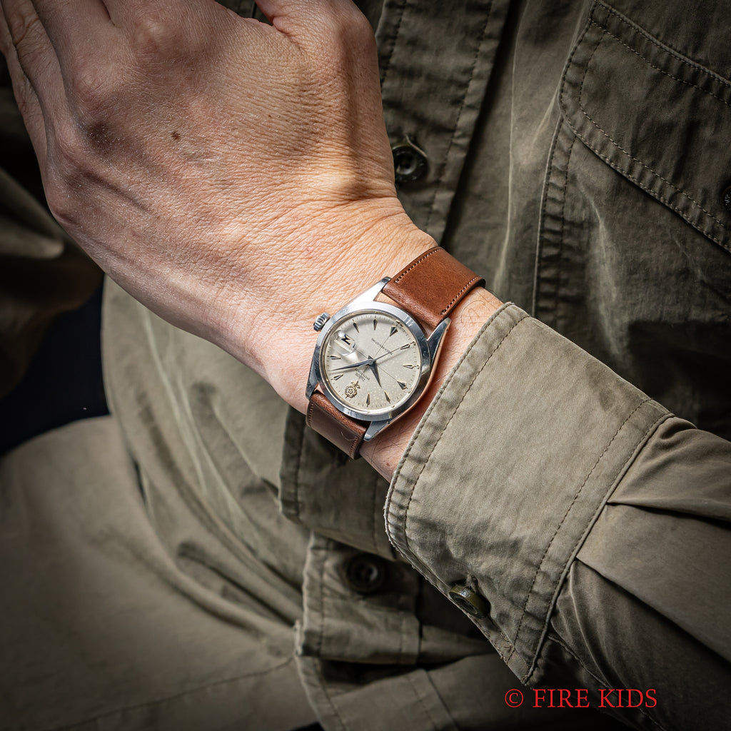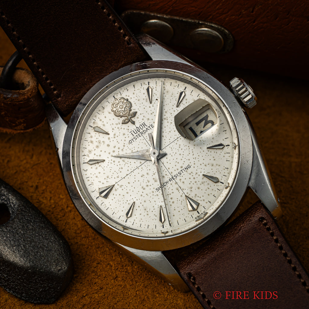 チューダー デカバラ クロスライン オイスターデイト 1960年製(昭和35年製)手巻 王冠リューズの入荷になります。ヴィンテージチューダーの中でも特に人気のデカバラ(ビッグローズ)の文字盤は、全体が経年変化したヴィンテージらしい良い雰囲気です。ケースは小傷はありますが大きなダメージはありません。手巻きのムーブメントも巻き上げもスムーズです。ベルトはファイアーキッズオリジナルイタリアンレザーのブッテーロ(裏面ラバー)が取り付けられています。