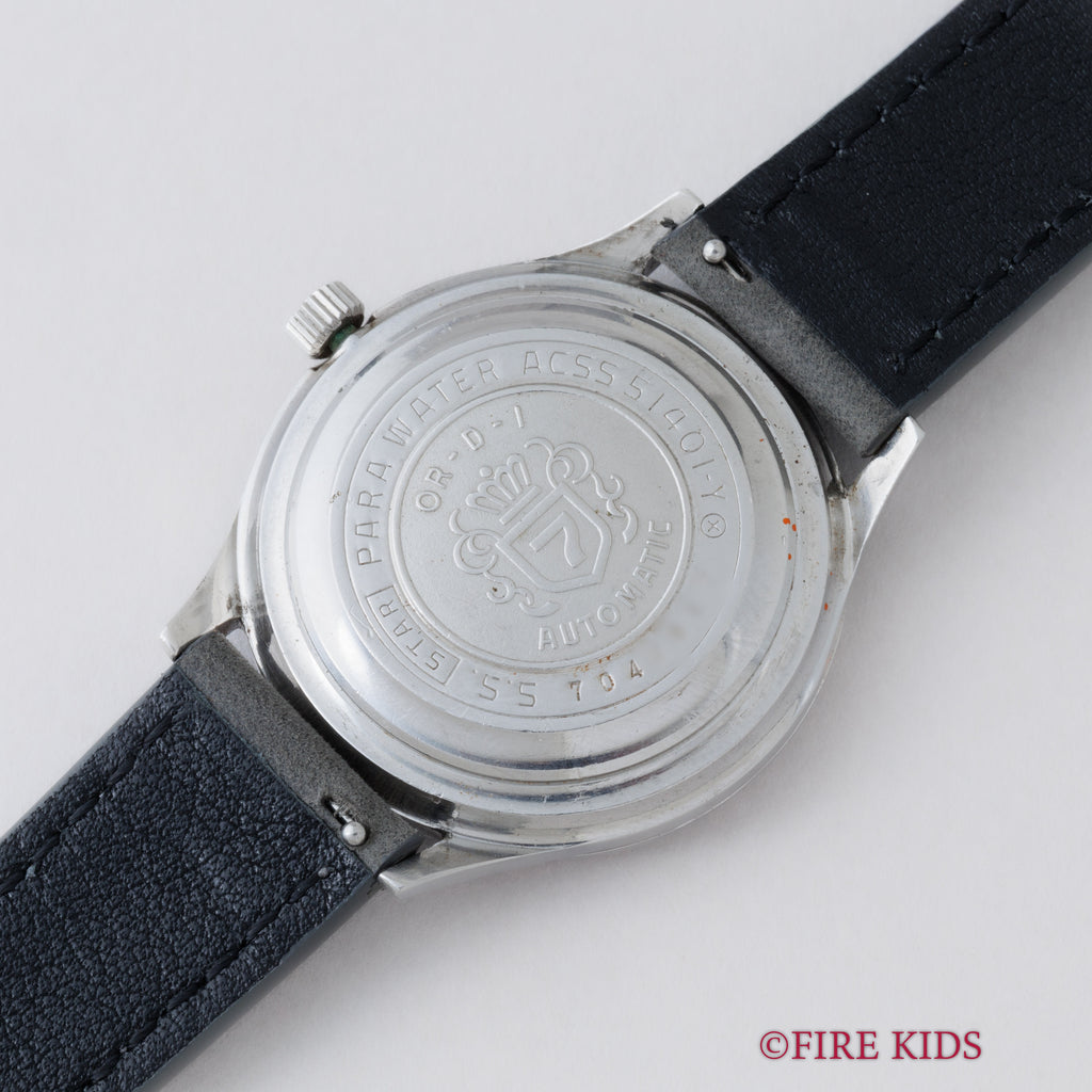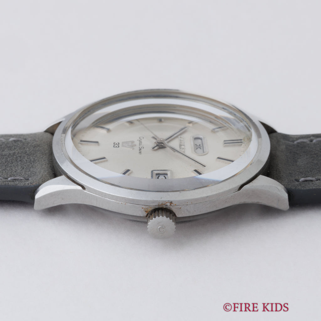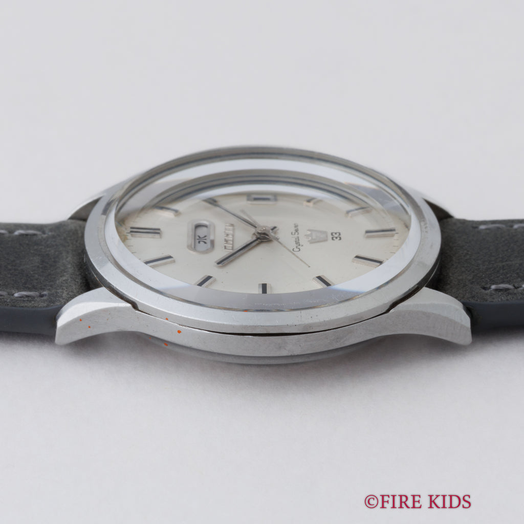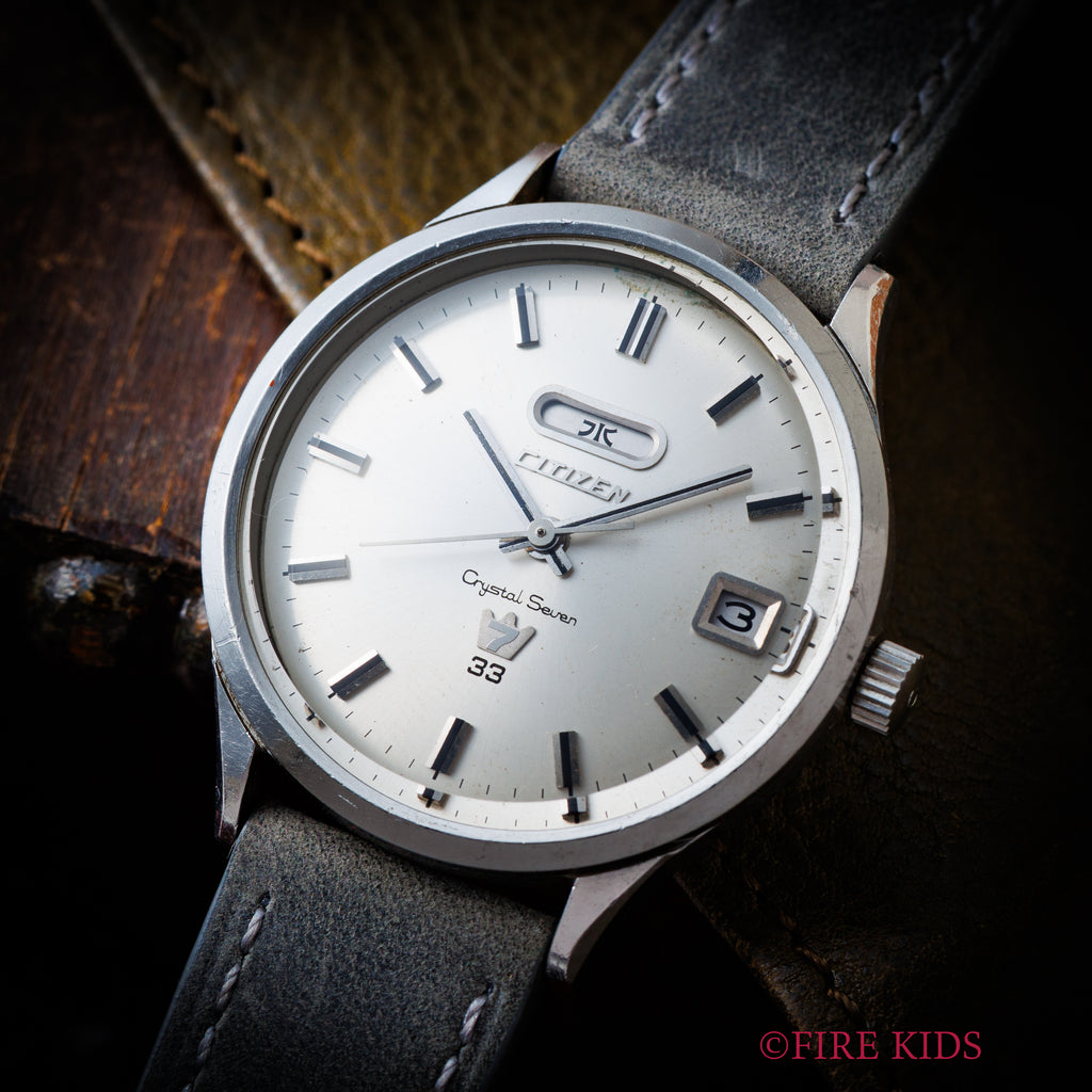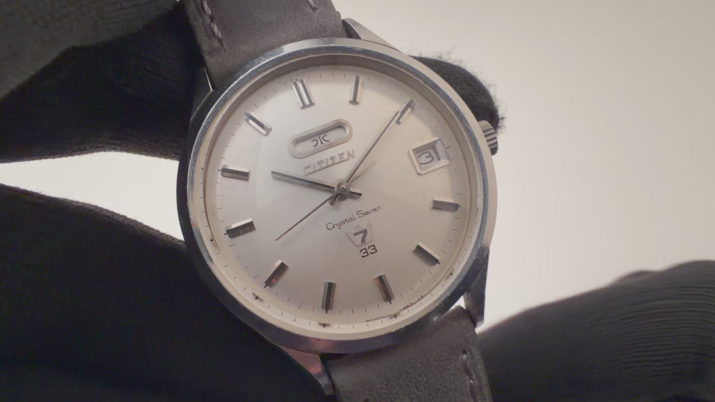 シチズン クリスタルセブン 1967年製 33石 Ref.51401-Y 自動巻き デイデイトです。国産初のクリスタルガラス(特殊強化処理を施した無機ガラス)を採用したことが、名称の「クリスタル」の由来です。文字盤に7曜日の表示機能があったことが、「セブン」の由来となっています。33石とハイグレードな一本です。文字盤、ケースは年代なりの経年や小傷はありますが大きなダメージはありません。ベルトは社外の革ベルトを合わせています。