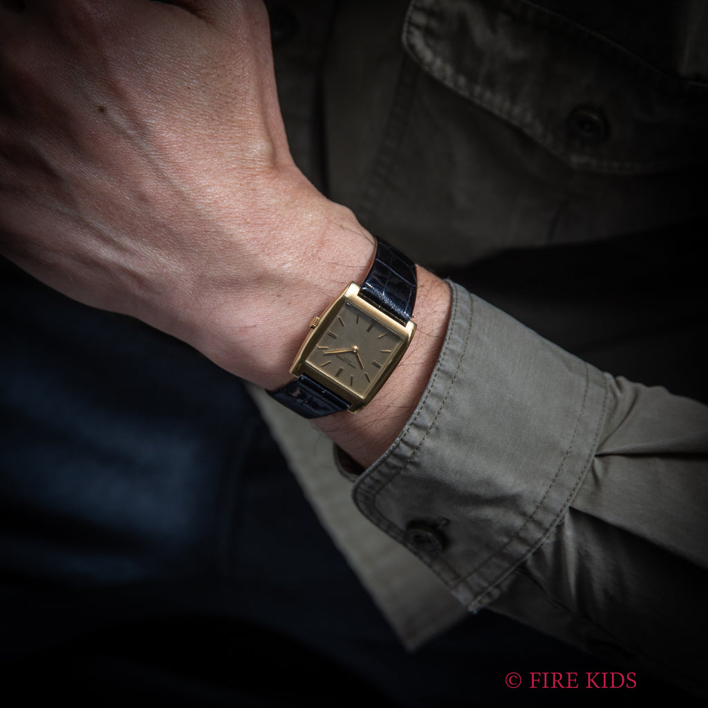 ヴァシュロン・コンスタンタン 18金無垢スクエアケース エクストラフラット 1970年代前半製 手巻 Cal.K1001/2 純正金無垢尾錠の入荷になります。珍しい角型ケースで薄型のドレスウォッチです。シンプルなデザインだからこそ造りの良さが感じられます。ムーブメントはジュネーブシールの入ったジャガー・ルクルトベースのCal.K1001/2を搭載しています。ベルトは社外のクロコダイル革ベルトに純正金無垢尾錠が取り付けられています。