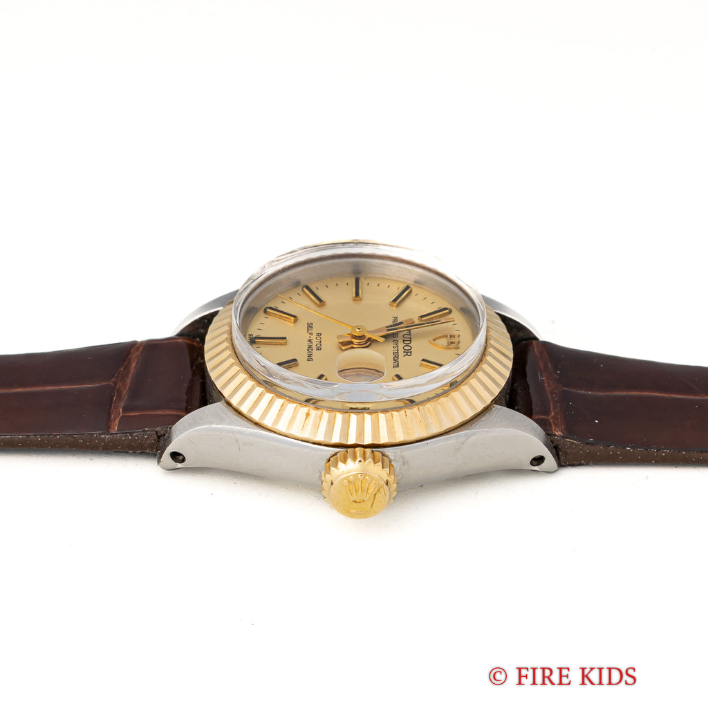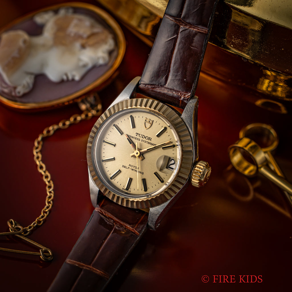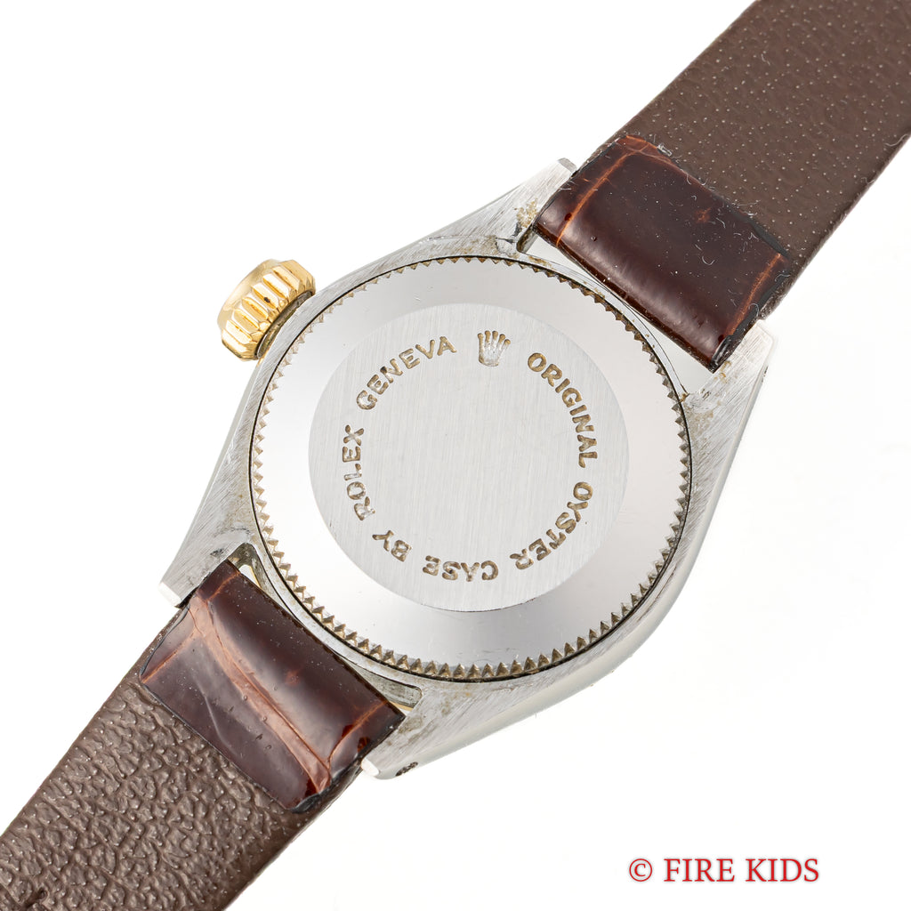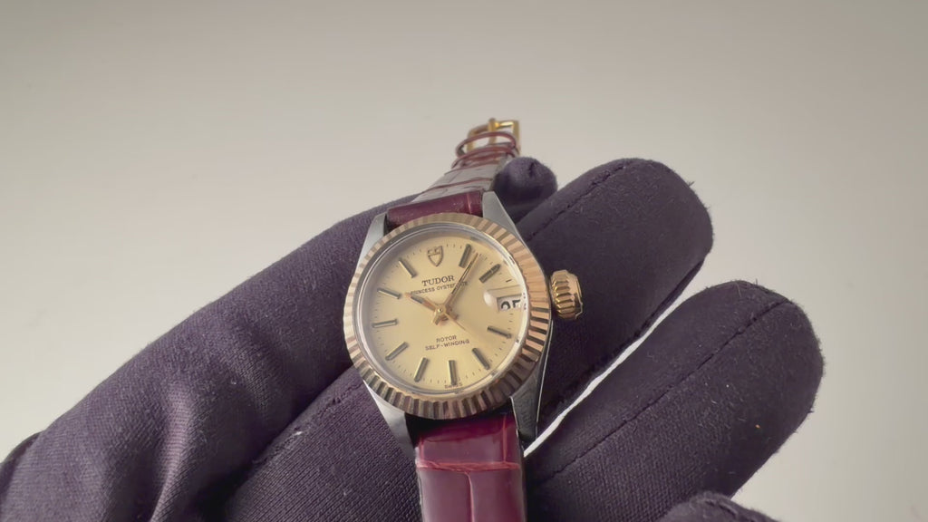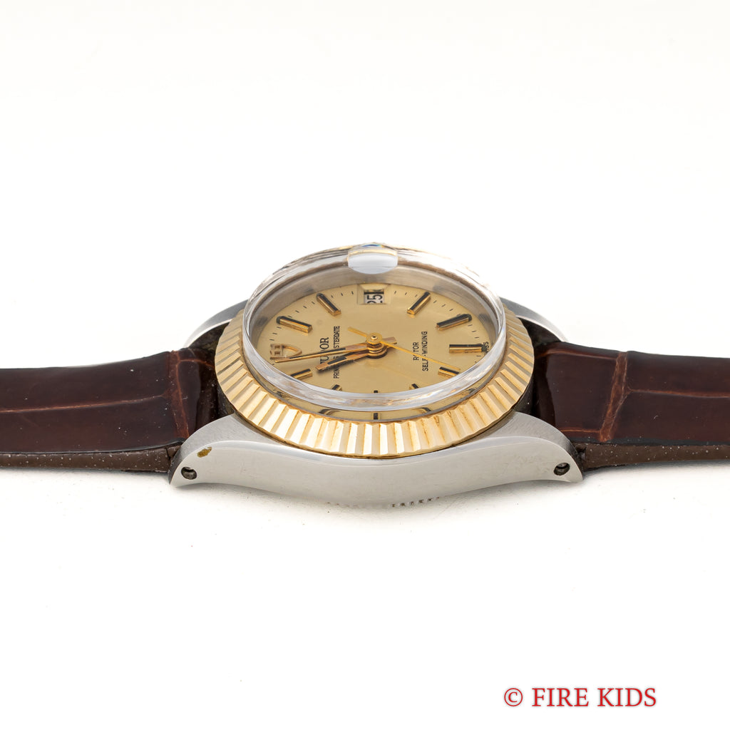 チューダー 1969年製 プリンセスオイスターデイト コンビ Ref.7592/3 自動巻き 王冠リューズです。可愛らしいレディースサイズのコンビモデルです。まだロレックスのパーツをそのまま使っていた時代で王冠リューズになっています。裏蓋にはOYSTER CASE BY ROLEXの刻印があります。大きなダメージもなく良好なコンディションを保っています。ベルトは社外の革ベルトが付いています。