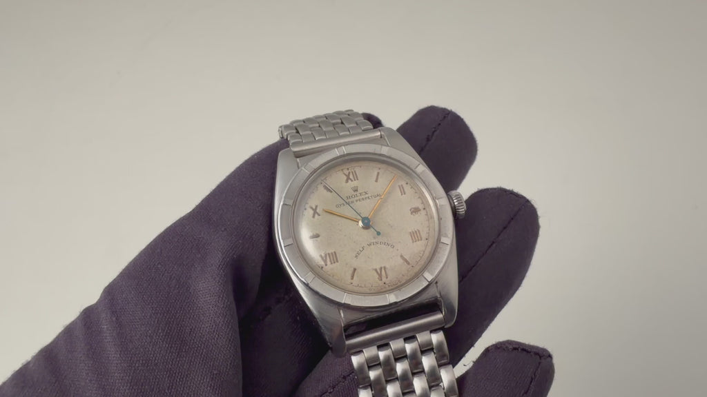 ロレックス バブルバック 1949年製 Ref.6015 自動巻 エンジンターンドベゼル 飛びローマンダイヤル 社外ライスブレスの入荷になります。バブルバックでもエンジンターンドベゼルはひと回り大きく感じられます。オリジナルの飛びローマンダイヤルは全体的に経年で変色して良い雰囲気になっています。インデックスと長短針が金色で秒針はブルースチールになっています。ケースは小傷が見られますが大きなダメージはありません。手巻きや針回しの操作はスムースです。ベルトは社外のライスブレスが取り付けられています。