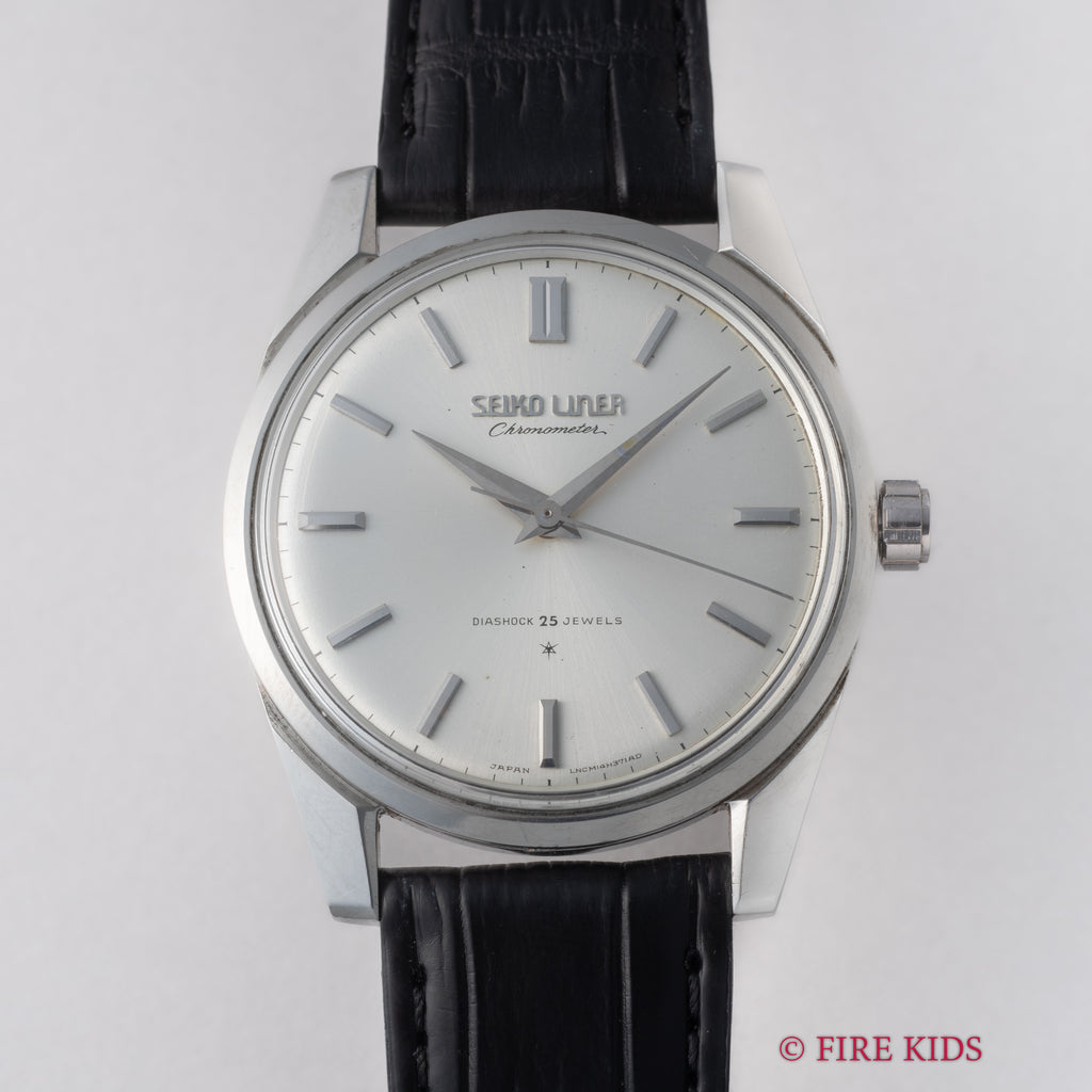 セイコー ライナー クロノメーター 1963年製 Ref.46999 ライオンメダリオン 薄型手巻の入荷になります。製造期間1年足らずと言われる希少モデルで薄型高精度が特徴です。裏蓋には初期のグランドセイコー同様のライオンメダリオンが入っています。ケースは小傷が見られますが大きなダメージはありません。文字盤は外周にダメージがありますが、雰囲気を損なうようなものではありません。ムーブメントは金メッキが施された特別感のあるCal.460を搭載。ベルトはファイアーキッズオリジナルのクロコダイル革ベルトが取り付けられています。