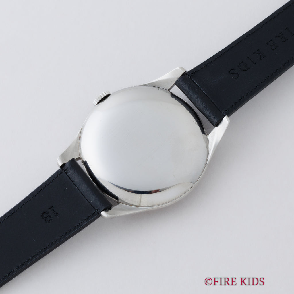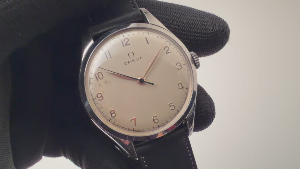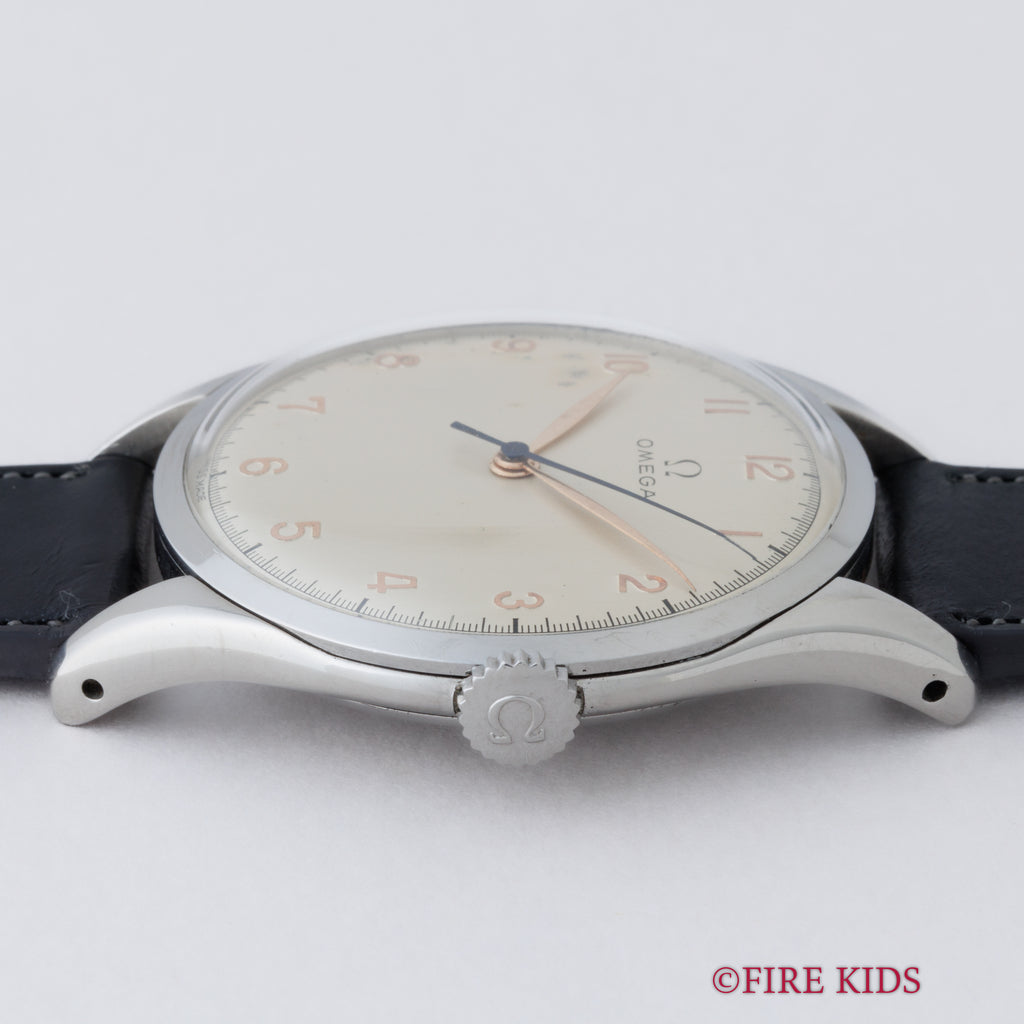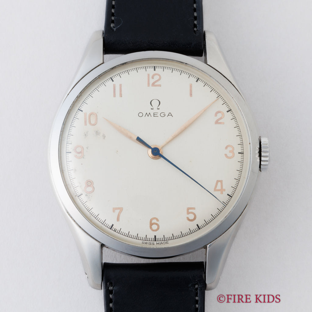 オメガ 30mmキャリバー 37㎜ビックケース 1947年製 手巻 Cal.30T2SC アラビアダイヤルの入荷になります。約37㎜(リューズ別)サイズの存在感抜群の30㎜キャリバー搭載モデルです。全アラビアダイヤルで金色のインデックス、長短針、ブルースチール秒針とヴィンテージらしい良い雰囲気になっています。文字盤表面に劣化が見られますが全体的には綺麗です。ケースは小傷が見られますが大きなダメージはありません。ムーブメントは30㎜キャリバーのセンターセコンド仕様Cal.30T2SCを搭載しています。ベルトはファイアーキッズオリジナル、イタリアンレザーのブッテーロ(裏面ラバー)が取り付けられています。