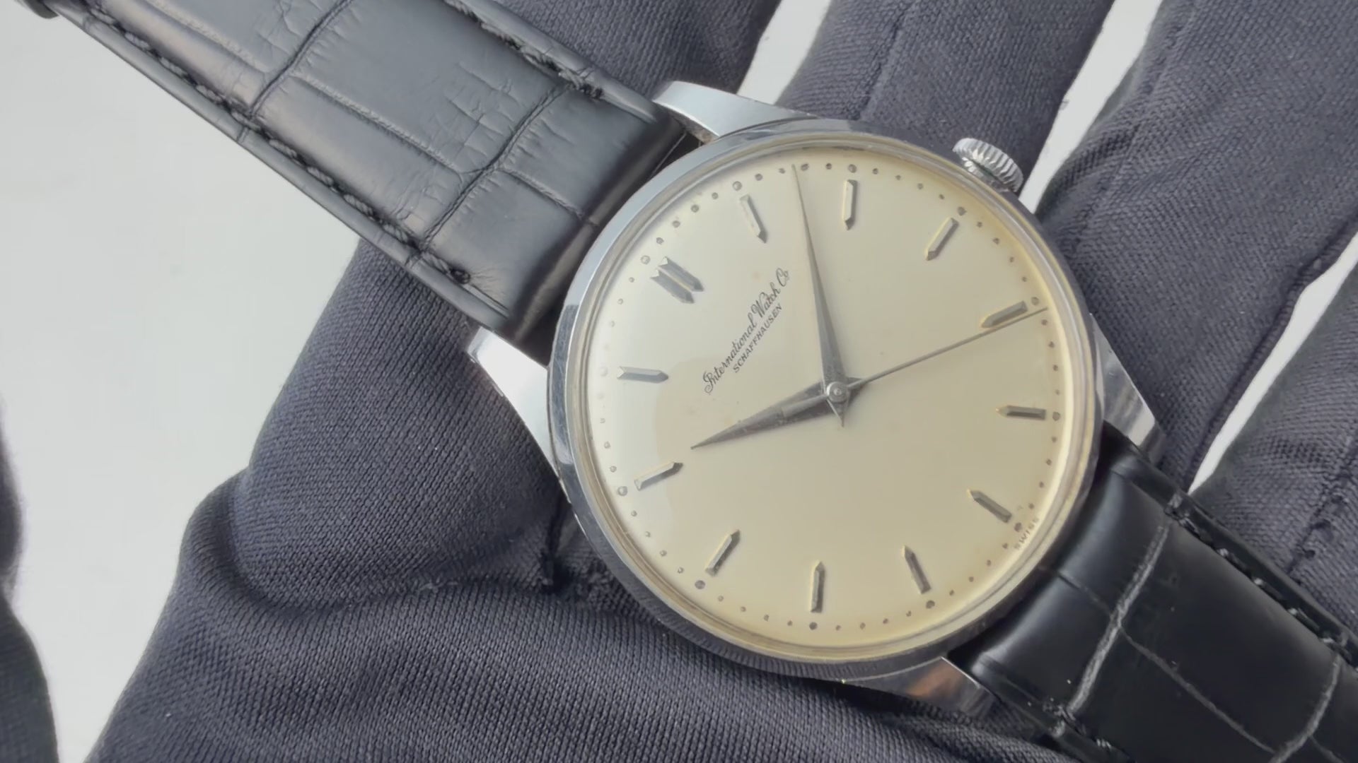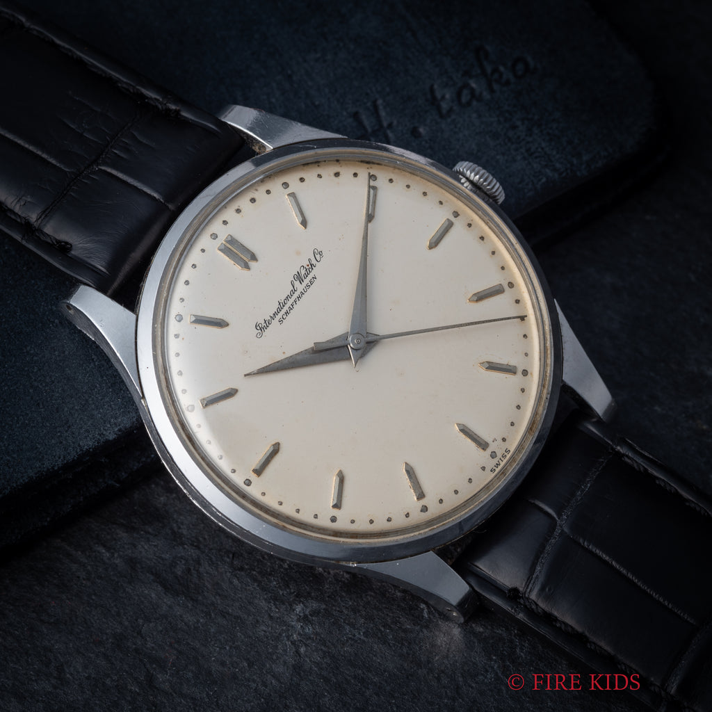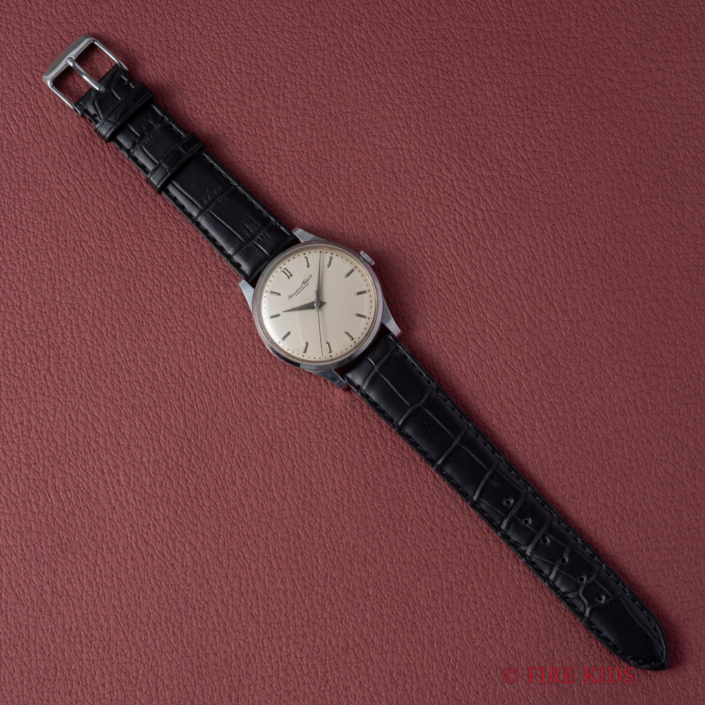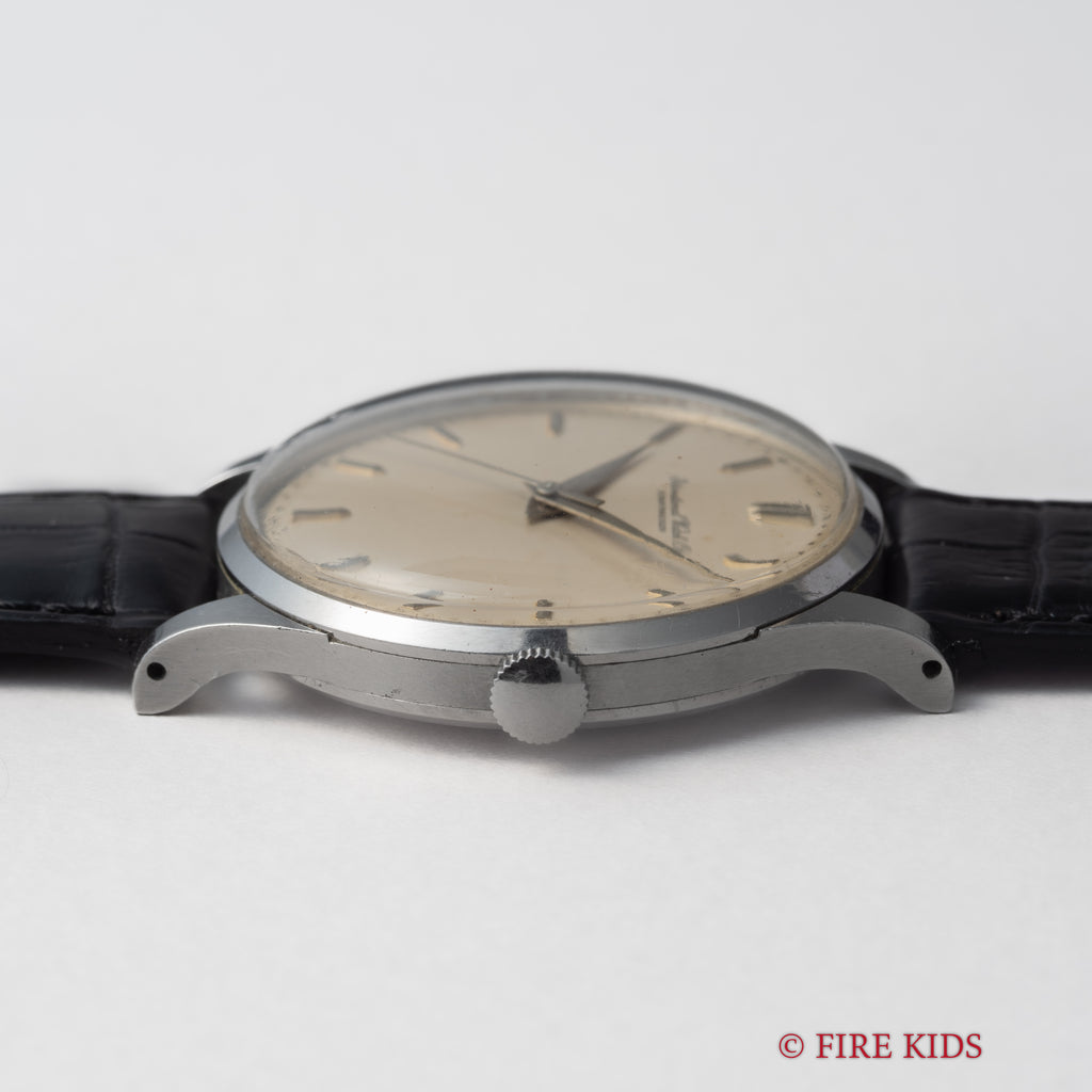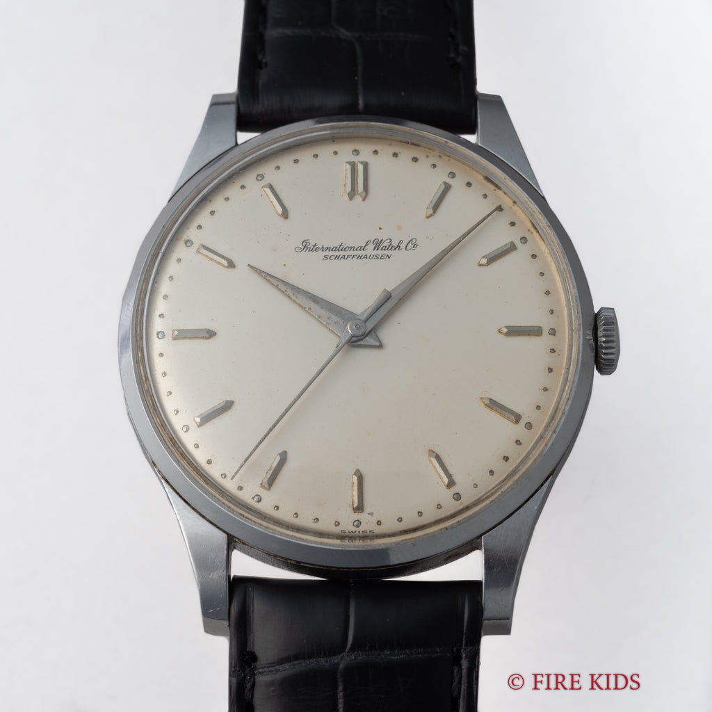 インターナショナルウォッチカンパニー1962年製 ラウンド手巻モデルです。搭載キャリバーはマークⅪに採用されている事でも有名な手巻きの名機Cal.89。ケースはシンプルなラウンド型で、IWCらしい質実剛健さを感じる一本です。文字盤は砲弾インデックス、パールドットの組み合わせに全体が経年変化したヴィンテージらしい雰囲気になっています。ケースは小傷はありますが大きなダメージはございません。手巻きや針回しの操作はスムーズです。ファイアーキッズオリジナルクロコダイル革ベルトを合わせています。