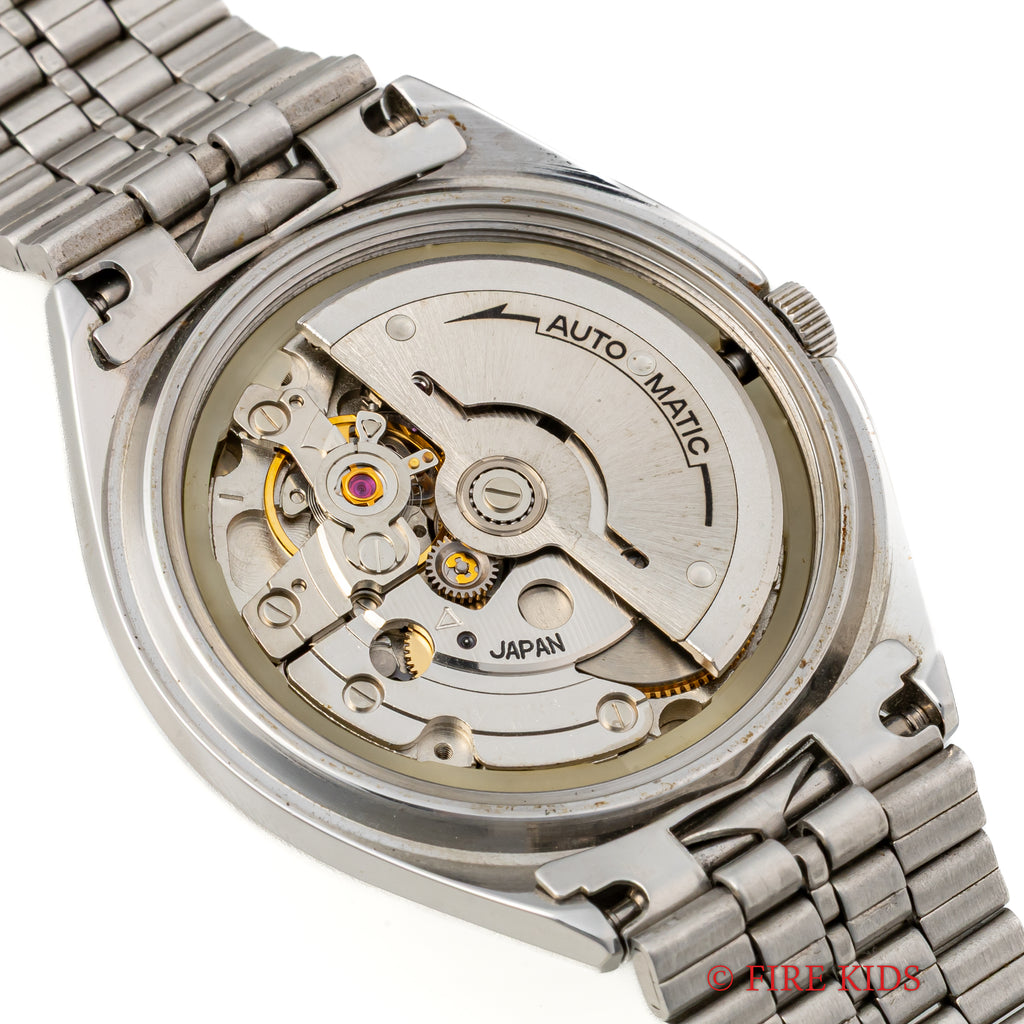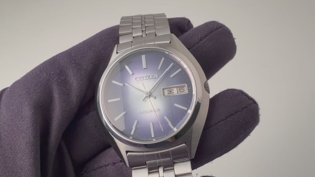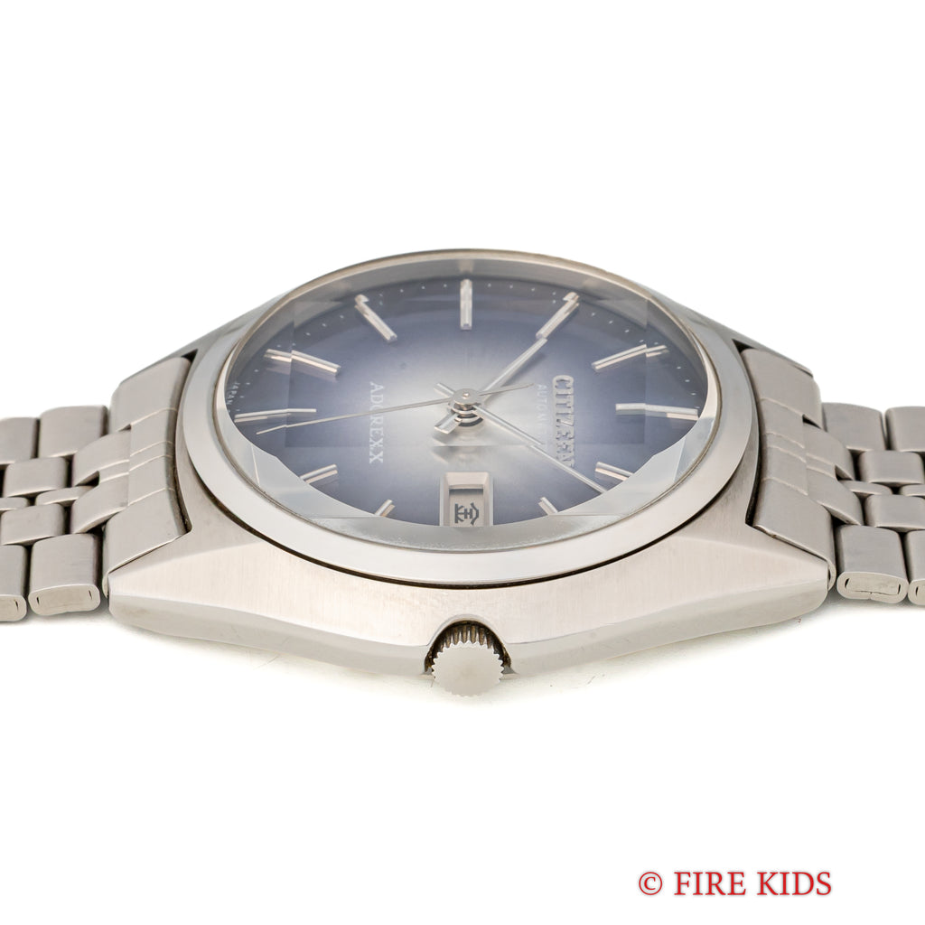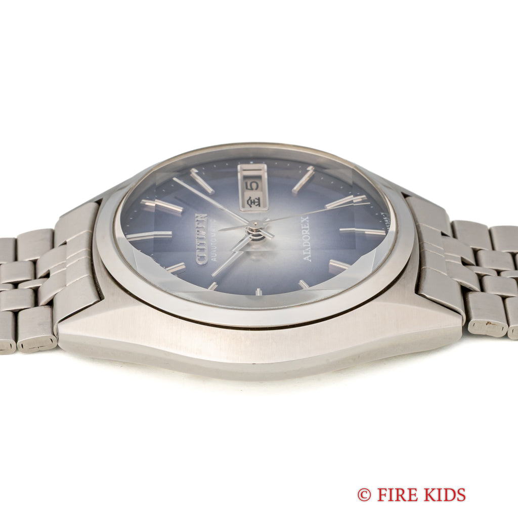 シチズン アドレックス Ref.4-385195TA 1975年製 ブルーグラデーションです。70年代らしいカットガラス、グラデーションダイヤルにデイデイト表示、自動巻きと実用性とユニークさを兼ね備えたモデルです。大きなダメージはなく良好なコンディションです。純正ブレス付きです。